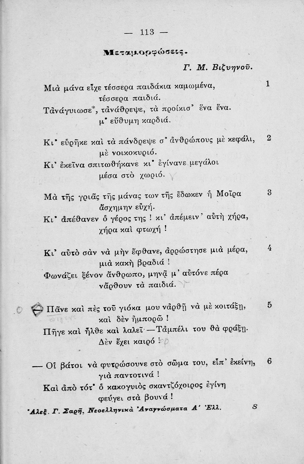 Σχολικό εγχειρίδιο Νέων Ελληνικών Γ' Ελληνικού Σχολείου και Α΄ Αστικού Σχολείου των Θηλέων που περιλαμβάνει ποιήματα και πεζά Ελλήνων συγγραφέων και δημοτικά τραγούδια εμπνευσμένα από την σύγχρονη ελληνική ...