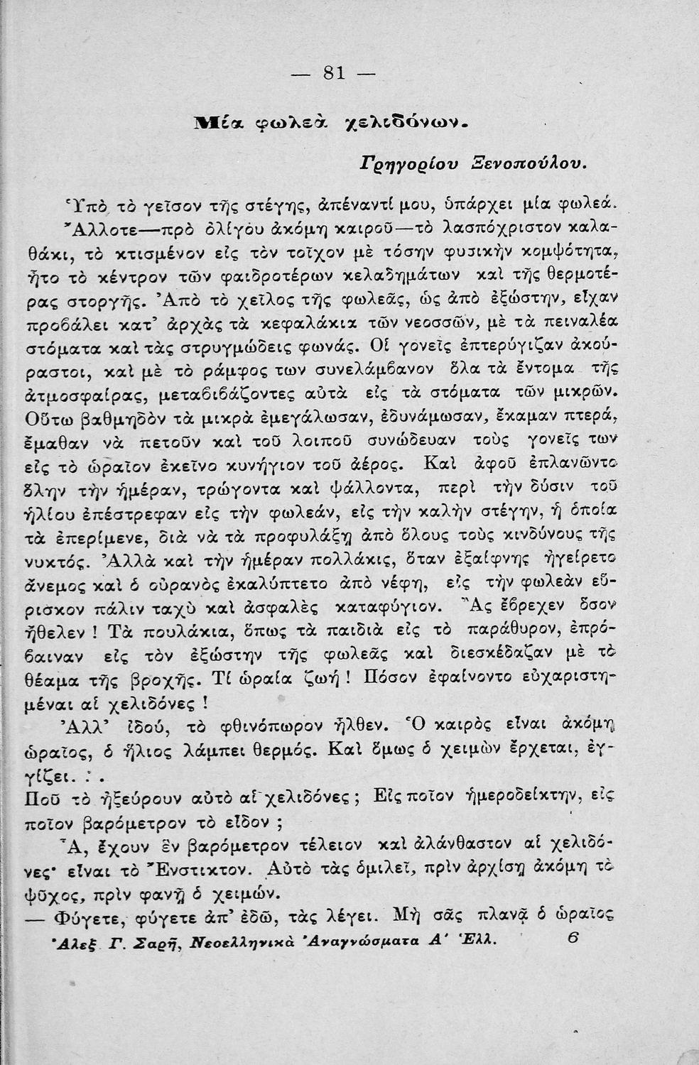 LDR 01476 2200205 4500 035 ## _a20-00142 040 ## _aΚΕΝΕΚ - Εταιρεία Σπουδών Νεοελληνικού Πολιτισμού και Παιδείας 041 ## _ael 100 ## _aΑλέξανδρος Γ. Σαρής 110 ## _a142 245 0# _aΝεοελληνικά αναγνώσματα διά τους μαθητάς της Α΄ τάξεως των Ελληνικών Σχολείων μετ'εικόνων και των προσωπογραφειών των συγγραφέων 260 ## _aΑθήνα _bΜιχαήλ Σ. Ζηκάκης _c1922 300 ## _a178 _bΣκίτσα (ασπρόμαυρα) _c20 520 ## _aΣχολικό εγχειρίδιο Νέων Ελληνικών που περιλαμβάνει ποιήματα και πεζά Ελλήνων συγγραφέων εμπνευσμένα από την ελληνική μυθολογία, την σύγχρονη ελληνική ιστορία και την καθημερινή ζωή. Περιέχει και παράρτημα με βιογραφίες των συγγραφέων και λεξιλόγιο. 521 ## _aΕλληνικό Σχολείο 522 ## _aΕλλάδα 546 ## _aΔημοτική, Καθαρεύουσα 563 ## _aΣκληρό Εξώφυλλο 583 ## _a16457/2-5-1920 _c1920 650 #4 _aΒιζυηνός _aΚαρκαβίτσας _aΜελάς _aΝιρβάνας _aΞενόπουλος _aΣολωμός
