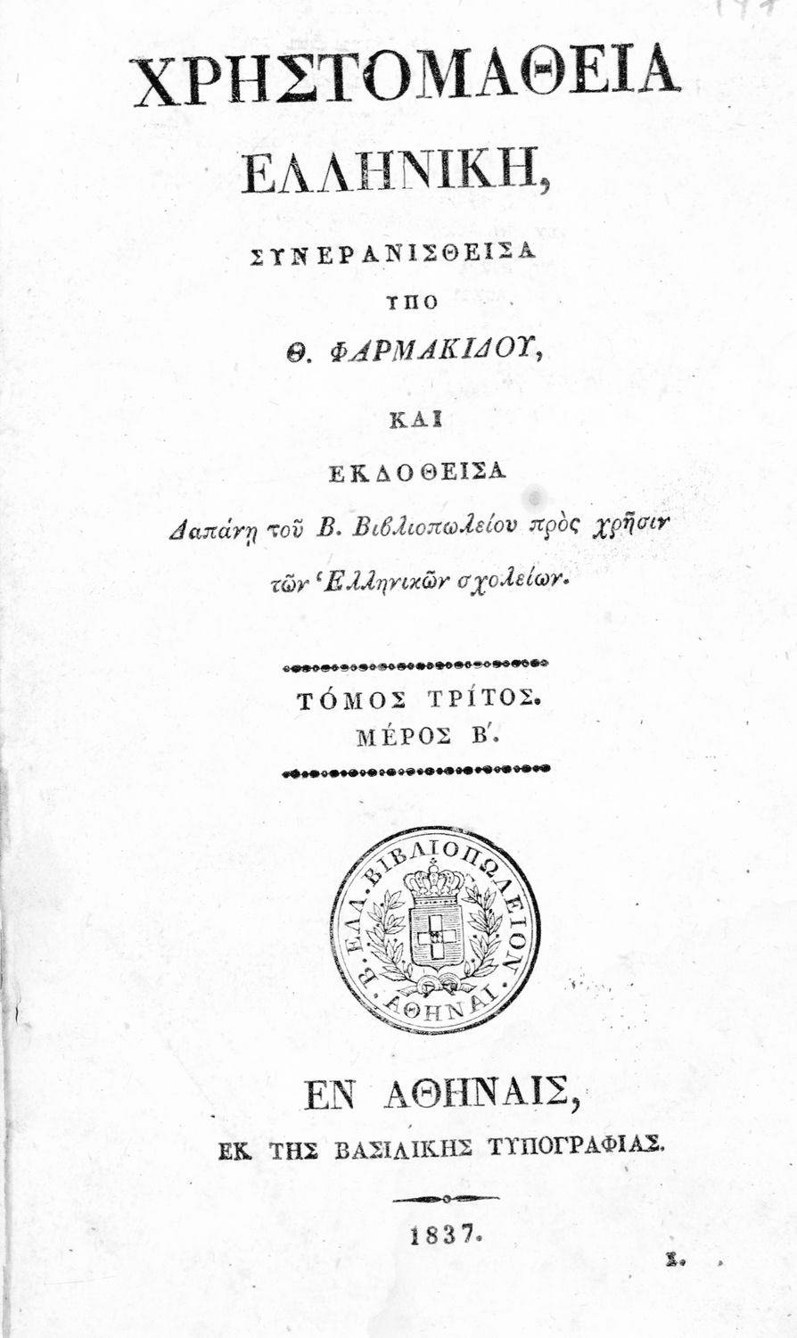 Τίτλος: Χρηστομάθεια ελληνική συνερανισθείσα υπό Θ. Φαρμακίδου και εκδοθείσα δαπάνη του βιβλιοπωλείου προς χρήσιν των Ελληνικών Σχολείων, τόμος Γ΄, μέρος Β΄