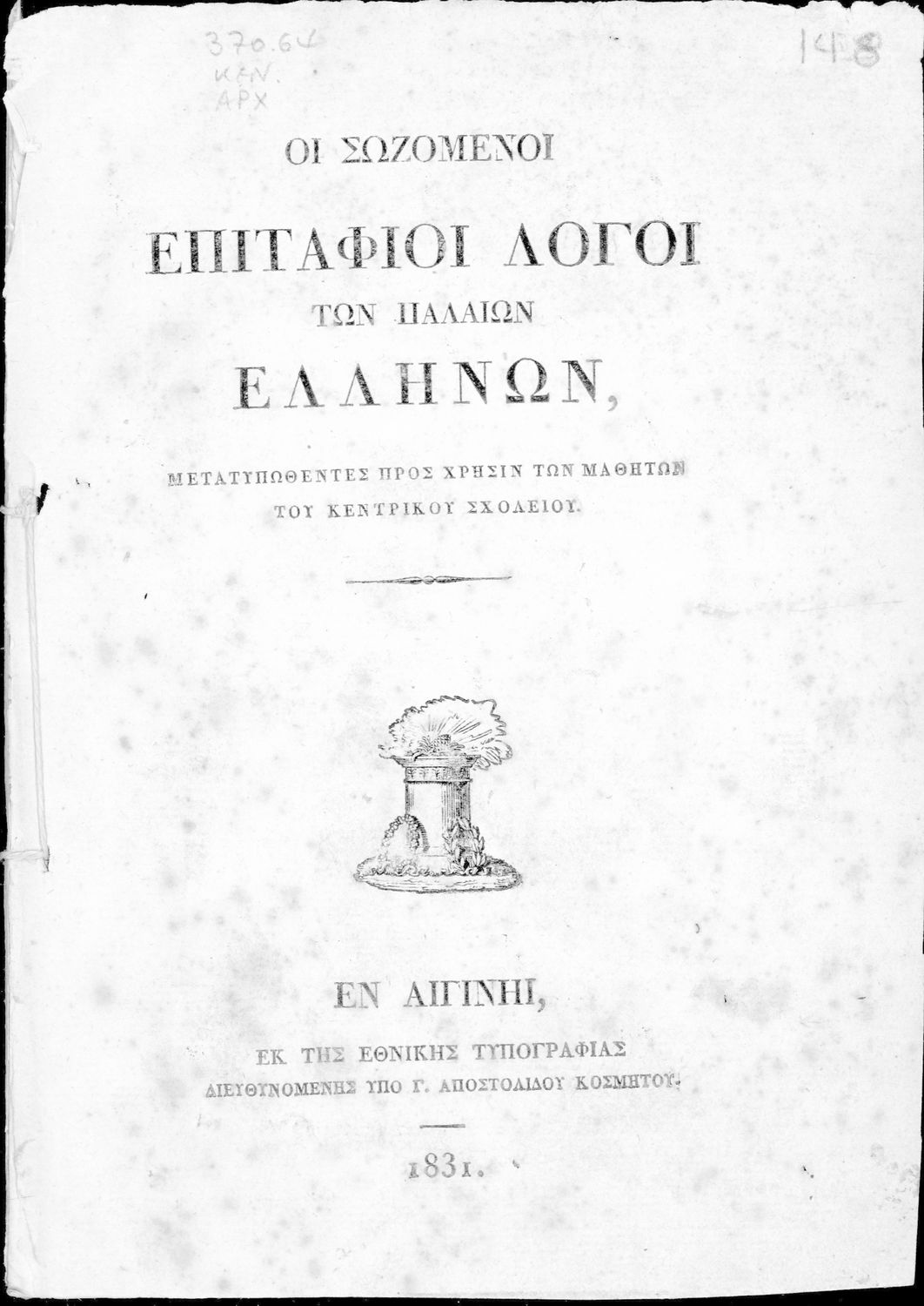 Κωδικός αναγνώρισης: 20-00148 Τίτλος: Οι σωζόμενοι επιτάφιοι λόγοι των παλαιών Ελλήνων, μετατυπωθέντες προς χρήσιν των μαθητών του Κεντρικού Σχολείου Μέγεθος και υπόστρωμα: Σχολικό εγχειρίδιο, 18εκ., μαλακό εξώφυλλο, 58 σελίδες. |