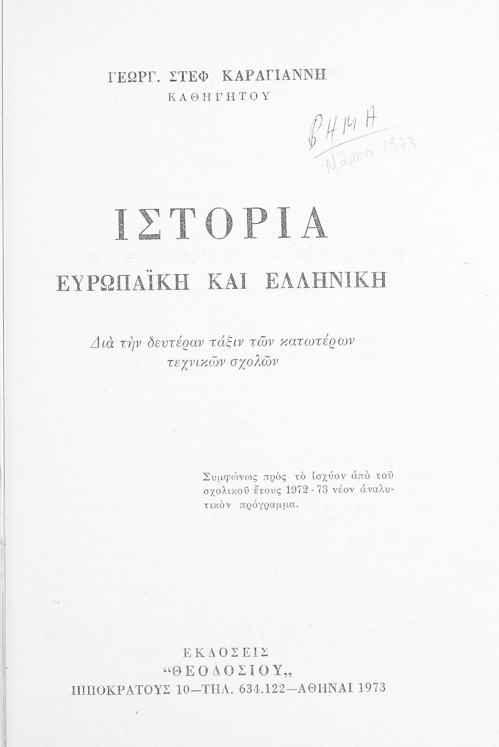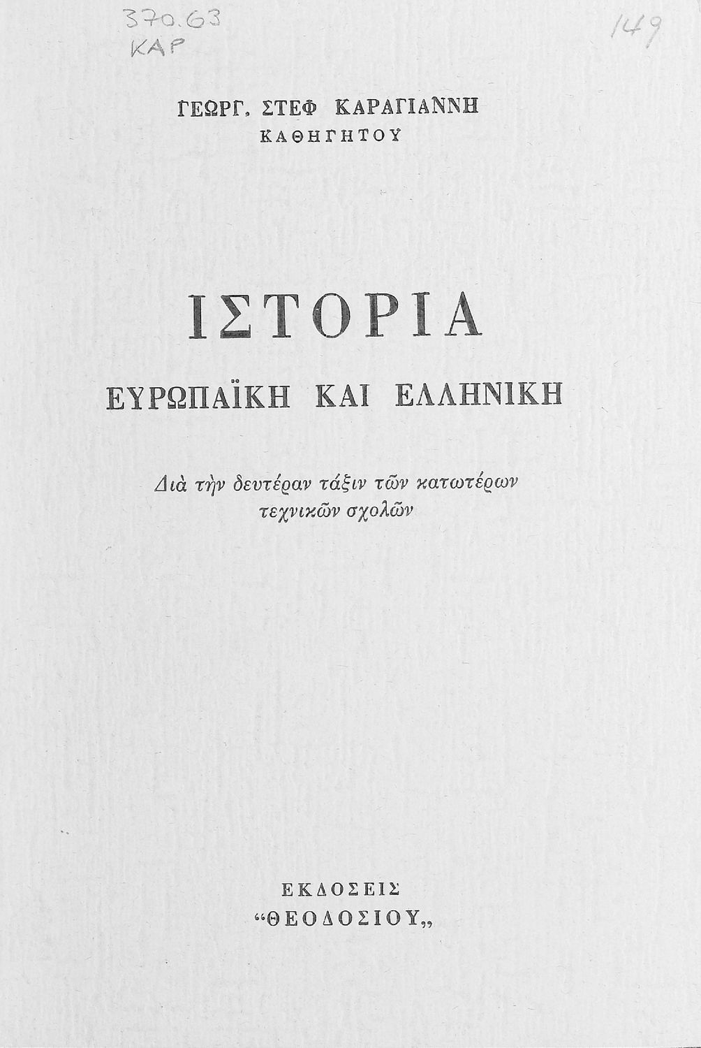 Σχολικό εγχειρίδιο για τις Κατώτερες Τεχνικές Σχολές που καλύπτει την περίοδο από την άλωση της Κωνσταντινούπολης ως τον Β΄ Παγκόσμιο Πόλεμο.