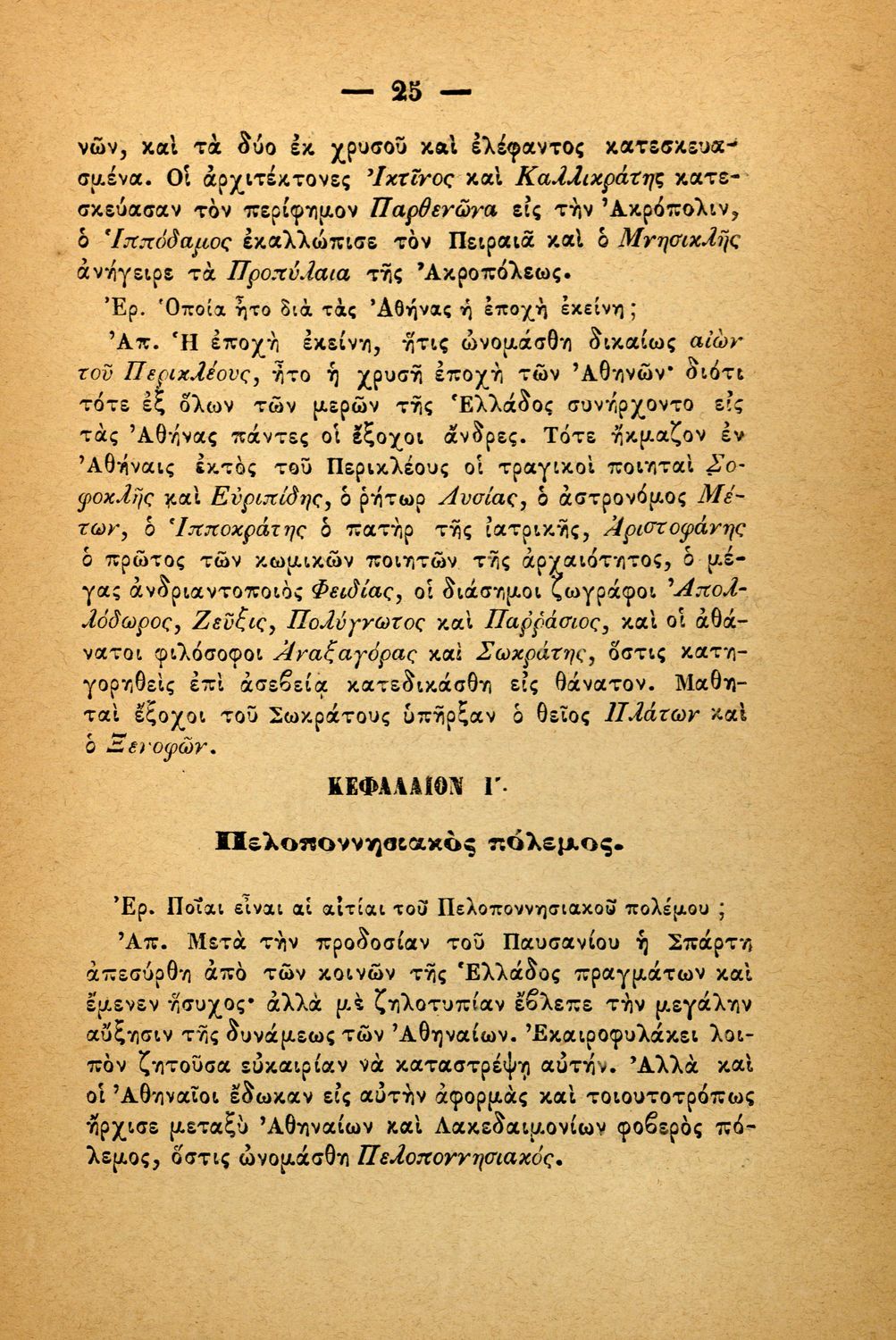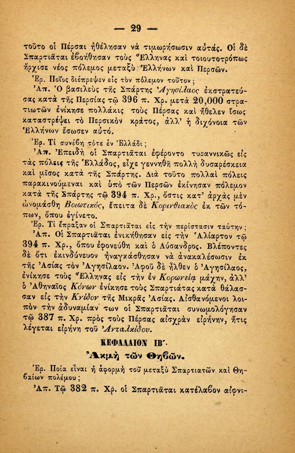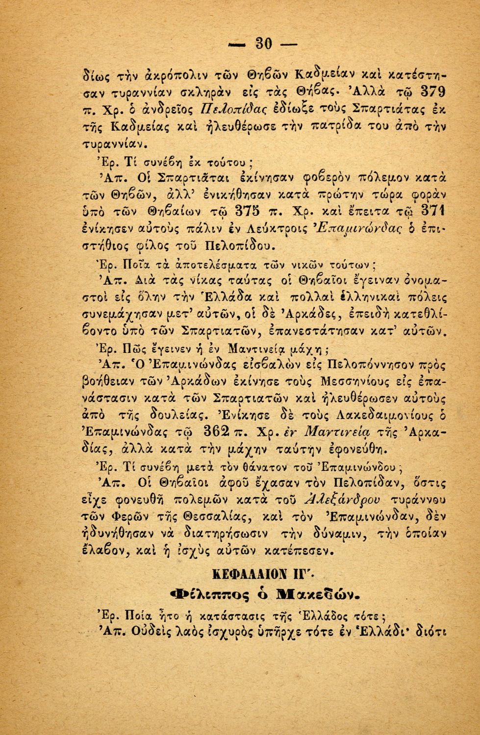 Σχολικό εγχειρίδιο Ιστορίας Α΄ Ελληνικού και Παρθεναγωγείου που καλύπτει την περίοδο από τους μυθικούς και ηρωικούς χρόνους μέχρι την μάχη της Μαντινείας και τον θάνατο του Επαμεινώνδα.