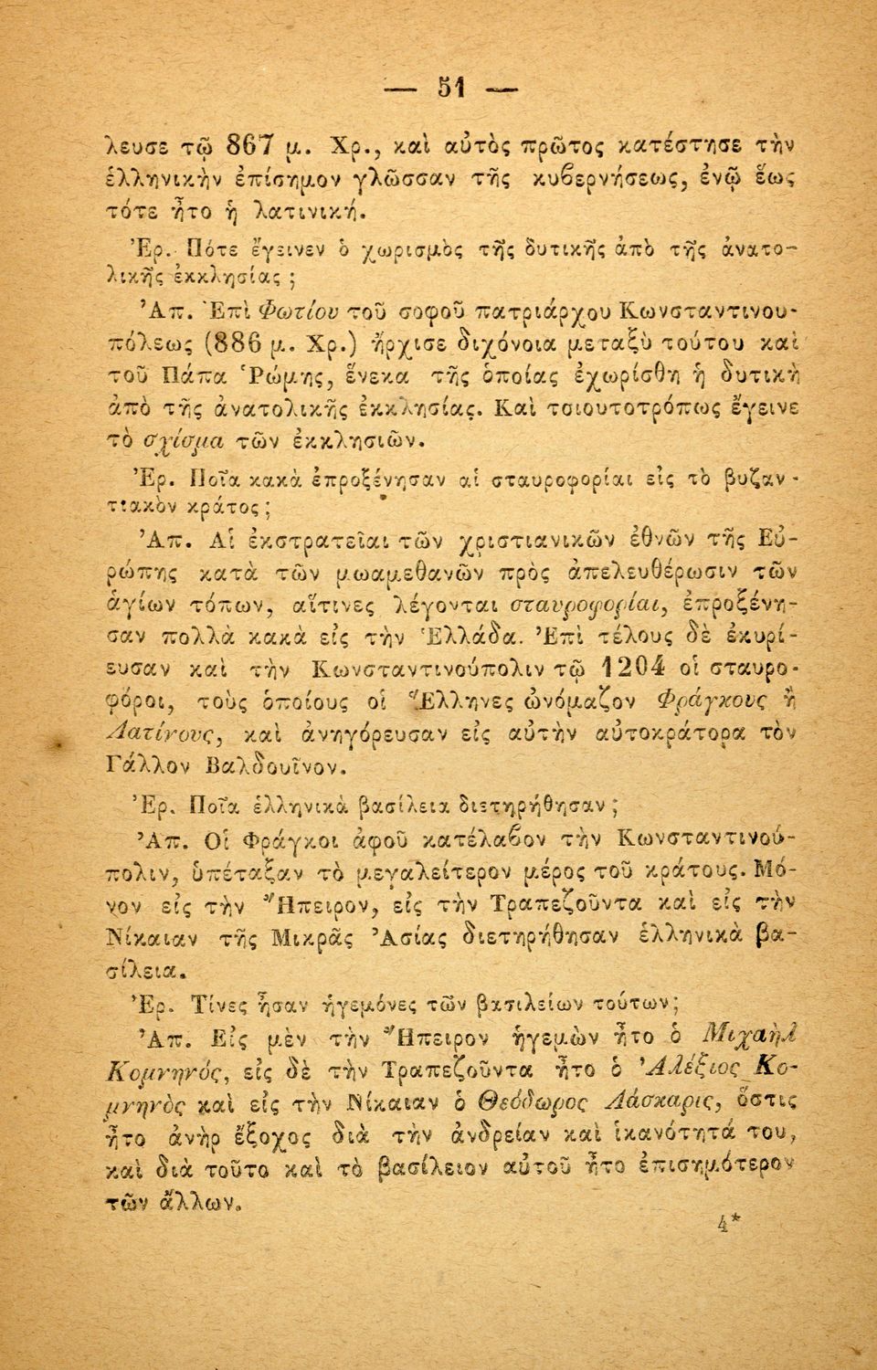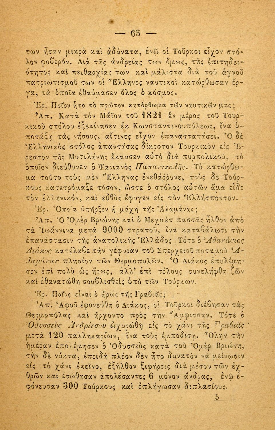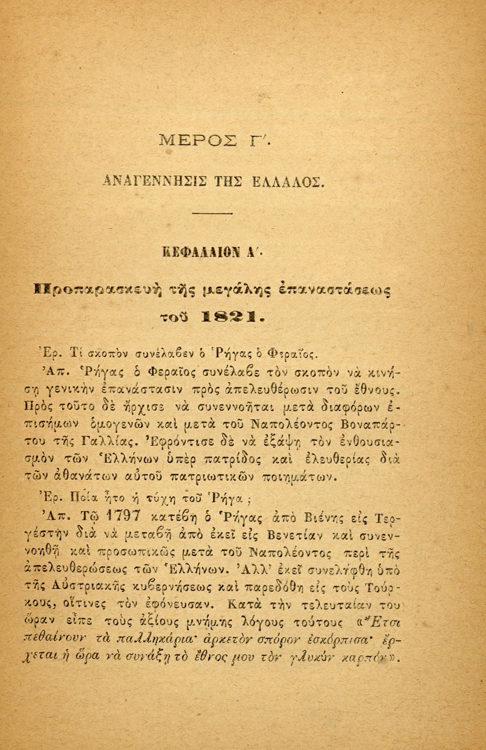 Βαθμίδα εκπαίδευσης: Πρωτοβάθμια Μάθημα: Ιστορία Γλώσσα: Καθαρεύουσα Παρουσίαση περιεχομένου: Σχολικό εγχειρίδιο Ιστορίας Δημοτικού που καλύπτει την περίοδο από τους μυθικούς και ηρωικούς χρόνους. έως την Ελληνική Επανάσταση και τη βασιλεία του Γεώργιου του Α΄ . |