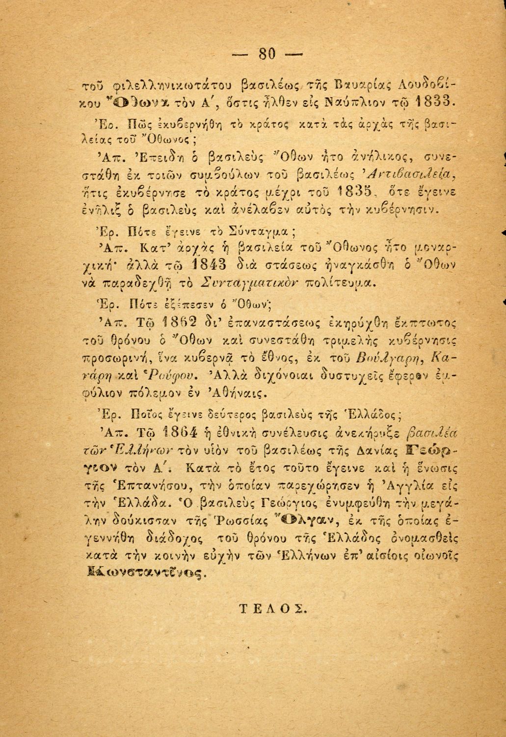 LDR 01200 2200181 4500 035 ## _a20-00157 040 ## _aΚΕΝΕΚ - Εταιρεία Σπουδών Νεοελληνικού Πολιτισμού και Παιδείας 041 ## _ael 100 ## _aΔ. Η. Κυριακόπουλος 110 ## _a157 245 0# _aΕπίτομος ελληνική ιστορία από των αρχαιοτάτων χρόνων μέχρι του νυν προς διδασκαλίαν εν τοις Δημοτικοίς Σχολείοις 260 ## _aΑθήνα _bΤυπογραφείο Ο Παλαμήδης _c1879 300 ## _a82 _c17 520 ## _aΣχολικό εγχειρίδιο Ιστορίας Δημοτικού που καλύπτει την περίοδο από τους μυθικούς και ηρωικούς χρόνους. έως την Ελληνική Επανάσταση και τη βασιλεία του Γεώργιου του Α΄ . 522 ## _aΕλλάδα 546 ## _aΚαθαρεύουσα 563 ## _aΜαλακό Εξώφυλλο 650 #4 _aΒυζάντιο _aΚαποδίστριας _aΠελοποννησιακός πόλεμος _aΡώμη _aΦεραίος _aΧριστιανισμός