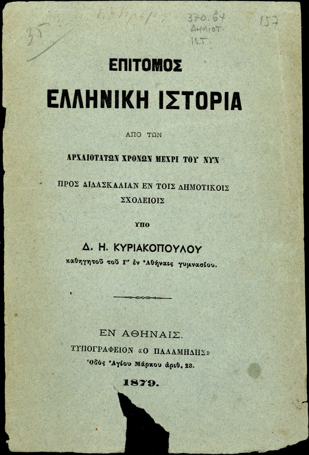Τίτλος: Επίτομος ελληνική ιστορία από των αρχαιοτάτων χρόνων μέχρι του νυν προς διδασκαλίαν εν τοις Δημοτικοίς Σχολείοις