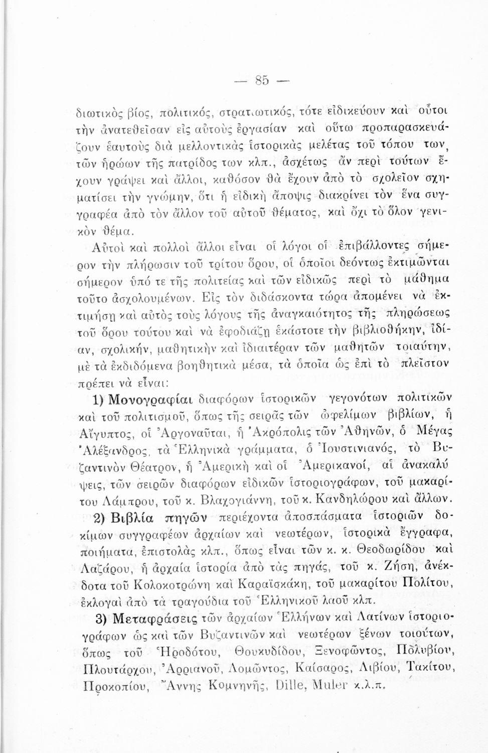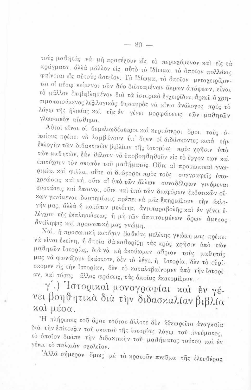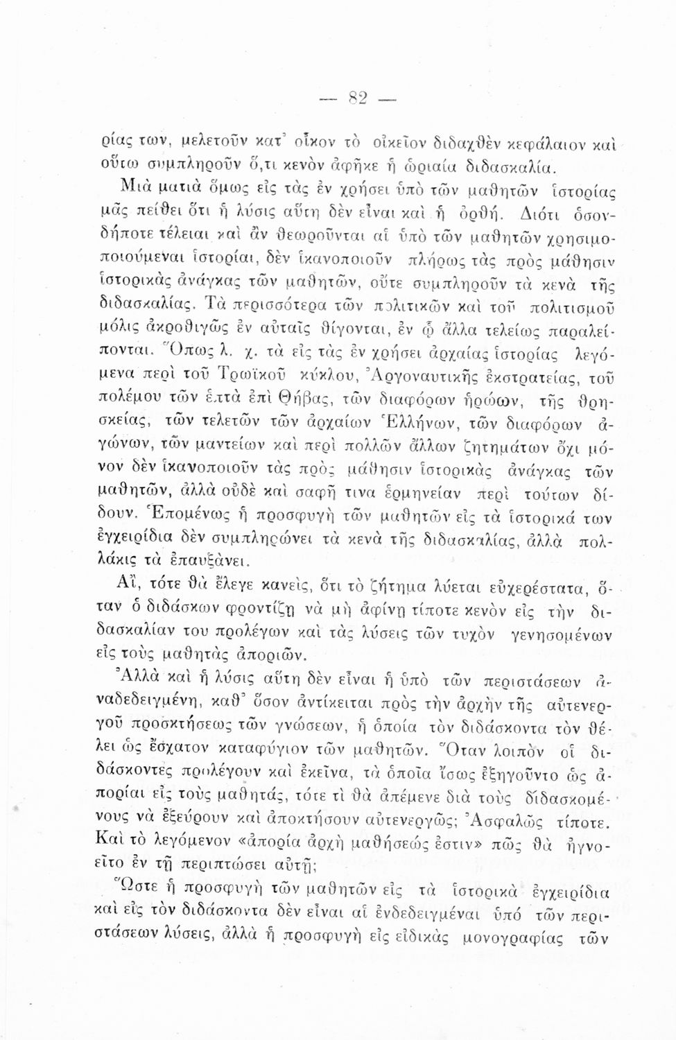 Βαθμίδα εκπαίδευσης: Πρωτοβάθμια, Δευτεροβάθμια Μάθημα: Ιστορία Γλώσσα: Καθαρεύουσα Παρουσίαση περιεχομένου: Παιδαγωγικό βοήθημα Ιστορίας που πραγματεύεται την σημασιολογική εξέλιξη και ερμηνεία του όρου ιστορία, την εξέλιξη της ιστορικής επιστήμης, τις προβληματικές που απασχόλησαν τα τελευταία χρόνια τους ιστορικούς και την εξέλιξη της διδασκαλίας του μαθήματος. Περιέχει και υποδειγματικά σχέδια διδασκαλίας του μαθήματος. |
