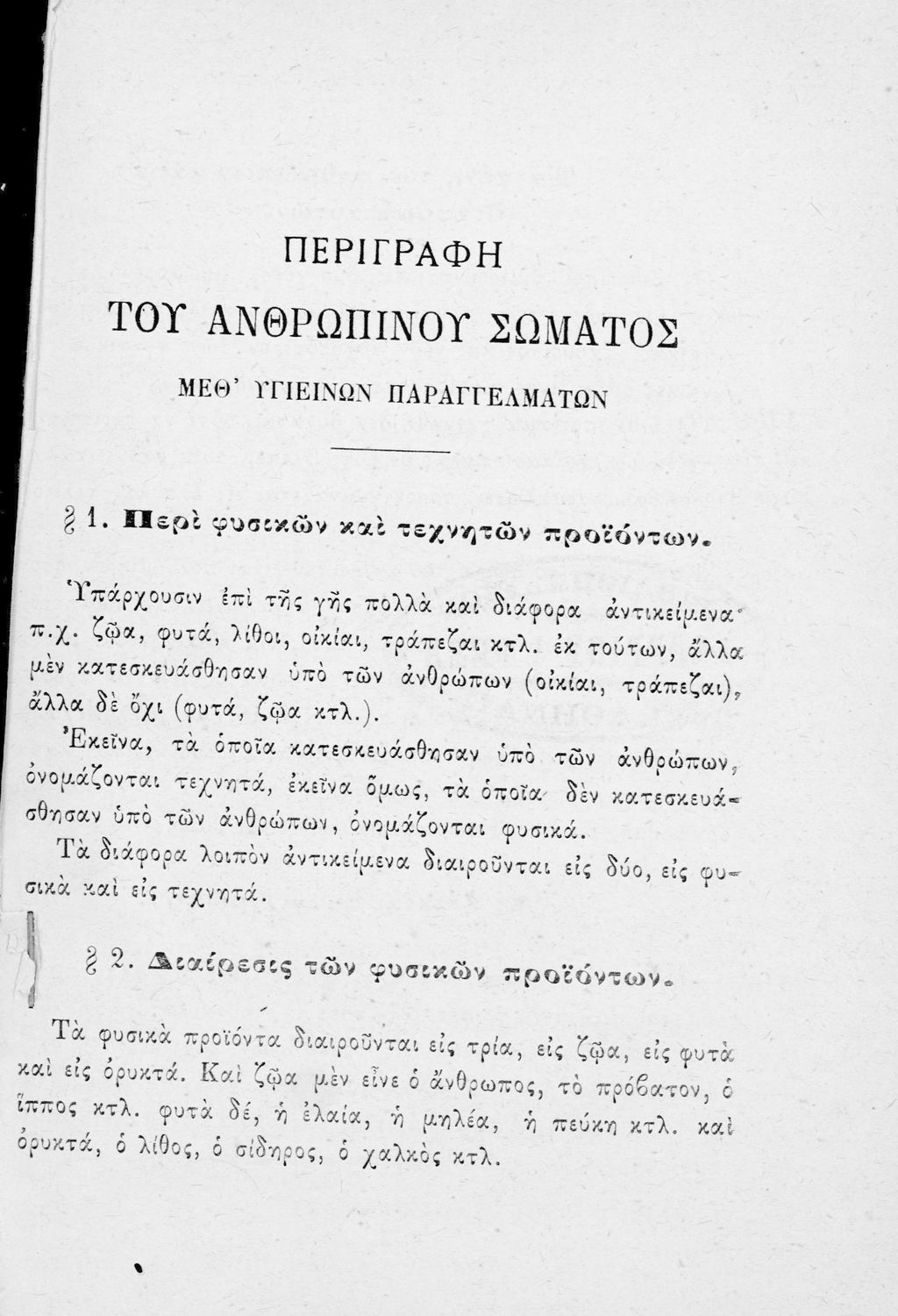 Τίτλος: Περιγραφή του ανθρώπινου σώματος μεθ' υγιεινών παραγγελμάτων προς χρήσιν των μαθητών των Δημοτικών Σχολείων αμφοτέρων των φύλων