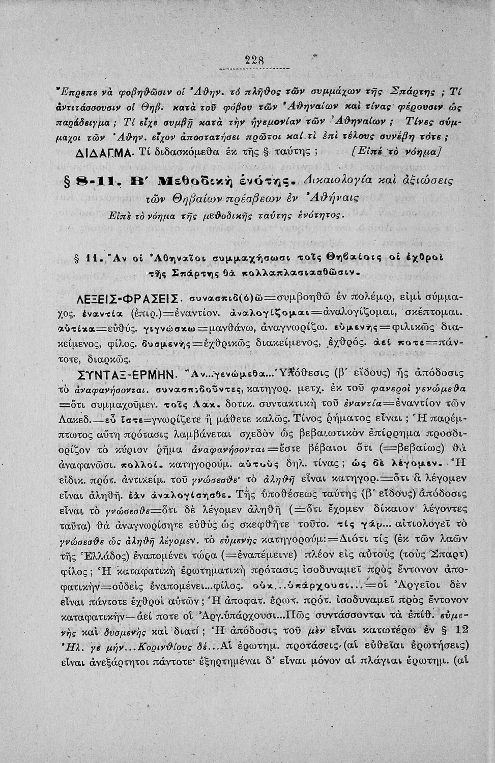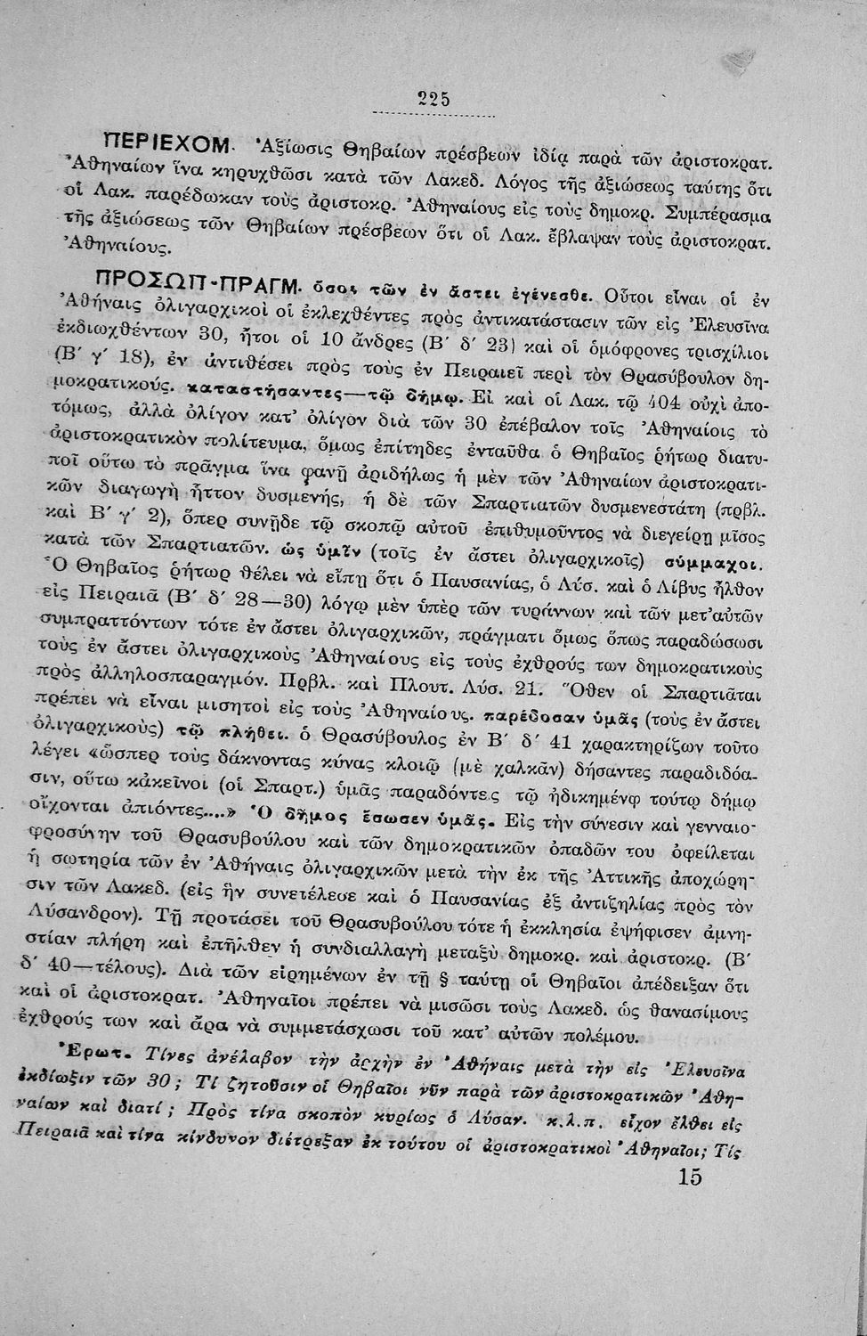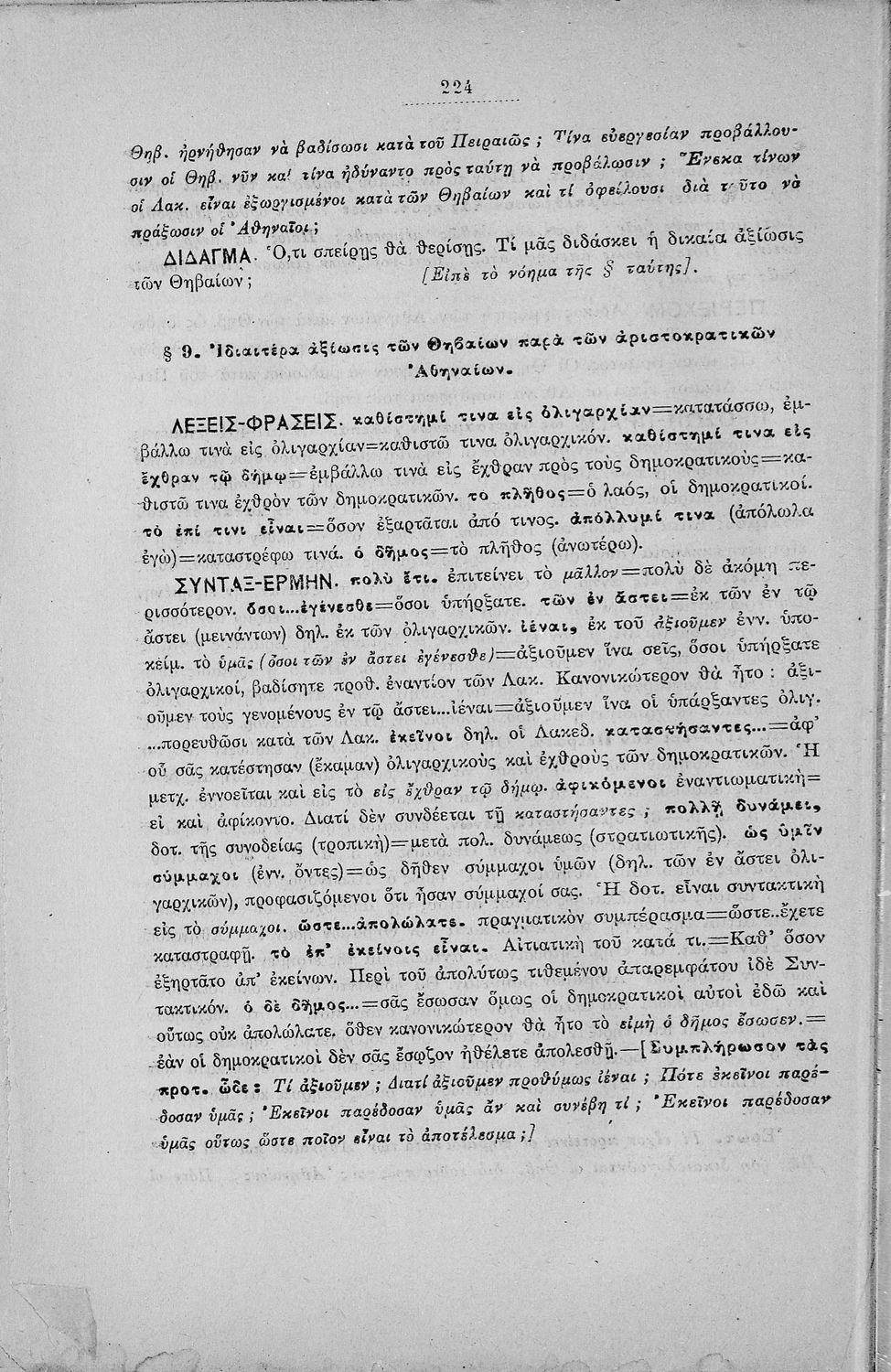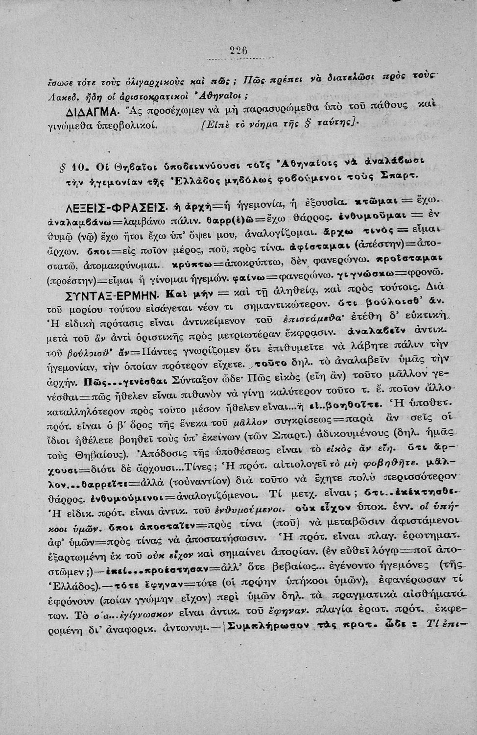 Μαθητικό βοήθημα Αρχαίων Ελληνικών της τρίτης τάξης των τετρατάξιων Γυμνασίων. Το βιβλίο περιέχει τα έργα του Δημοσθένη, Περί της ειρήνης και Α΄ Φιλιππικός από μετάφραση.