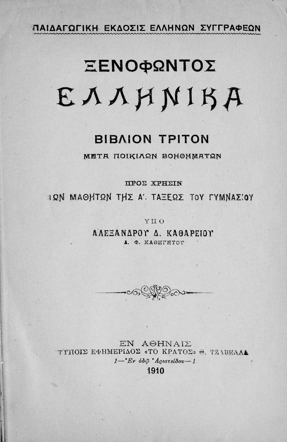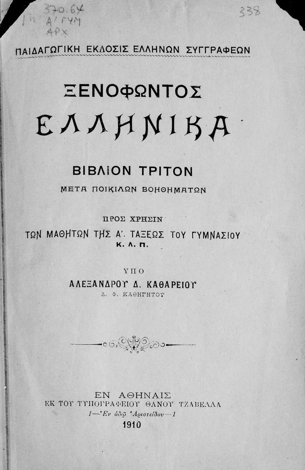 Ξενοφώντος Ελληνικά βιβλίον τρίτον μετά ποικίλων βοηθημάτων προς χρήσιν των μαθητών της Α΄ τάξεως του Γυμνασίου