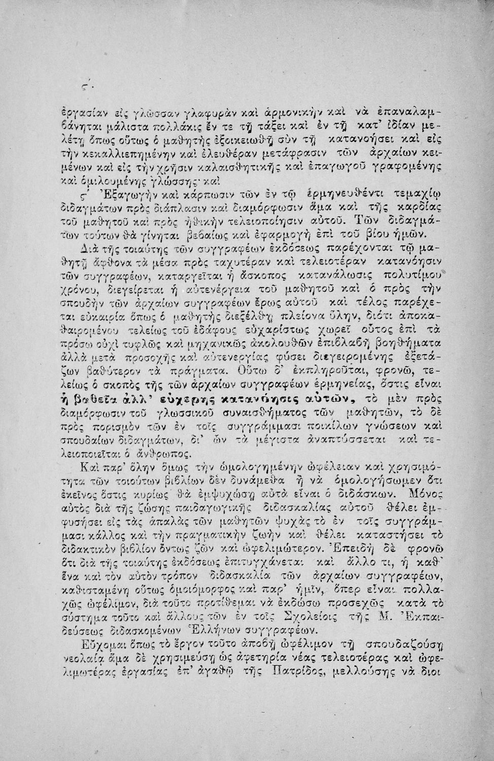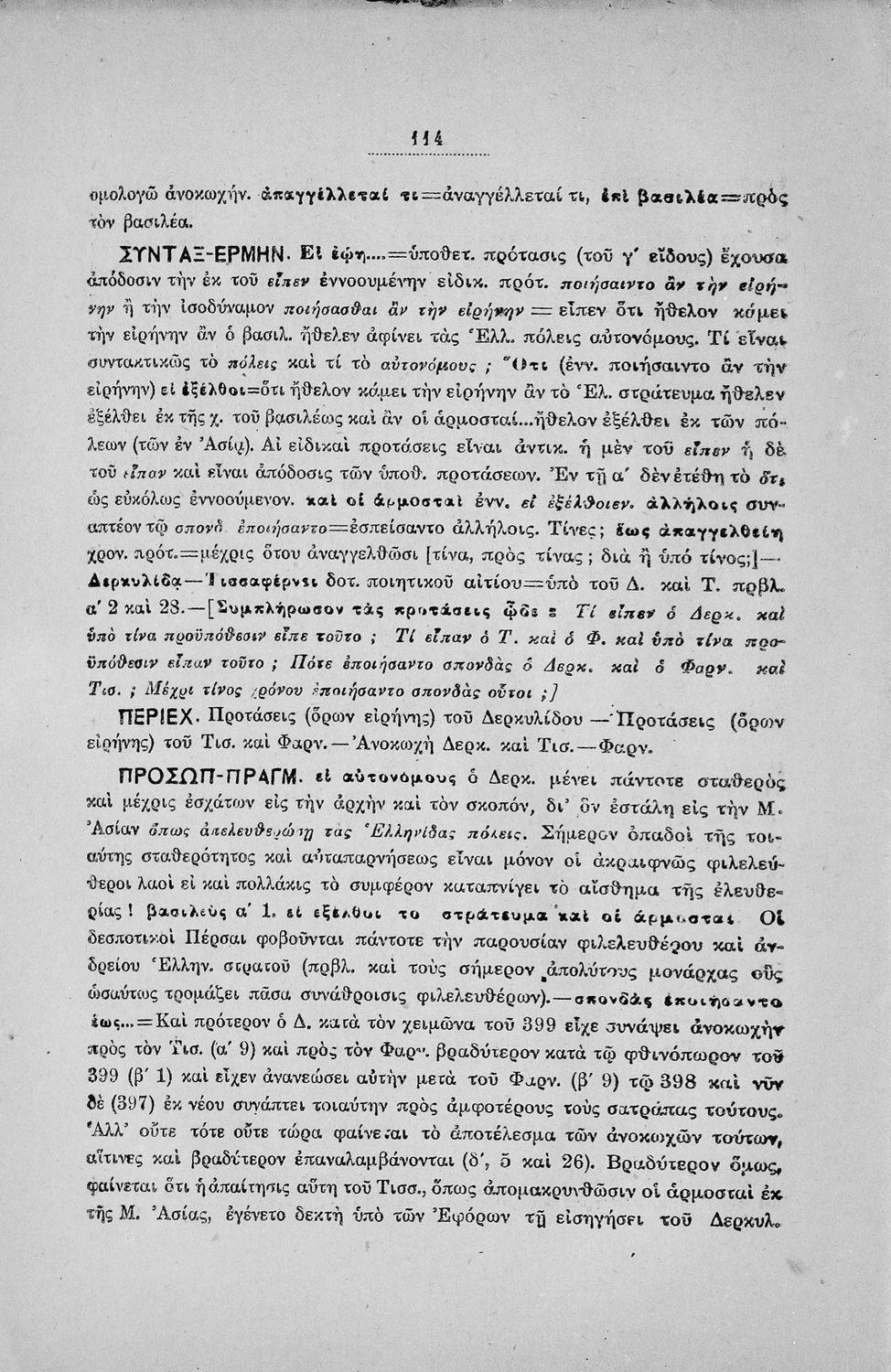 Μαθητικό βοήθημα Αρχαίων Ελληνικών της τρίτης τάξης των τετρατάξιων Γυμνασίων. Το βιβλίο περιέχει τα έργα του Δημοσθένη, Περί της ειρήνης και Α΄ Φιλιππικός από μετάφραση.