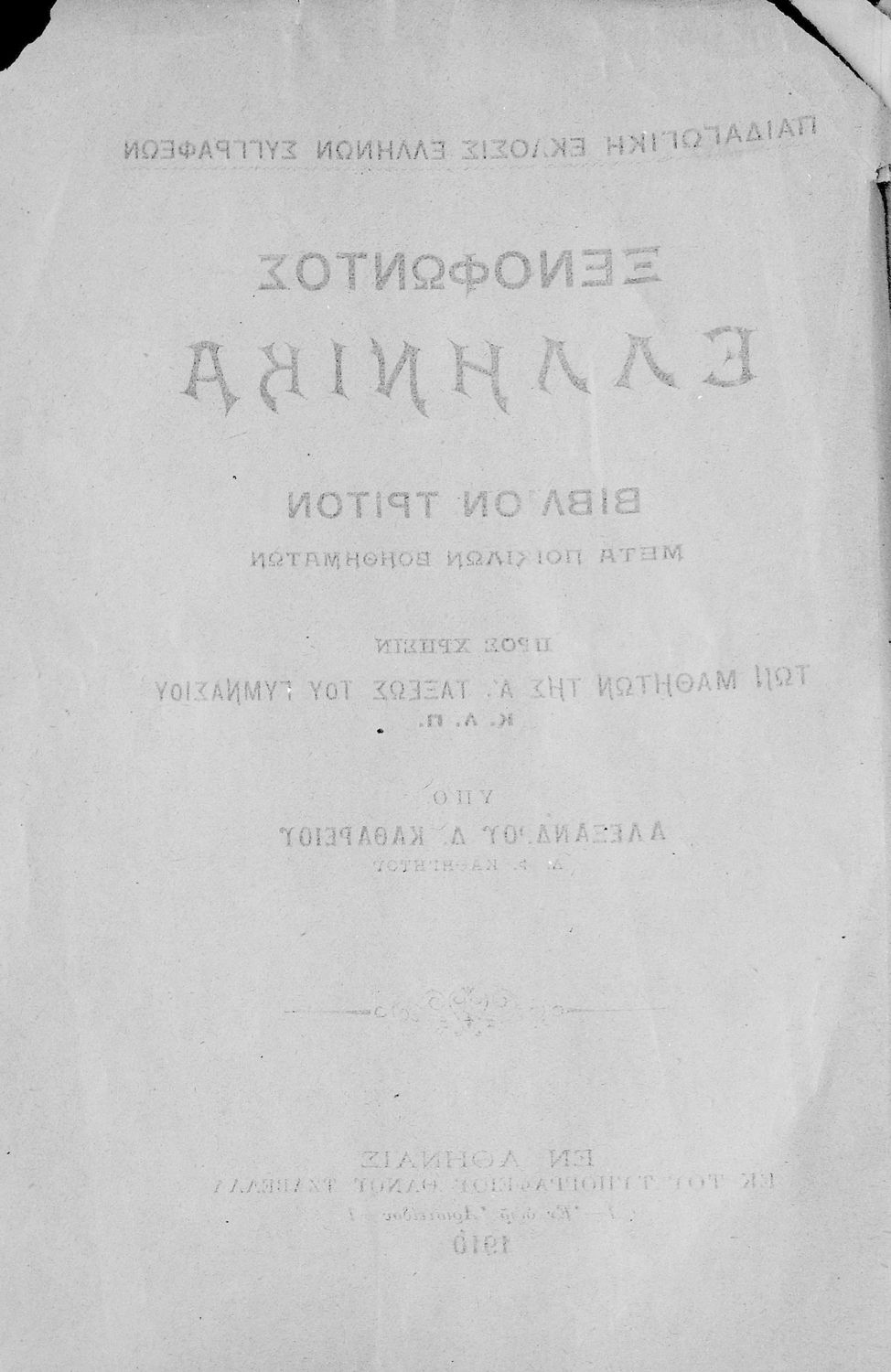 Τίτλος: Ξενοφώντος Ελληνικά βιβλίον τρίτον μετά ποικίλων βοηθημάτων προς χρήσιν των μαθητών της Α΄ τάξεως του Γυμνασίου