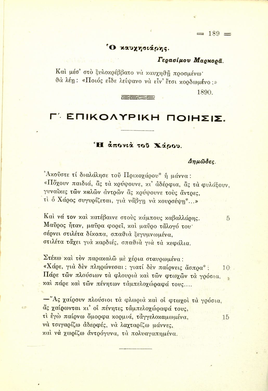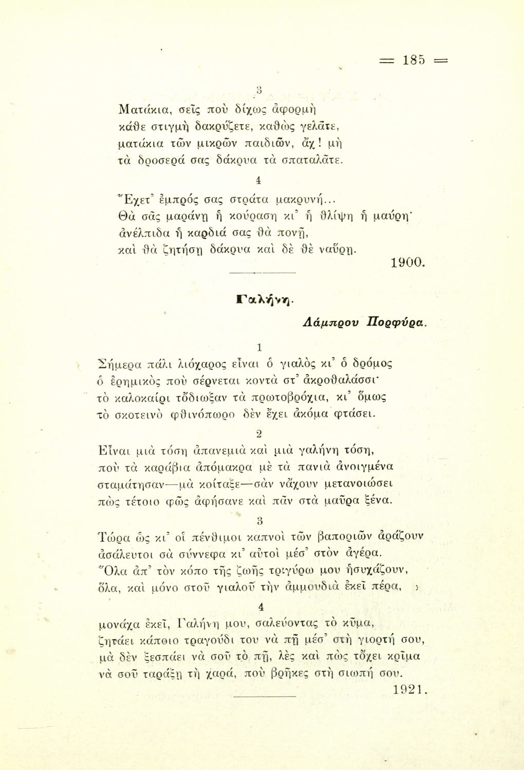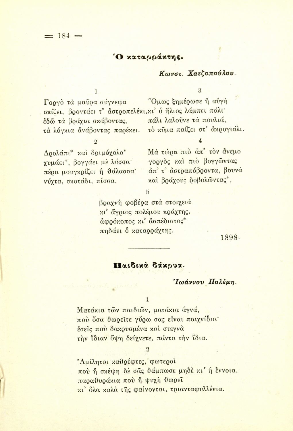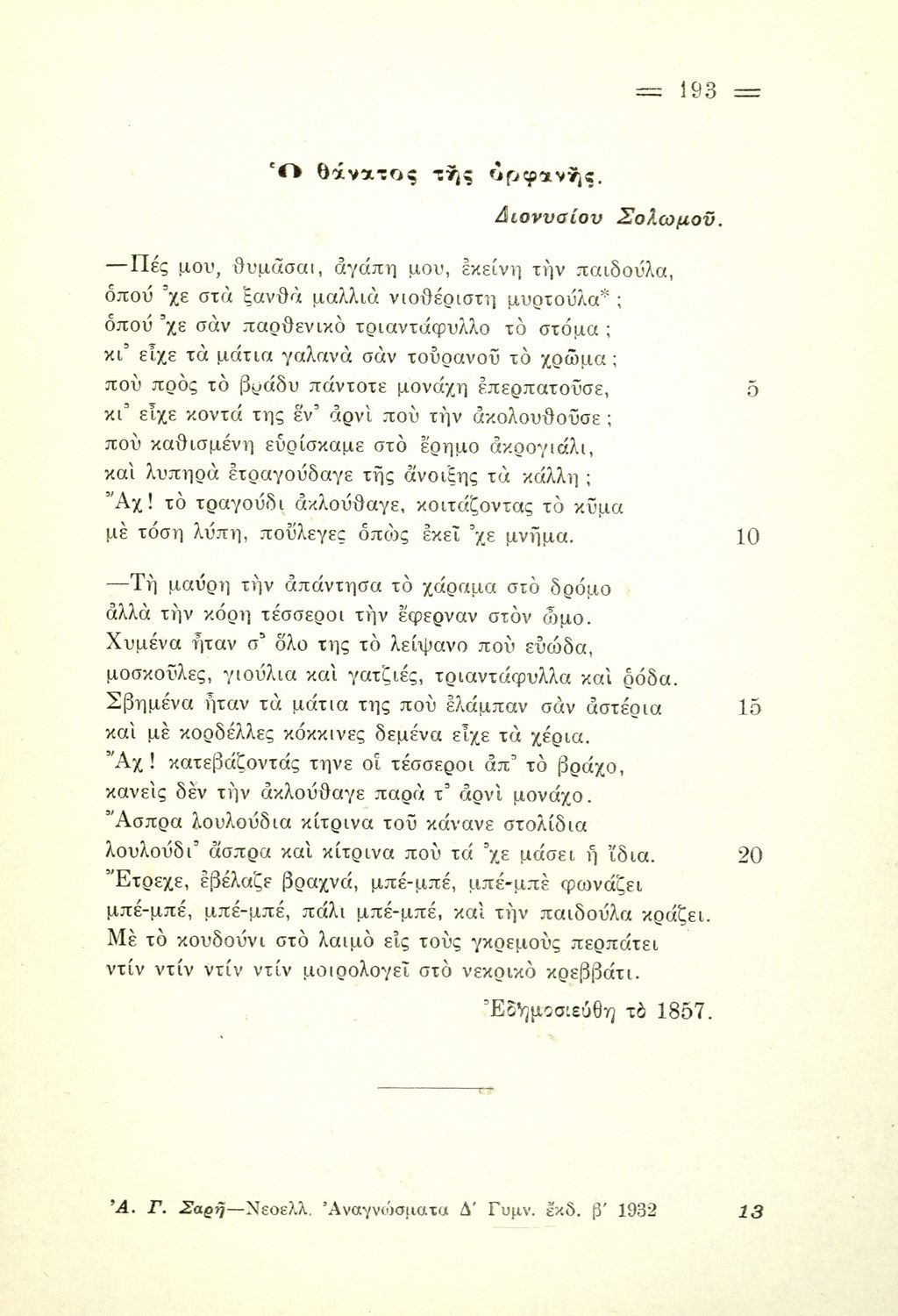 Σχολικό εγχειρίδιο για την Β΄ Γυμνασίου και την Γ΄ Αστικού Θηλέων για το μάθημα των Νέων Ελληνικών. Το εγχειρίδιο αποτελείται από κείμενα πεζού λόγου, επικολυρικά ποιήματα, ωδές, ηθογραφικά διηγήματα, ρητορικά