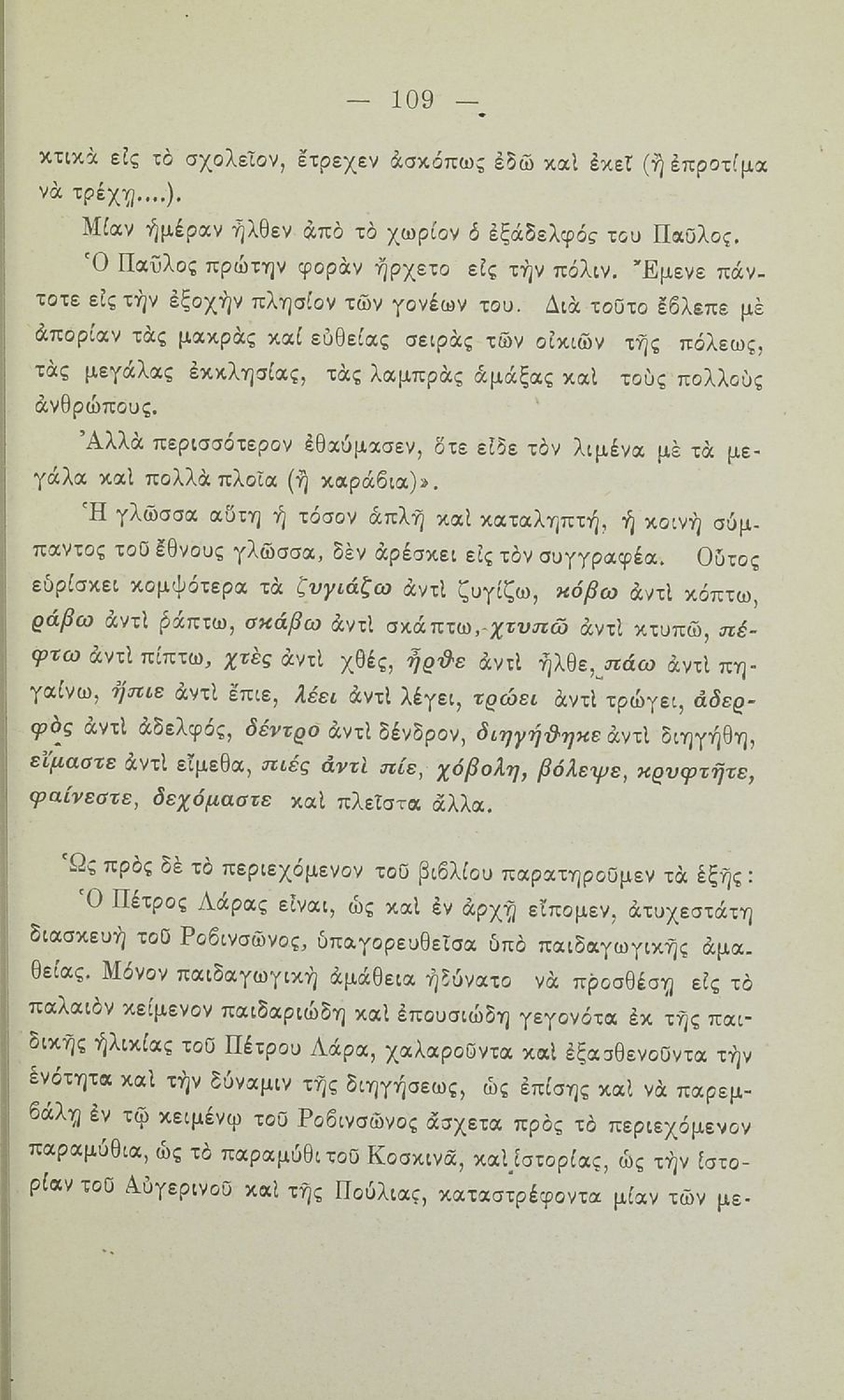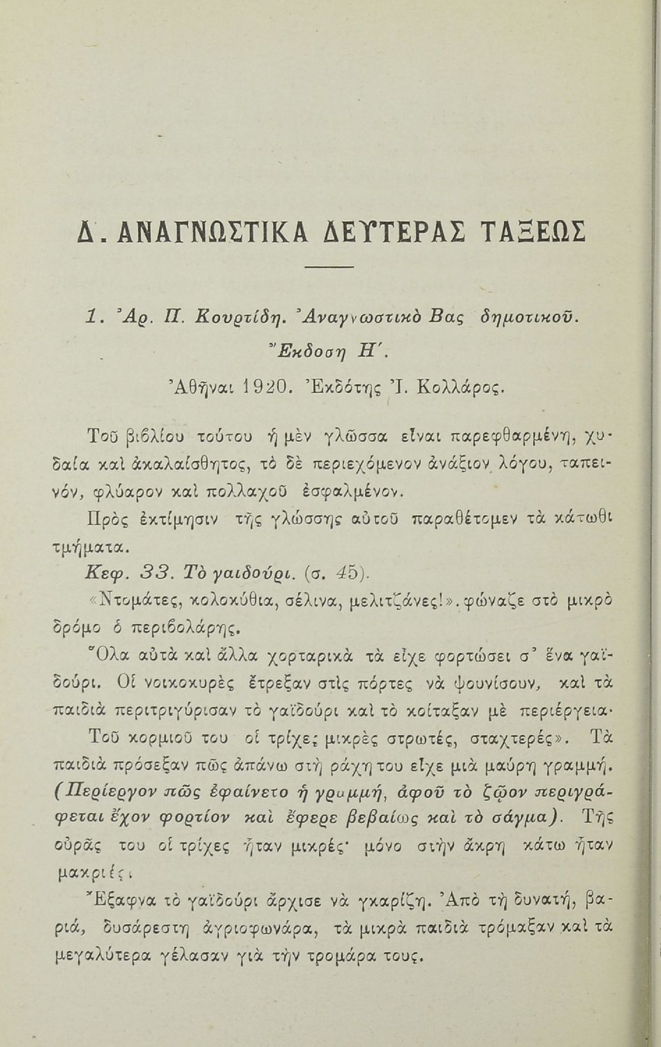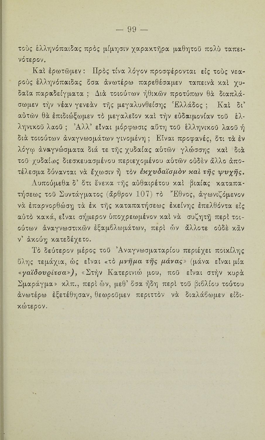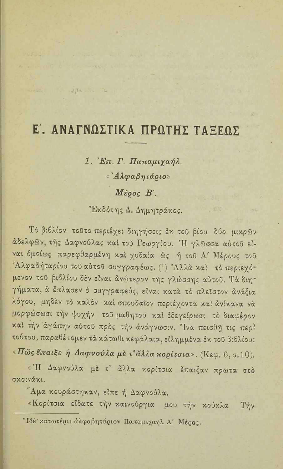 Γλώσσα: Καθαρεύουσα Παρουσίαση περιεχομένου: Εισηγητική έκθεση της επιτροπείας του Υπουργείου Θρησκευμάτων και Παιδείας, την οποία αποτελούσαν καθηγητές ένθερμοι υποστηρικτές της καθαρεύουσας, που εξαπολύει δριμεία κριτική στη γραμματική της δημοτικής και σε συγκεκριμένα αναγνωστικά Δημοτικού. Η γλώσσα είναι ιδιαίτερα σκληρή και επικριτική και χρησιμοποιούνται άκομψοι χαρακτηρισμοί, όπως " άθλιο, χυδαίο περιεχόμενο των αναγνωστικών βιβλίων". |