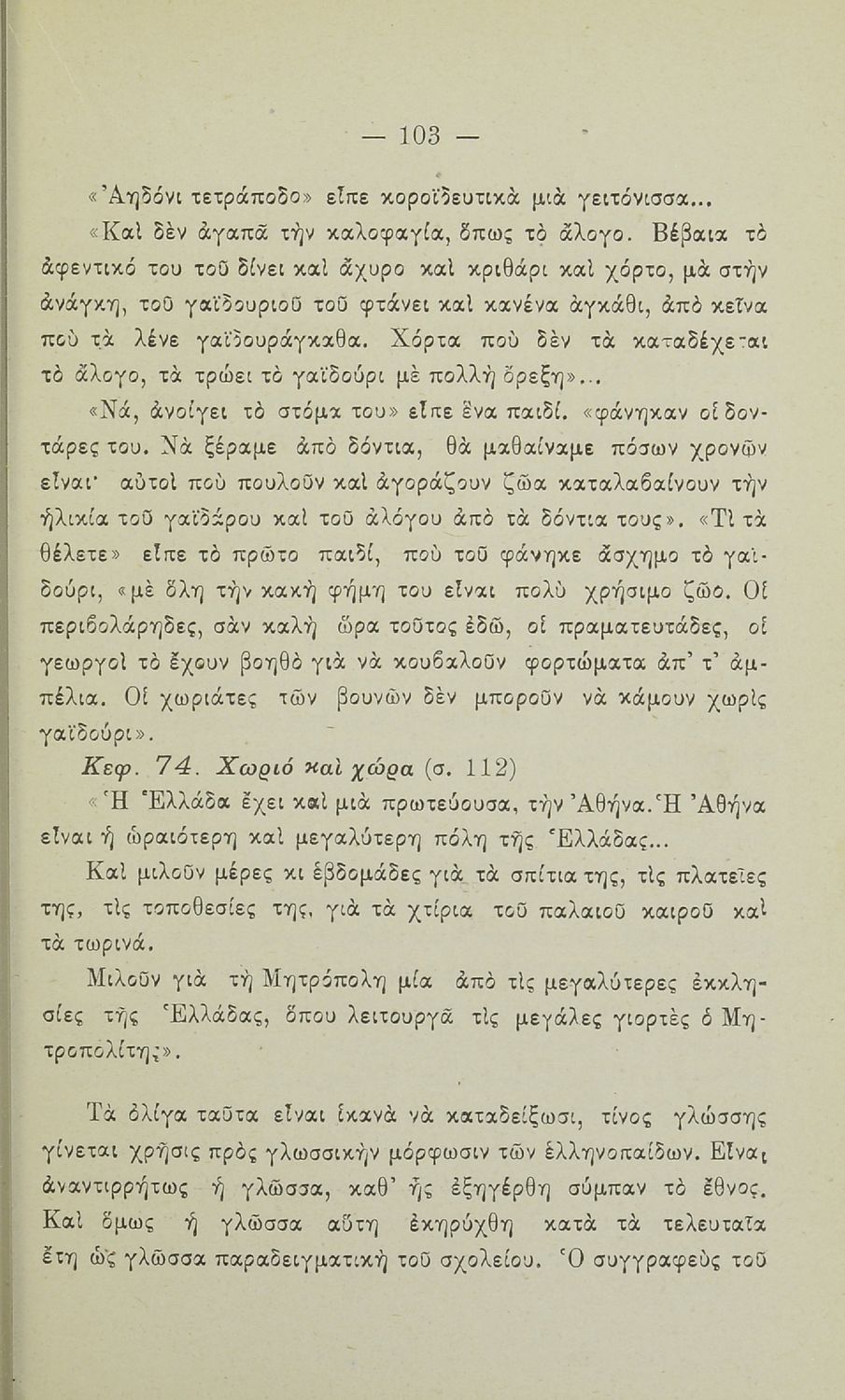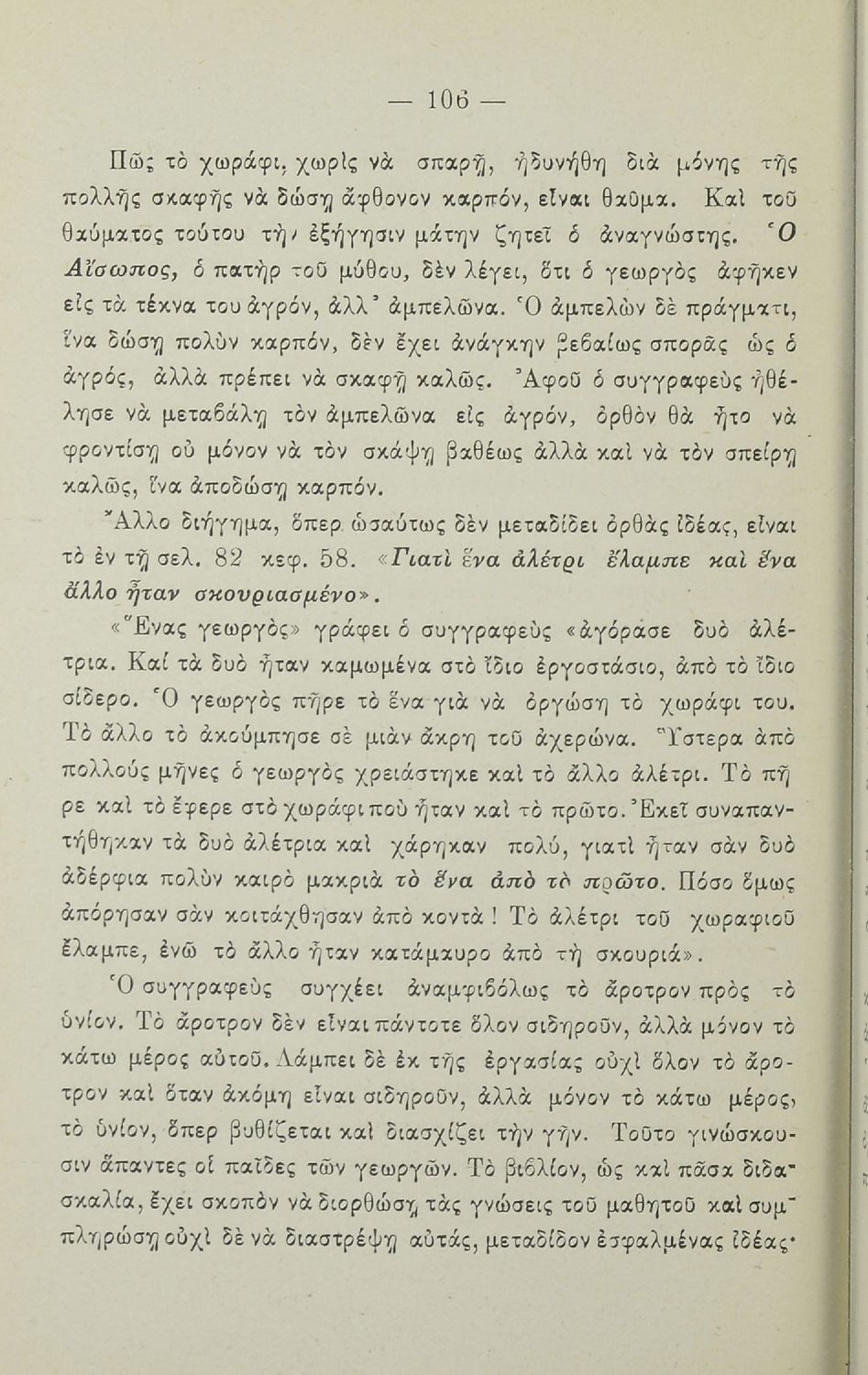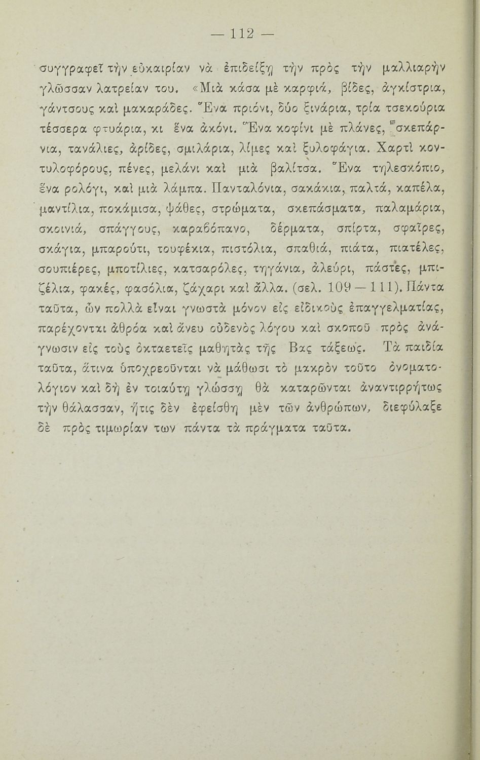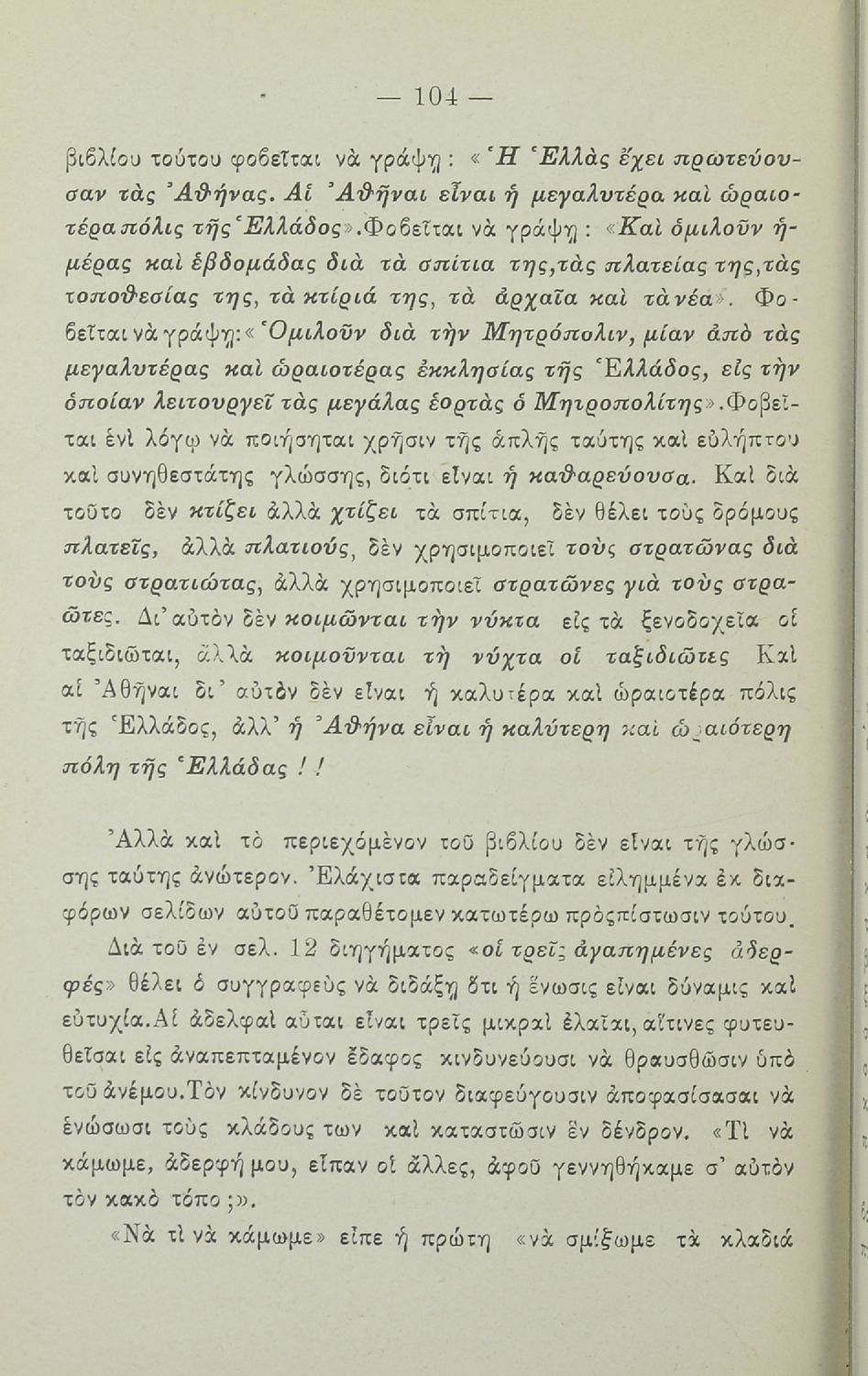 Γλώσσα: Καθαρεύουσα Παρουσίαση περιεχομένου: Εισηγητική έκθεση της επιτροπείας του Υπουργείου Θρησκευμάτων και Παιδείας, την οποία αποτελούσαν καθηγητές ένθερμοι υποστηρικτές της καθαρεύουσας, που εξαπολύει δριμεία κριτική στη γραμματική της δημοτικής και σε συγκεκριμένα αναγνωστικά Δημοτικού. Η γλώσσα είναι ιδιαίτερα σκληρή και επικριτική και χρησιμοποιούνται άκομψοι χαρακτηρισμοί, όπως " άθλιο, χυδαίο περιεχόμενο των αναγνωστικών βιβλίων". |