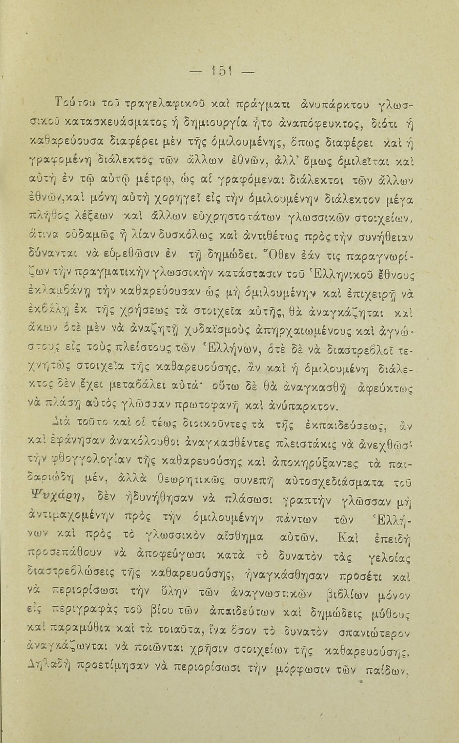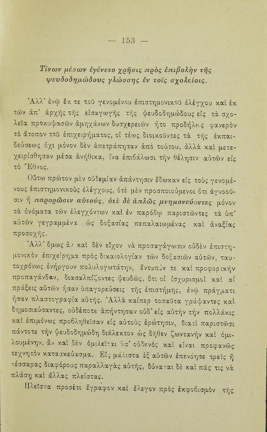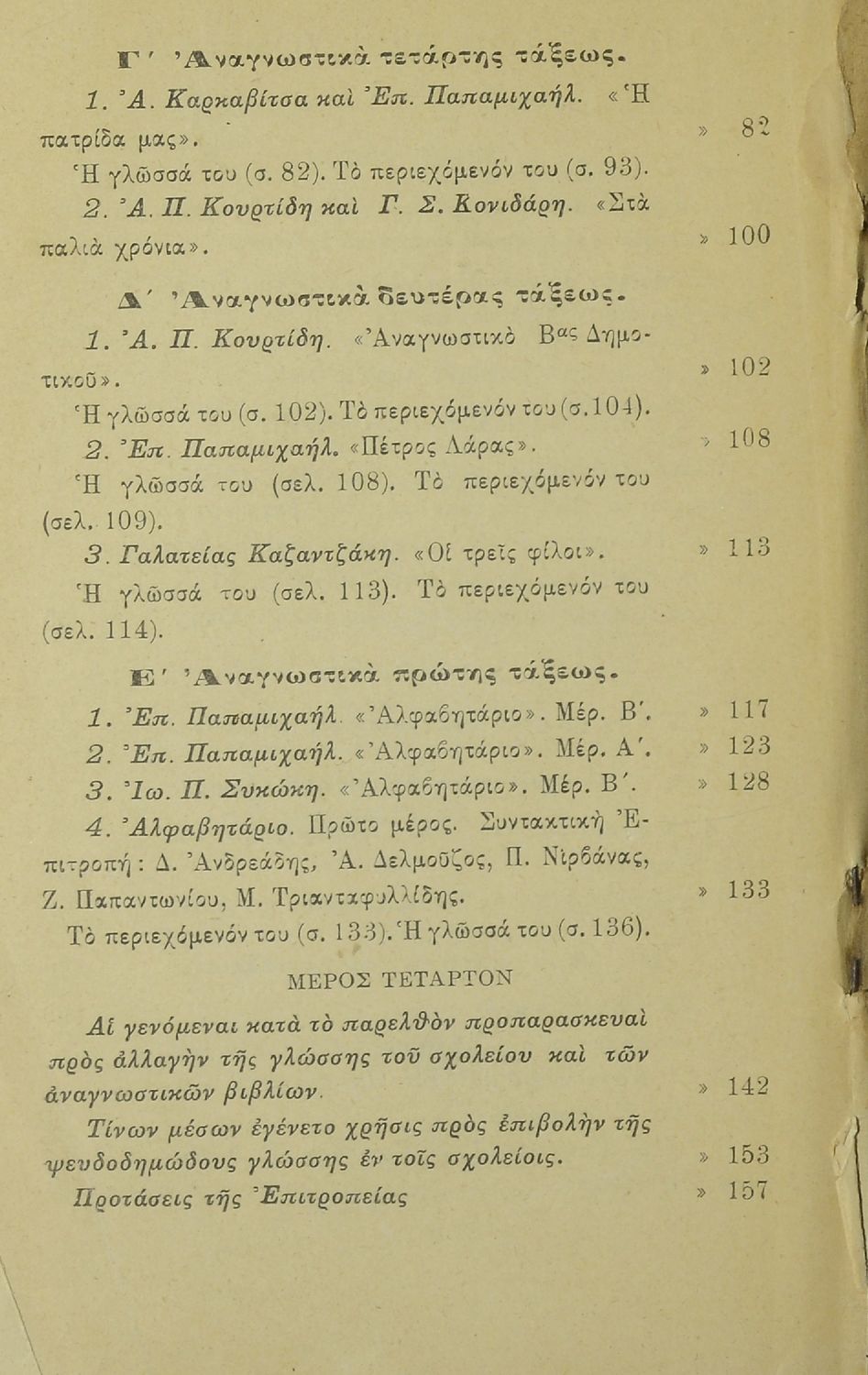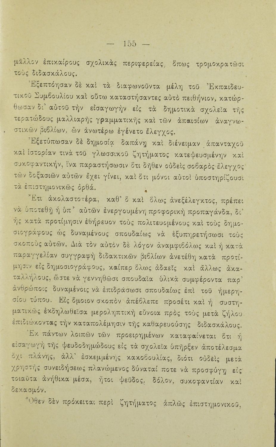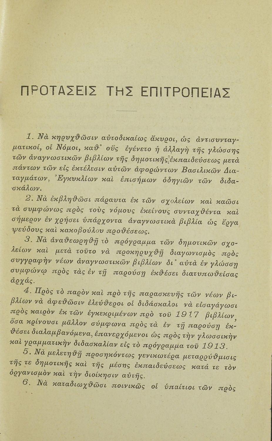 Γλώσσα: Καθαρεύουσα Παρουσίαση περιεχομένου: Εισηγητική έκθεση της επιτροπείας του Υπουργείου Θρησκευμάτων και Παιδείας, την οποία αποτελούσαν καθηγητές ένθερμοι υποστηρικτές της καθαρεύουσας, που εξαπολύει δριμεία κριτική στη γραμματική της δημοτικής και σε συγκεκριμένα αναγνωστικά Δημοτικού. Η γλώσσα είναι ιδιαίτερα σκληρή και επικριτική και χρησιμοποιούνται άκομψοι χαρακτηρισμοί, όπως " άθλιο, χυδαίο περιεχόμενο των αναγνωστικών βιβλίων". |