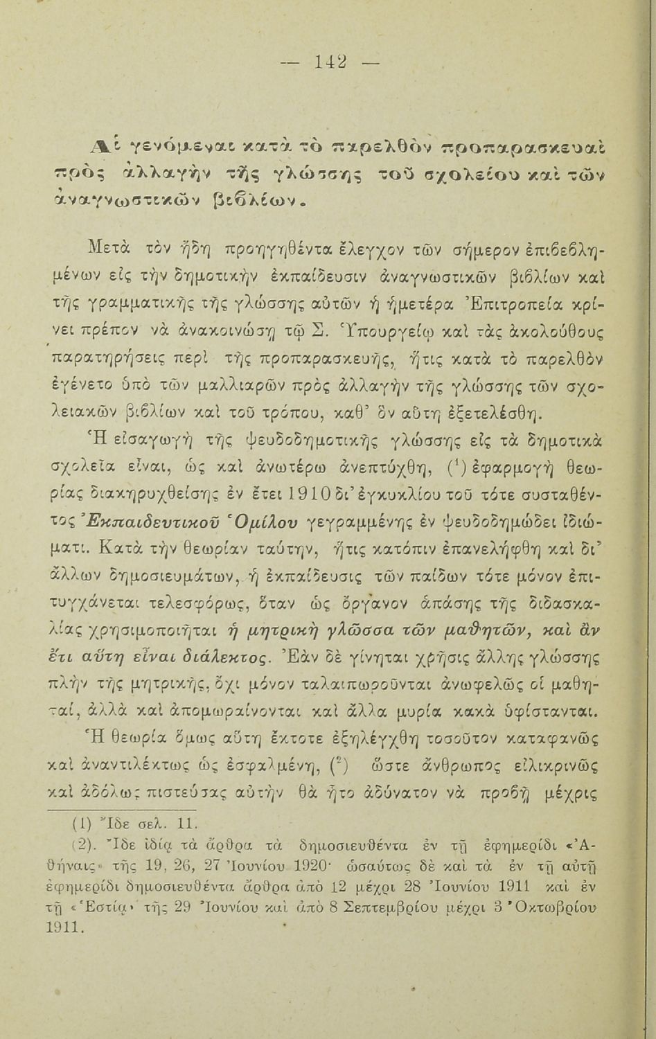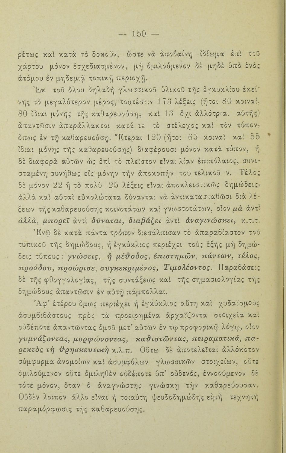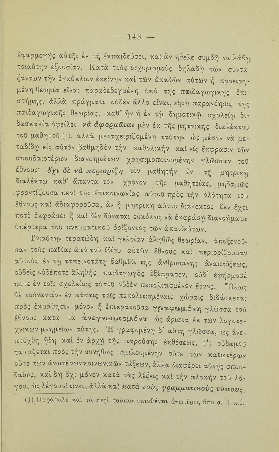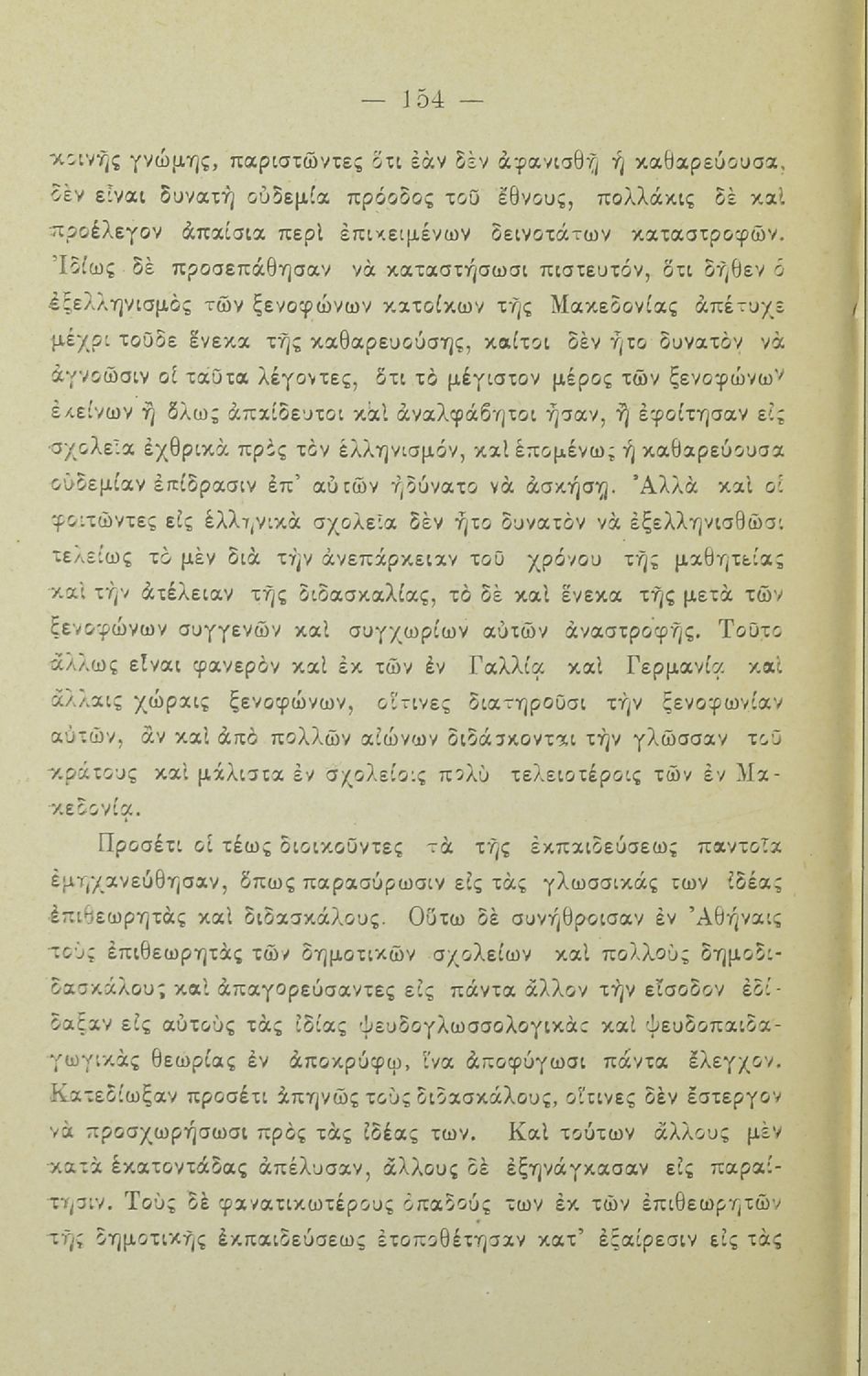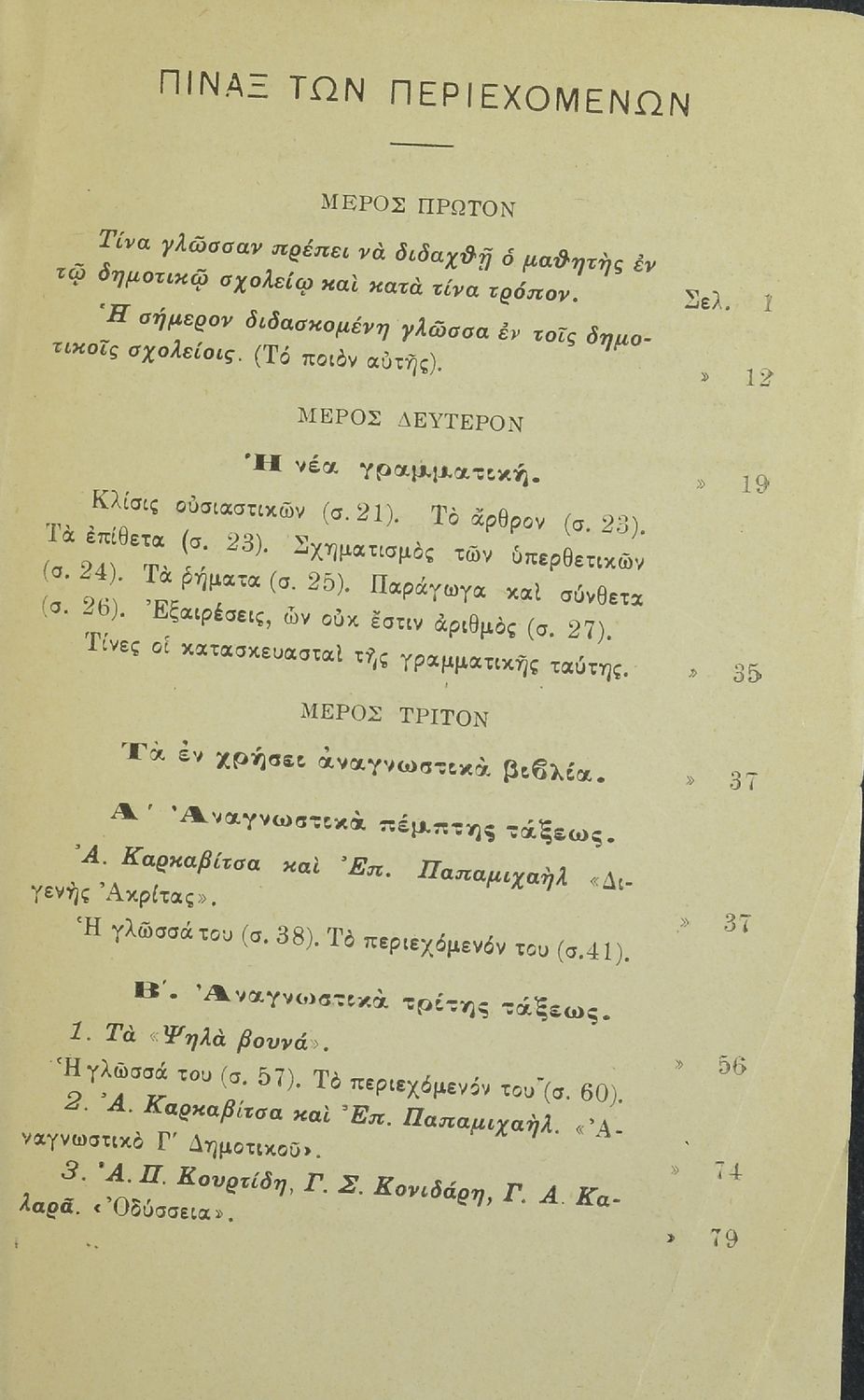 Γλώσσα: Καθαρεύουσα Παρουσίαση περιεχομένου: Εισηγητική έκθεση της επιτροπείας του Υπουργείου Θρησκευμάτων και Παιδείας, την οποία αποτελούσαν καθηγητές ένθερμοι υποστηρικτές της καθαρεύουσας, που εξαπολύει δριμεία κριτική στη γραμματική της δημοτικής και σε συγκεκριμένα αναγνωστικά Δημοτικού. Η γλώσσα είναι ιδιαίτερα σκληρή και επικριτική και χρησιμοποιούνται άκομψοι χαρακτηρισμοί, όπως " άθλιο, χυδαίο περιεχόμενο των αναγνωστικών βιβλίων". |
