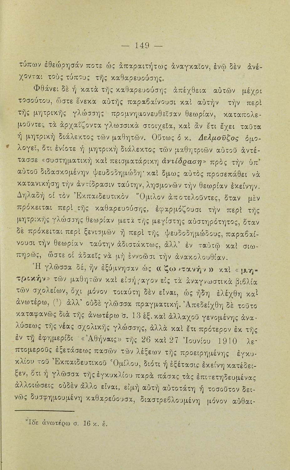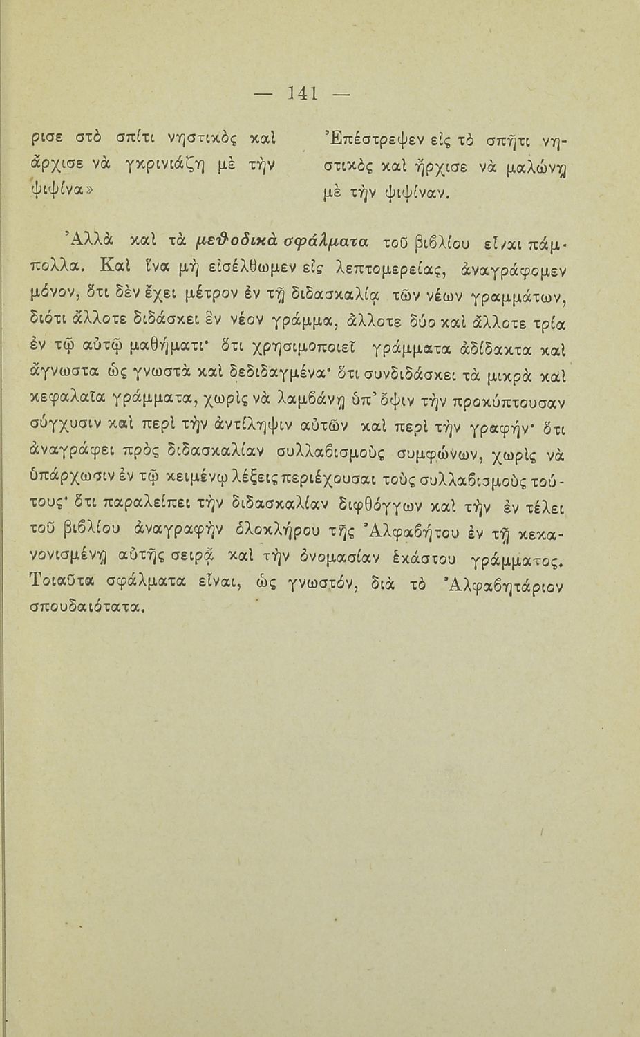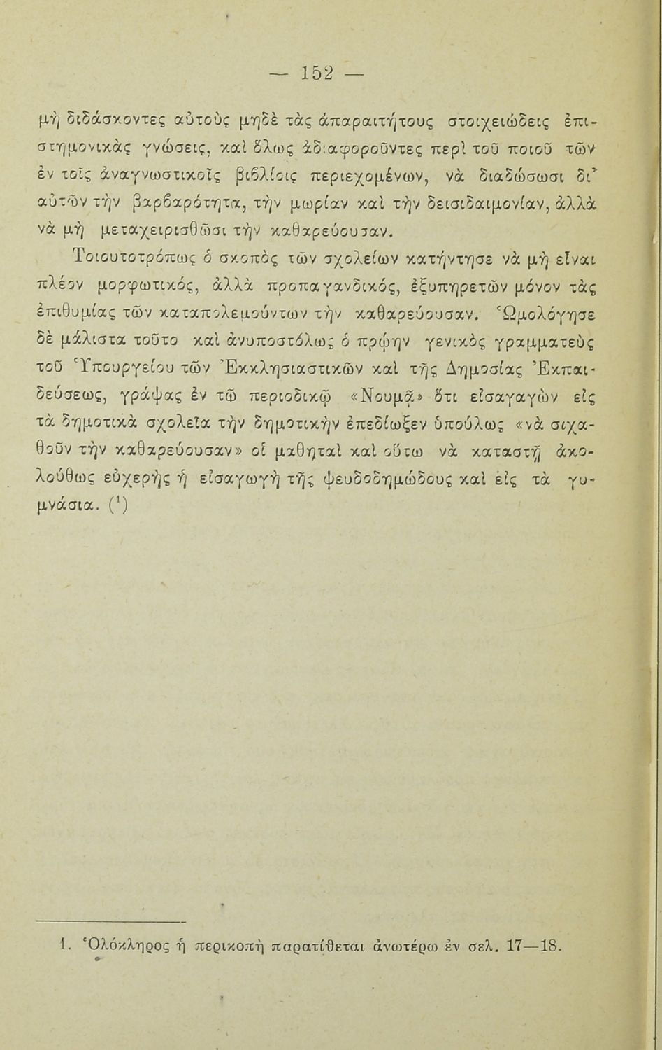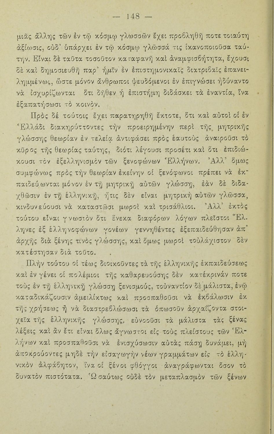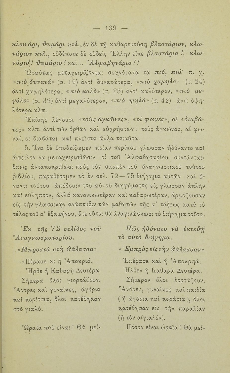 Γλώσσα: Καθαρεύουσα Παρουσίαση περιεχομένου: Εισηγητική έκθεση της επιτροπείας του Υπουργείου Θρησκευμάτων και Παιδείας, την οποία αποτελούσαν καθηγητές ένθερμοι υποστηρικτές της καθαρεύουσας, που εξαπολύει δριμεία κριτική στη γραμματική της δημοτικής και σε συγκεκριμένα αναγνωστικά Δημοτικού. Η γλώσσα είναι ιδιαίτερα σκληρή και επικριτική και χρησιμοποιούνται άκομψοι χαρακτηρισμοί, όπως " άθλιο, χυδαίο περιεχόμενο των αναγνωστικών βιβλίων". |