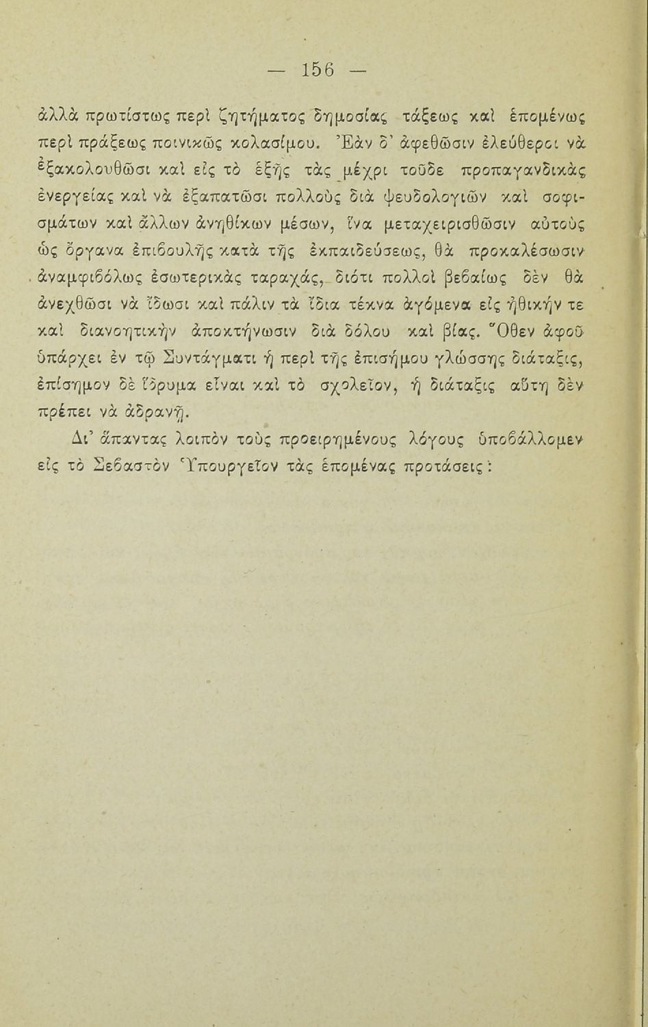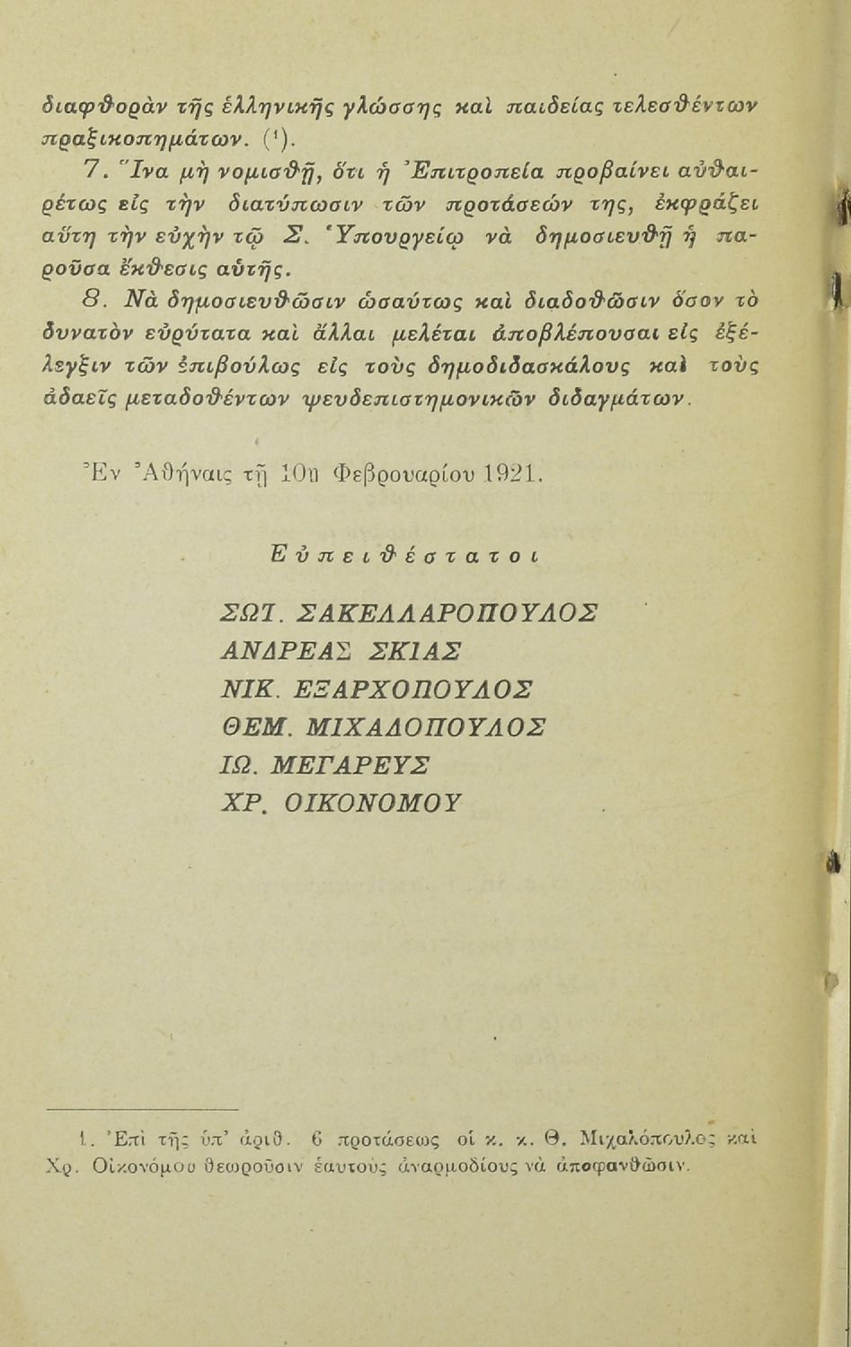 Εισηγητική έκθεση της επιτροπείας του Υπουργείου Θρησκευμάτων και Παιδείας, την οποία αποτελούσαν καθηγητές ένθερμοι υποστηρικτές της καθαρεύουσας, που εξαπολύει δριμεία κριτική στη γραμματική της δημοτικής και σε συγκεκριμένα αναγνωστικά Δημοτικού. Η γλώσσα είναι ιδιαίτερα σκληρή και επικριτική και χρησιμοποιούνται άκομψοι χαρακτηρισμοί, όπως " άθλιο, χυδαίο περιεχόμενο των αναγνωστικών βιβλίων".