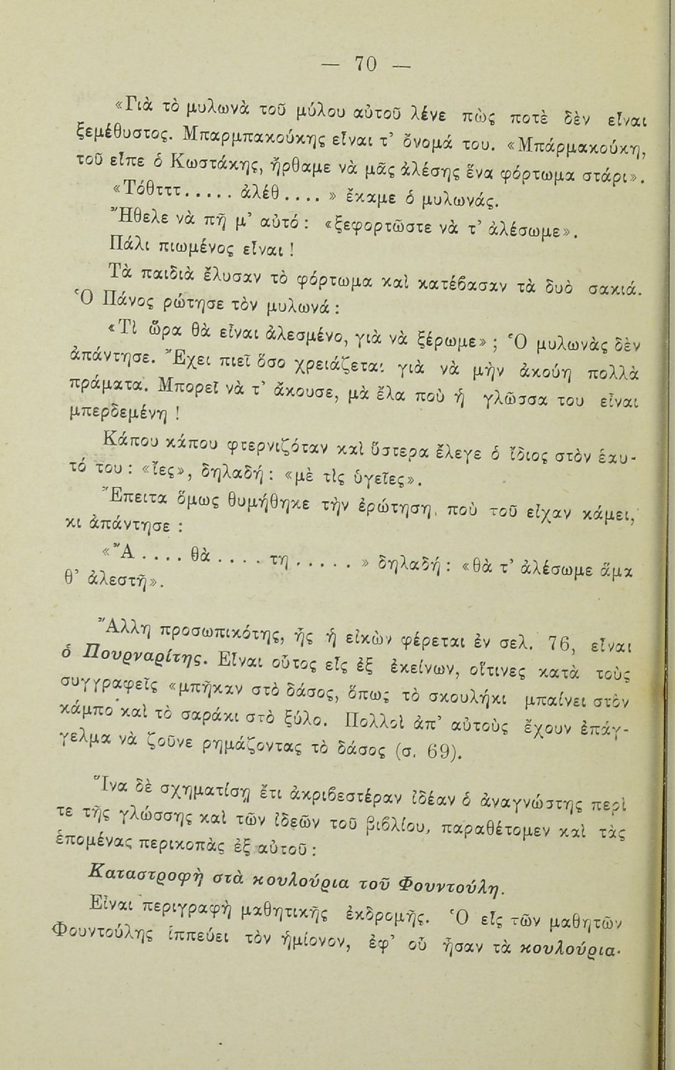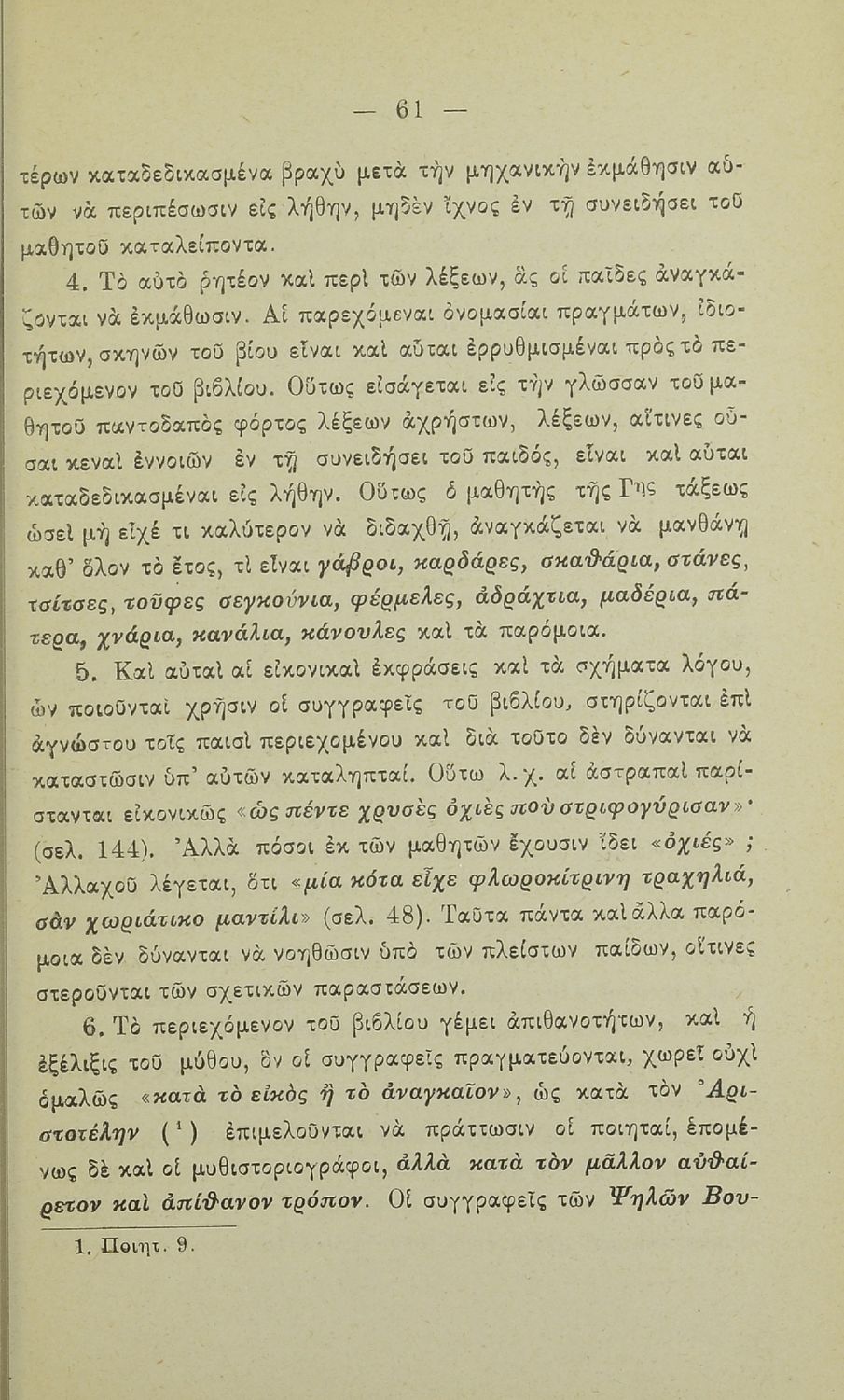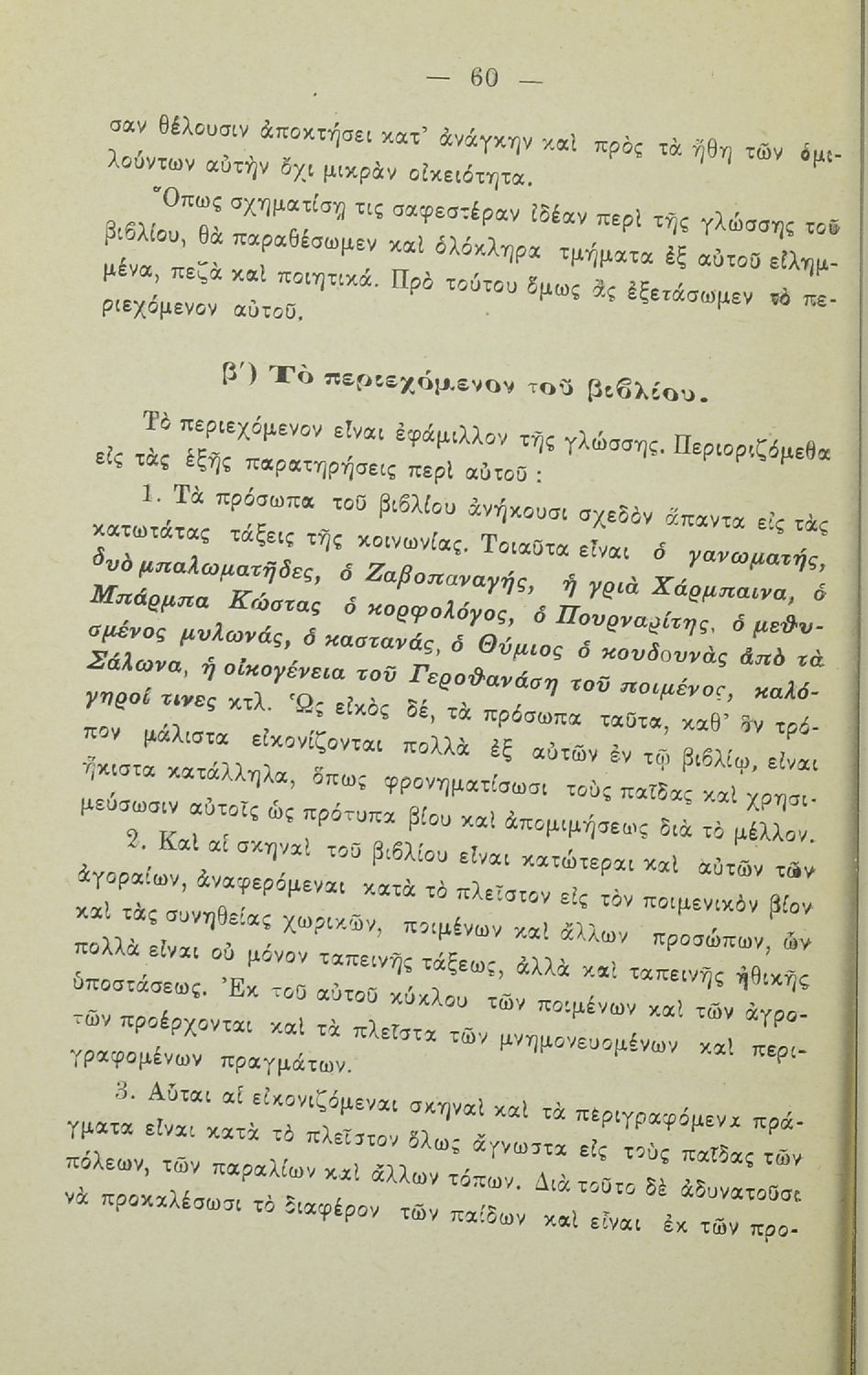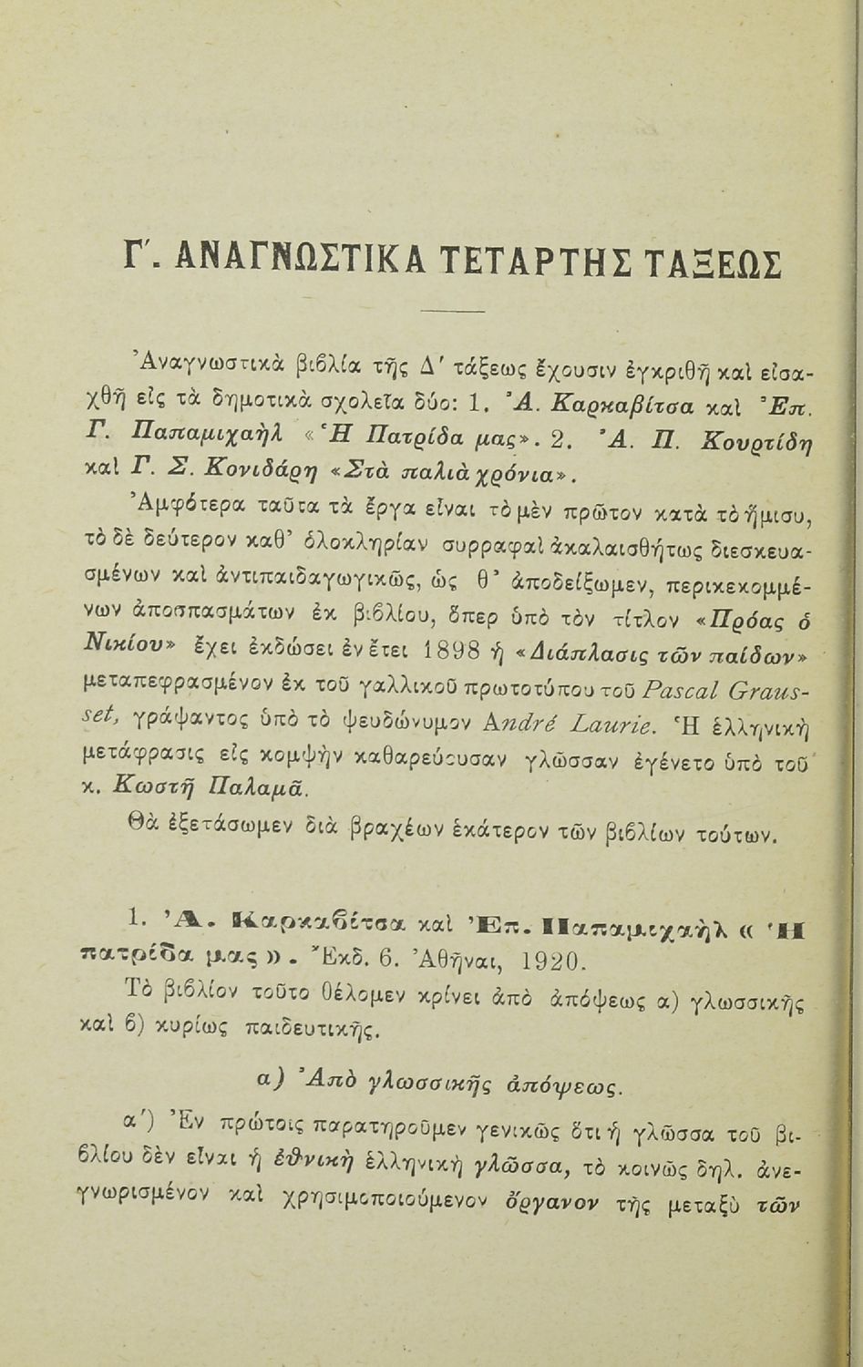 Παρουσίαση περιεχομένου: Εισηγητική έκθεση της επιτροπείας του Υπουργείου Θρησκευμάτων και Παιδείας, την οποία αποτελούσαν καθηγητές ένθερμοι υποστηρικτές της καθαρεύουσας, που εξαπολύει δριμεία κριτική στη γραμματική της δημοτικής και σε συγκεκριμένα αναγνωστικά Δημοτικού. Η γλώσσα είναι ιδιαίτερα σκληρή και επικριτική και χρησιμοποιούνται άκομψοι χαρακτηρισμοί, όπως " άθλιο, χυδαίο περιεχόμενο των αναγνωστικών βιβλίων".