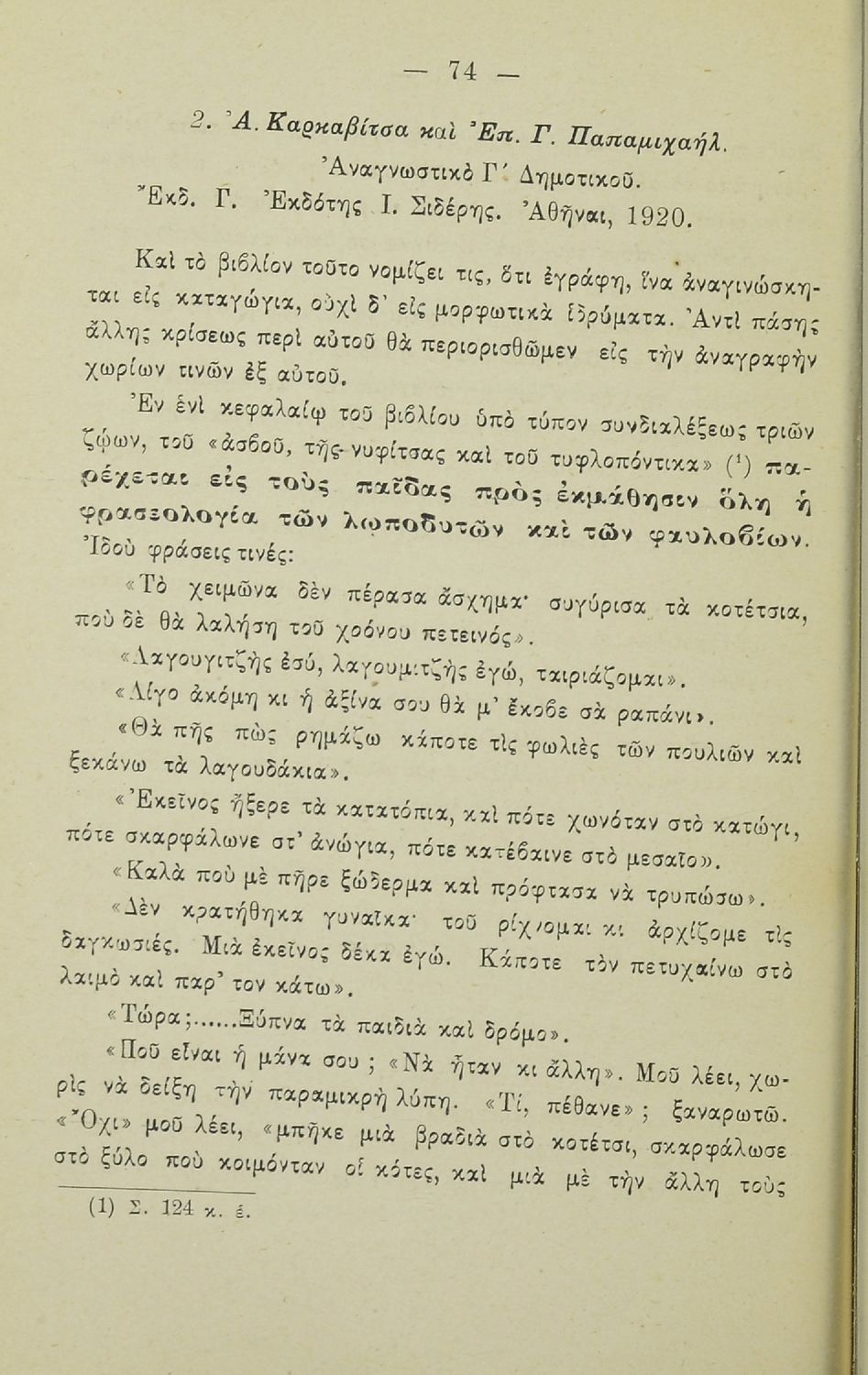 Εισηγητική έκθεση της επιτροπείας του Υπουργείου Θρησκευμάτων και Παιδείας, την οποία αποτελούσαν καθηγητές ένθερμοι υποστηρικτές της καθαρεύουσας, που εξαπολύει δριμεία κριτική στη γραμματική της δημοτικής και σε συγκεκριμένα αναγνωστικά Δημοτικού. Η γλώσσα είναι ιδιαίτερα σκληρή και επικριτική και χρησιμοποιούνται άκομψοι χαρακτηρισμοί, όπως " άθλιο, χυδαίο περιεχόμενο των αναγνωστικών βιβλίων".