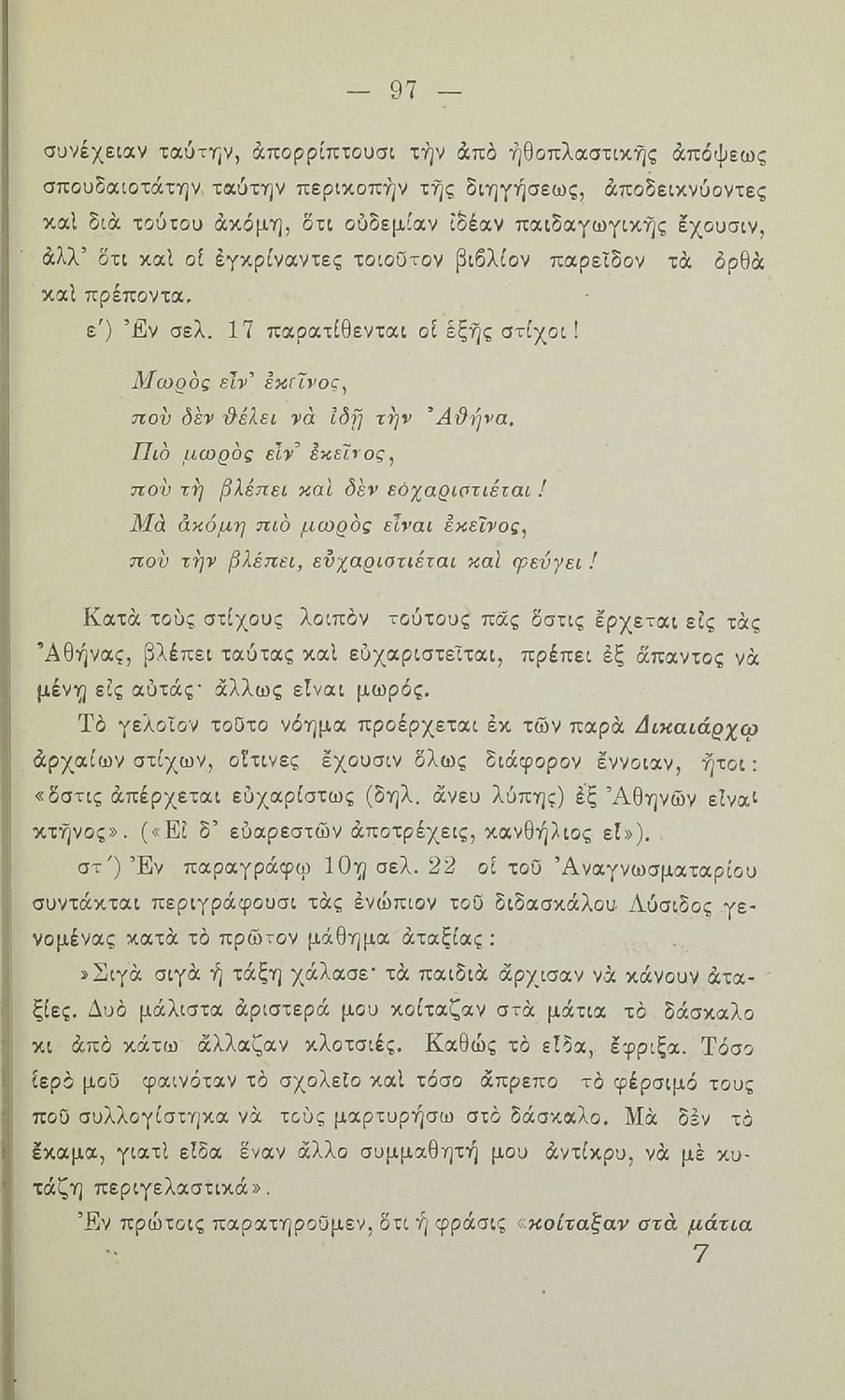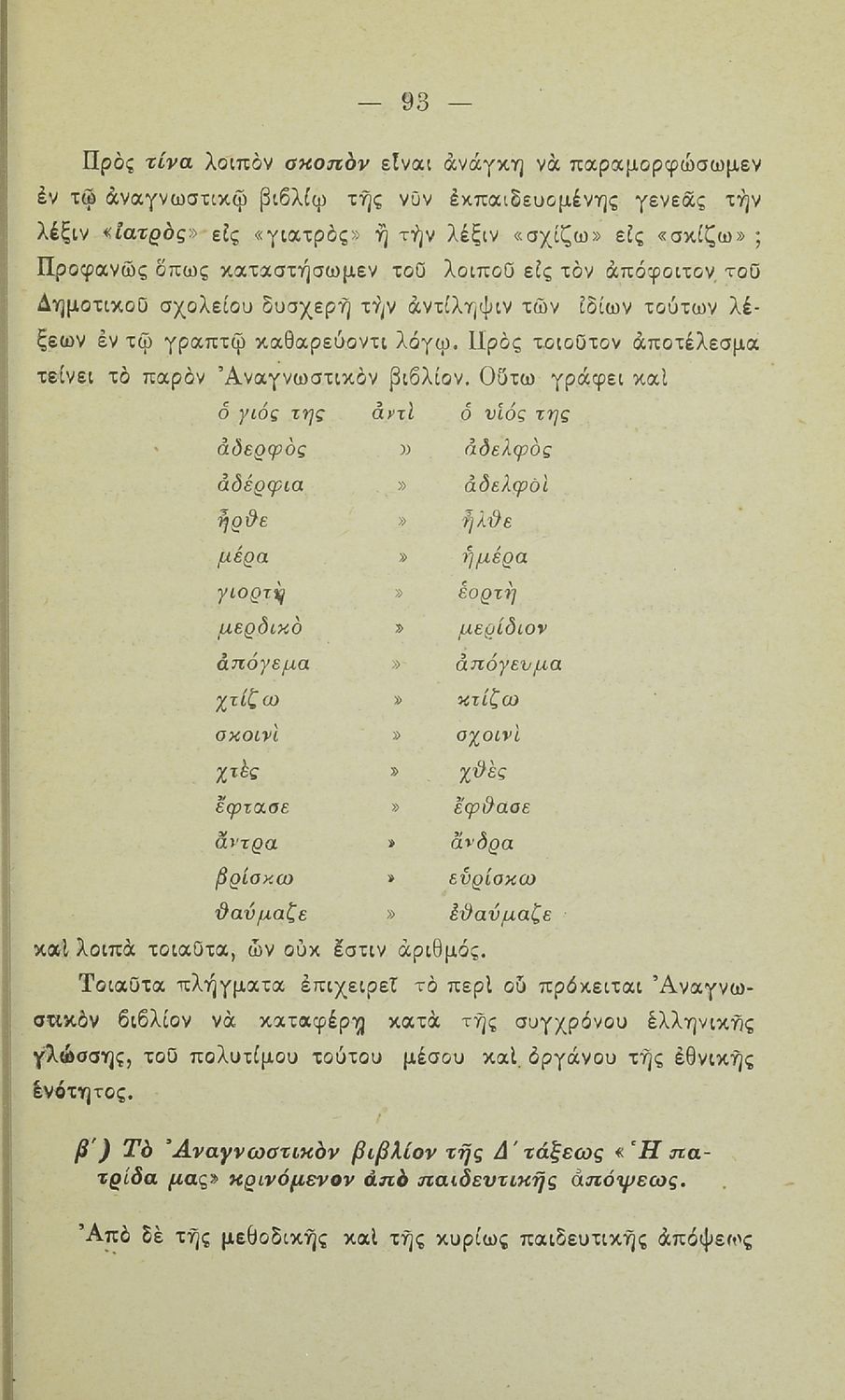 Εισηγητική έκθεση της επιτροπείας του Υπουργείου Θρησκευμάτων και Παιδείας, την οποία αποτελούσαν καθηγητές ένθερμοι υποστηρικτές της καθαρεύουσας, που εξαπολύει δριμεία κριτική στη γραμματική της δημοτικής και σε συγκεκριμένα αναγνωστικά Δημοτικού. Η γλώσσα είναι ιδιαίτερα σκληρή και επικριτική και χρησιμοποιούνται άκομψοι χαρακτηρισμοί, όπως " άθλιο, χυδαίο περιεχόμενο των αναγνωστικών βιβλίων".