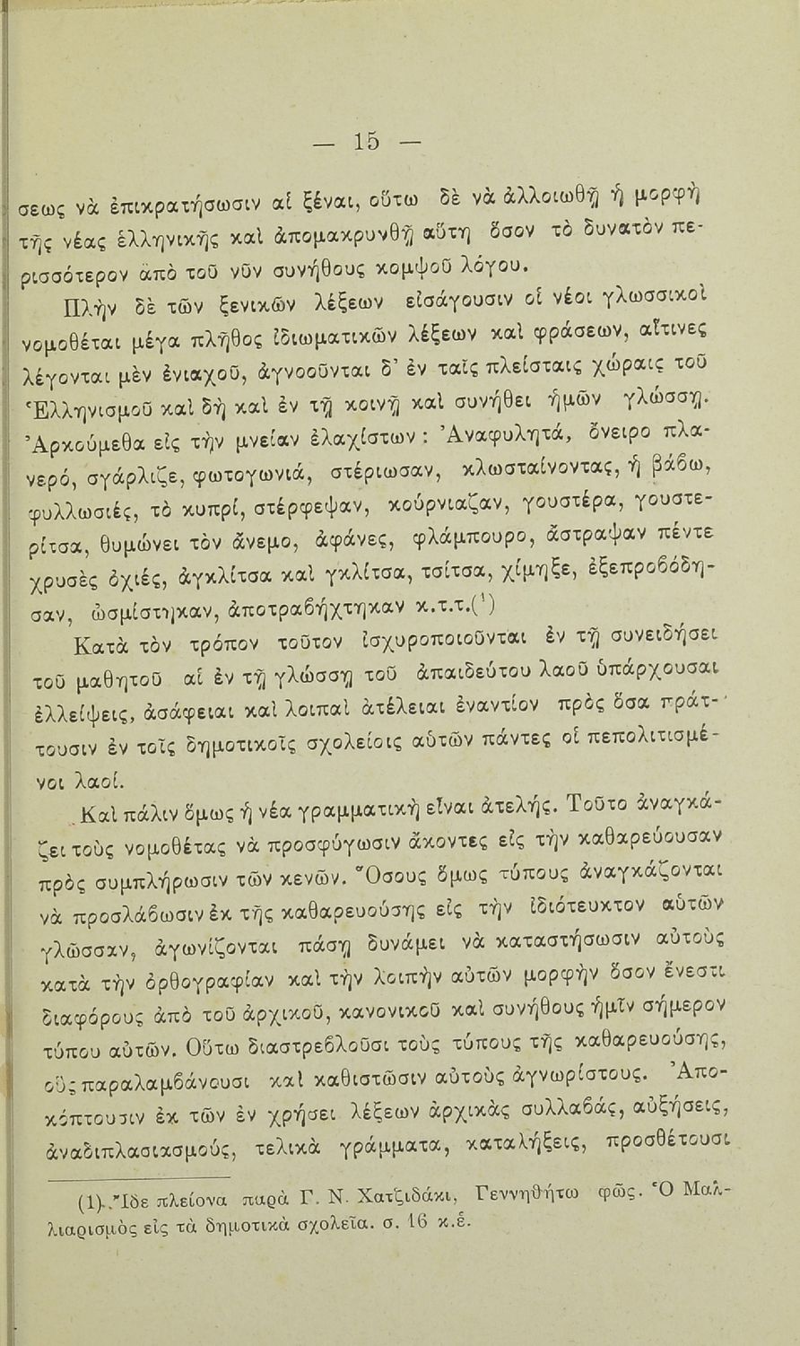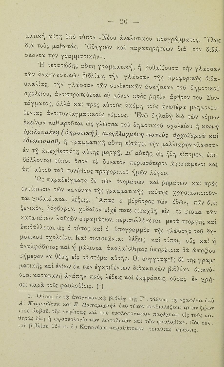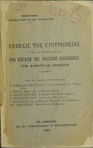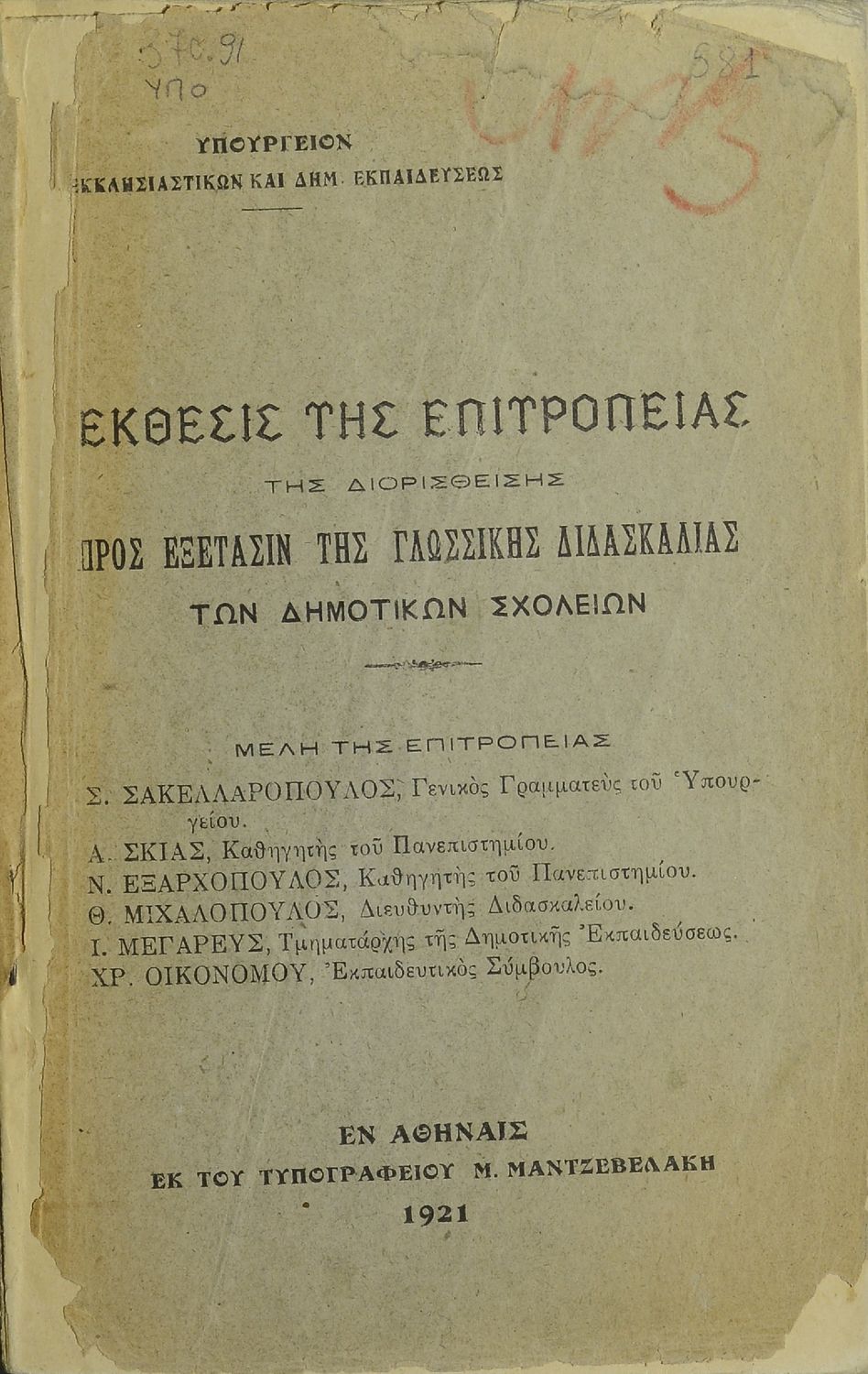 Εισηγητική έκθεση της επιτροπείας του Υπουργείου Θρησκευμάτων και Παιδείας, την οποία αποτελούσαν καθηγητές ένθερμοι υποστηρικτές της καθαρεύουσας, που εξαπολύει δριμεία κριτική στη γραμματική της δημοτικής και σε συγκεκριμένα αναγνωστικά Δημοτικού. Η γλώσσα είναι ιδιαίτερα σκληρή και επικριτική και χρησιμοποιούνται άκομψοι χαρακτηρισμοί, όπως " άθλιο, χυδαίο περιεχόμενο των αναγνωστικών βιβλίων".