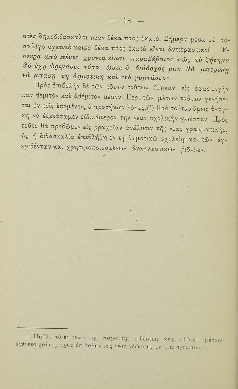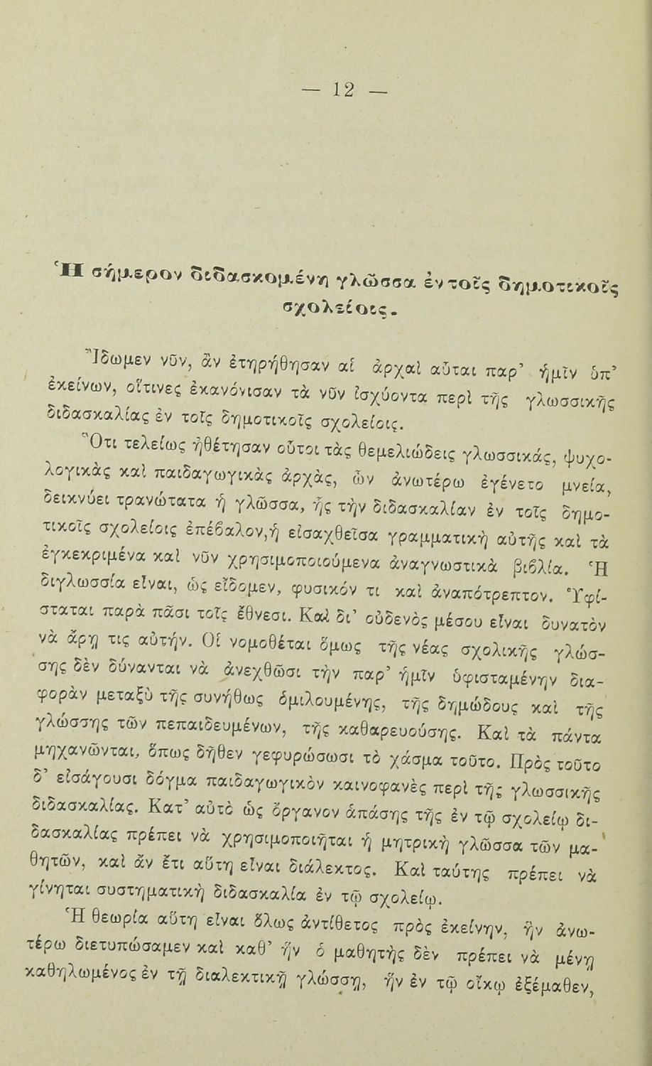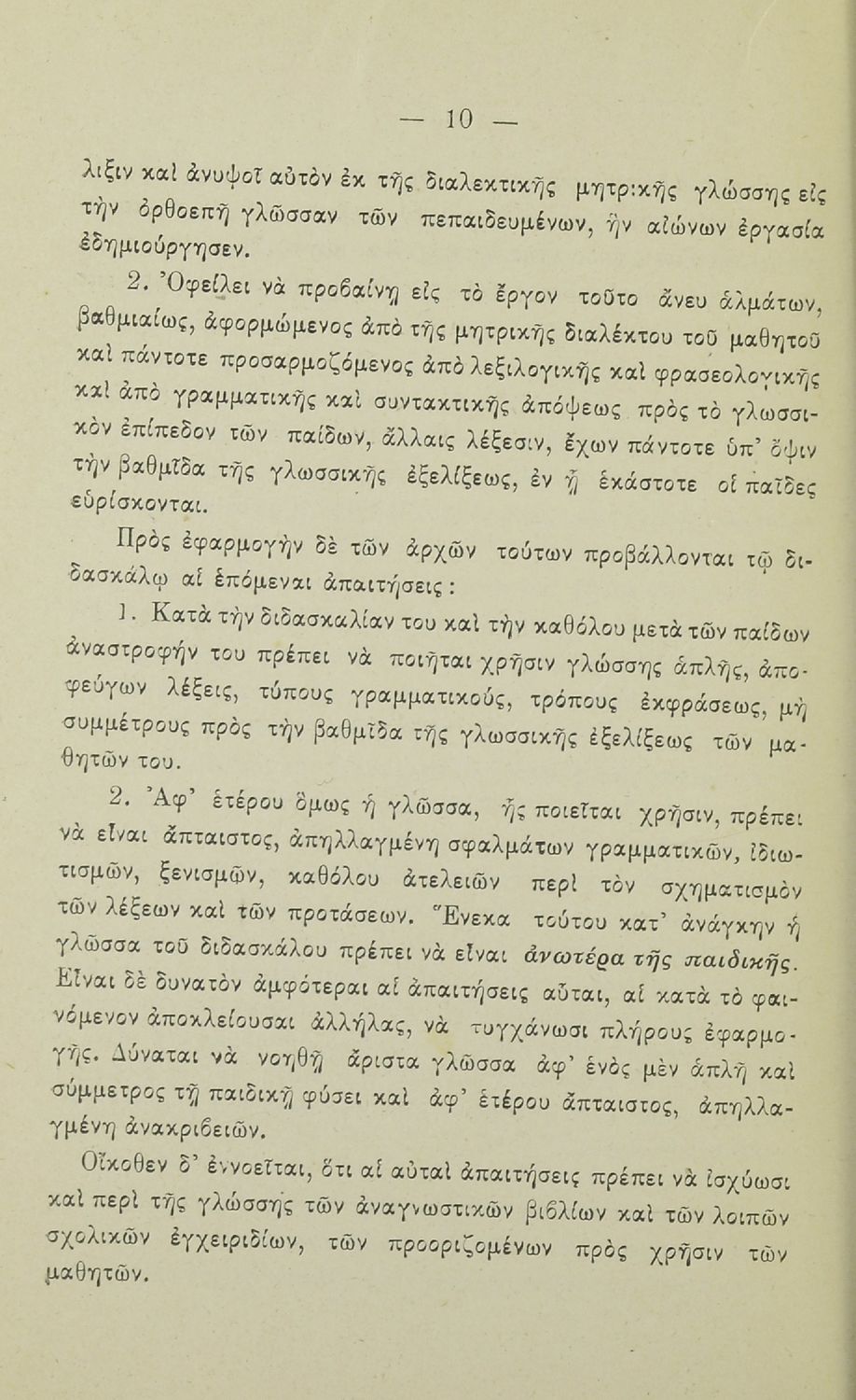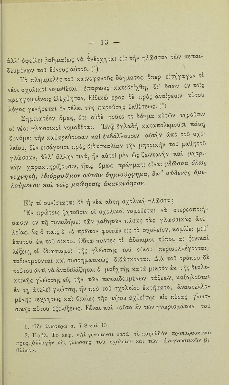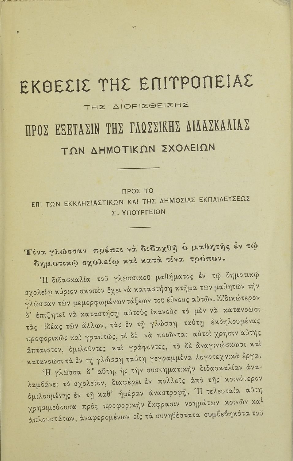 Γλώσσα: Καθαρεύουσα Παρουσίαση περιεχομένου: Εισηγητική έκθεση της επιτροπείας του Υπουργείου Θρησκευμάτων και Παιδείας, την οποία αποτελούσαν καθηγητές ένθερμοι υποστηρικτές της καθαρεύουσας, που εξαπολύει δριμεία κριτική στη γραμματική της δημοτικής και σε συγκεκριμένα αναγνωστικά Δημοτικού. Η γλώσσα είναι ιδιαίτερα σκληρή και επικριτική και χρησιμοποιούνται άκομψοι χαρακτηρισμοί, όπως " άθλιο, χυδαίο περιεχόμενο των αναγνωστικών βιβλίων". |