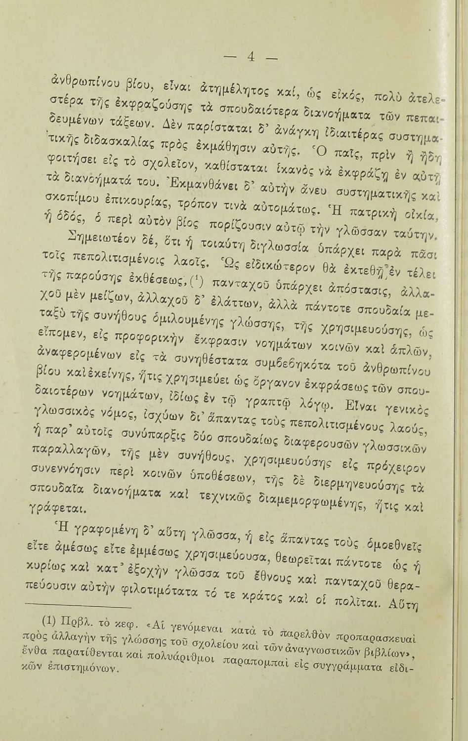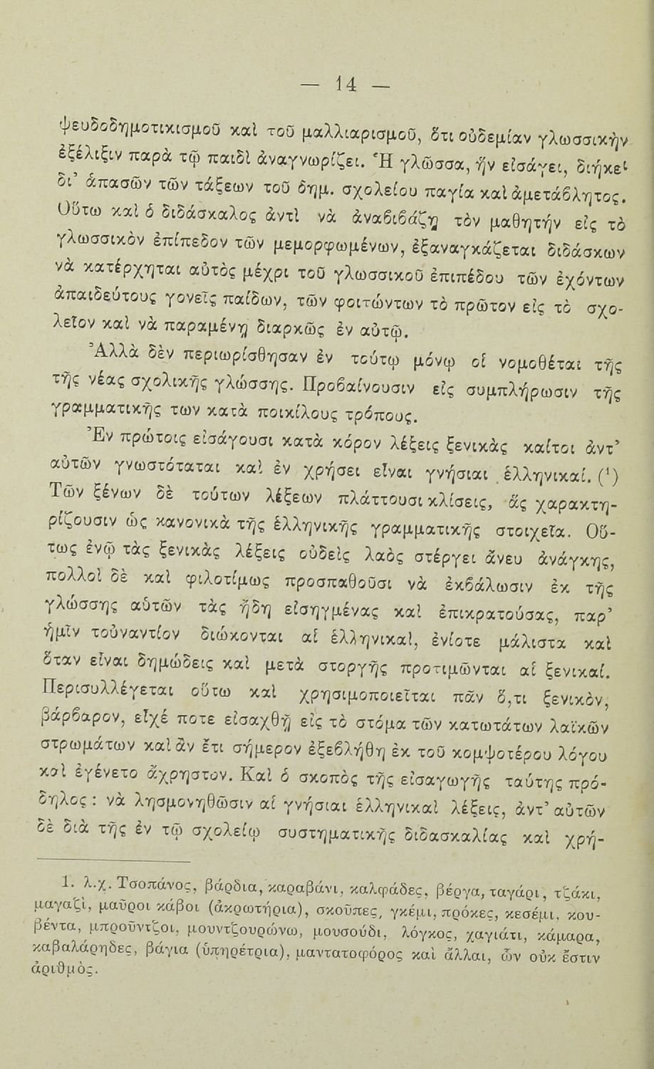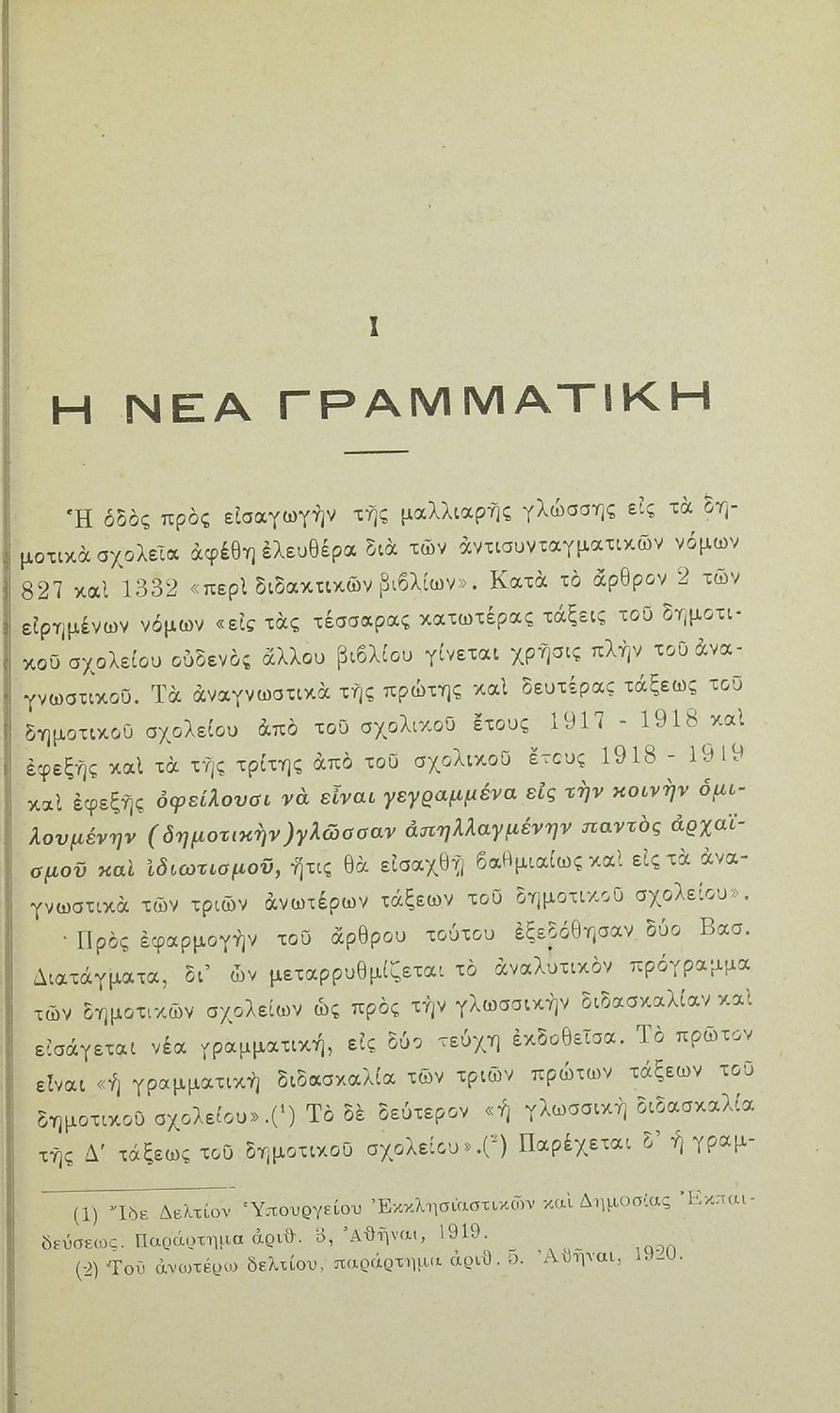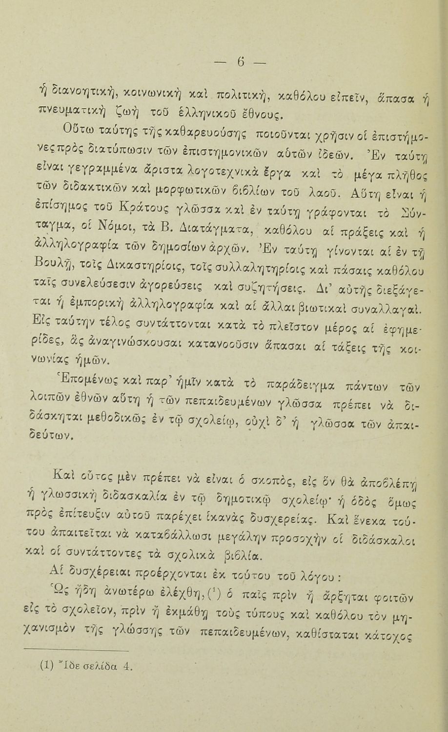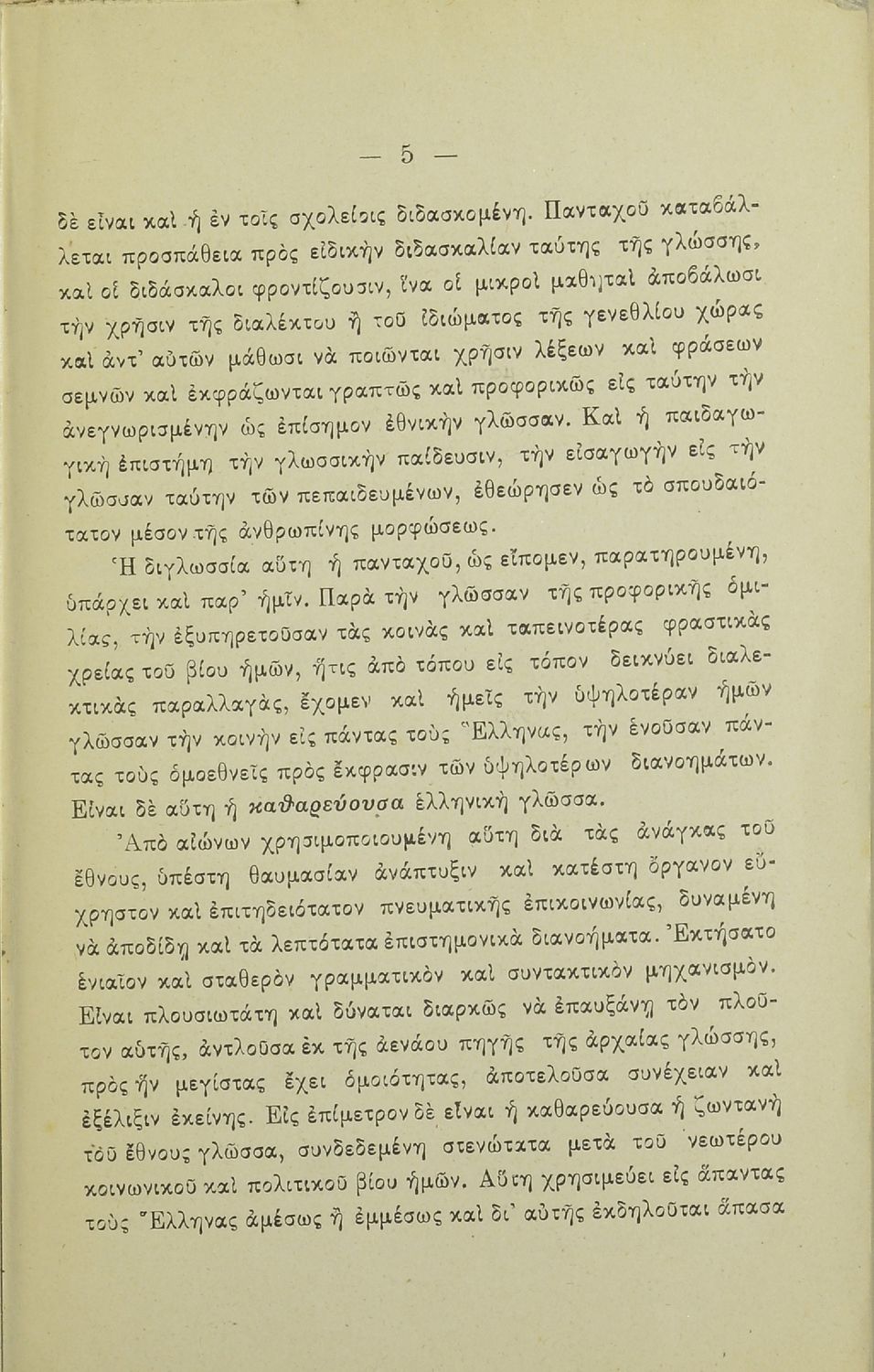 Γλώσσα: Καθαρεύουσα Παρουσίαση περιεχομένου: Εισηγητική έκθεση της επιτροπείας του Υπουργείου Θρησκευμάτων και Παιδείας, την οποία αποτελούσαν καθηγητές ένθερμοι υποστηρικτές της καθαρεύουσας, που εξαπολύει δριμεία κριτική στη γραμματική της δημοτικής και σε συγκεκριμένα αναγνωστικά Δημοτικού. Η γλώσσα είναι ιδιαίτερα σκληρή και επικριτική και χρησιμοποιούνται άκομψοι χαρακτηρισμοί, όπως " άθλιο, χυδαίο περιεχόμενο των αναγνωστικών βιβλίων". |