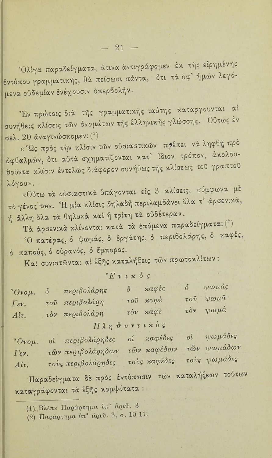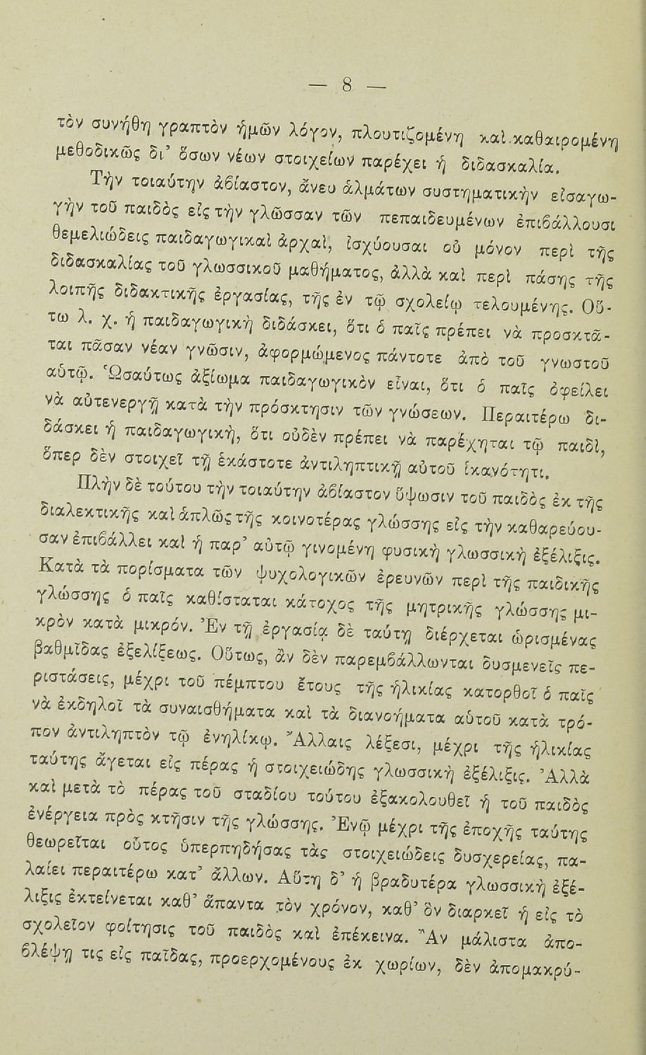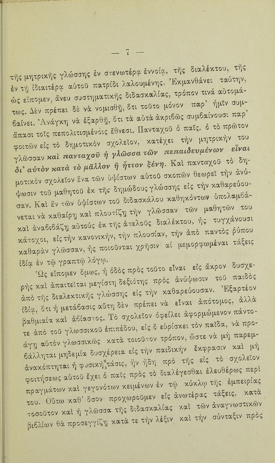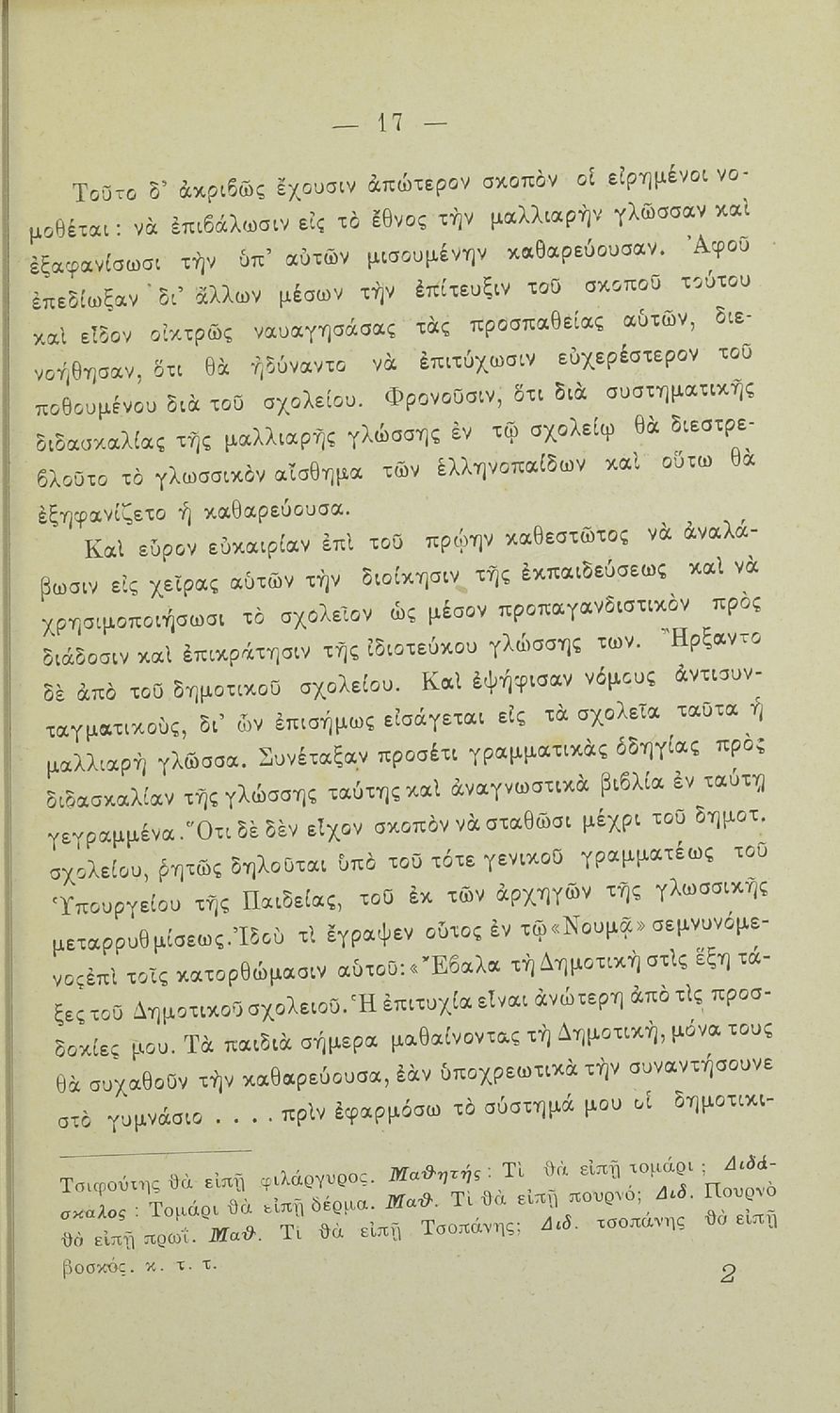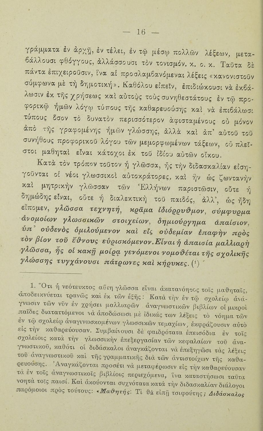 Γλώσσα: Καθαρεύουσα Παρουσίαση περιεχομένου: Εισηγητική έκθεση της επιτροπείας του Υπουργείου Θρησκευμάτων και Παιδείας, την οποία αποτελούσαν καθηγητές ένθερμοι υποστηρικτές της καθαρεύουσας, που εξαπολύει δριμεία κριτική στη γραμματική της δημοτικής και σε συγκεκριμένα αναγνωστικά Δημοτικού. Η γλώσσα είναι ιδιαίτερα σκληρή και επικριτική και χρησιμοποιούνται άκομψοι χαρακτηρισμοί, όπως " άθλιο, χυδαίο περιεχόμενο των αναγνωστικών βιβλίων". |