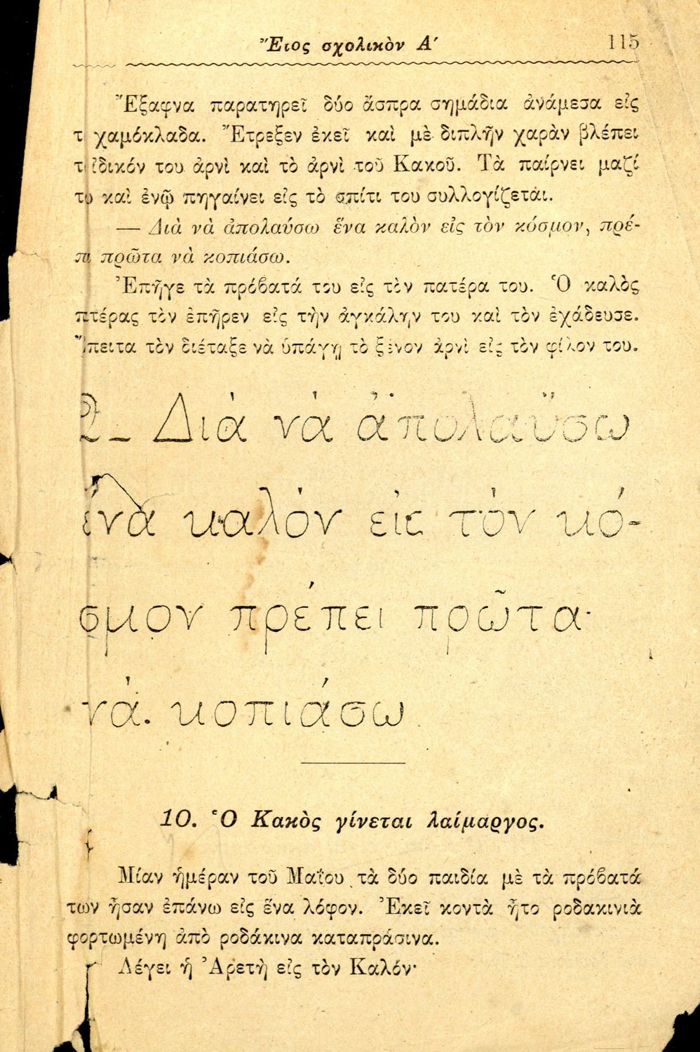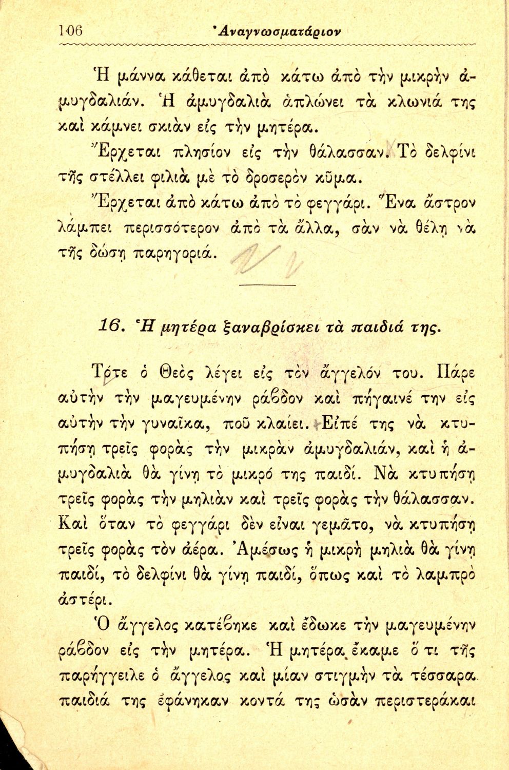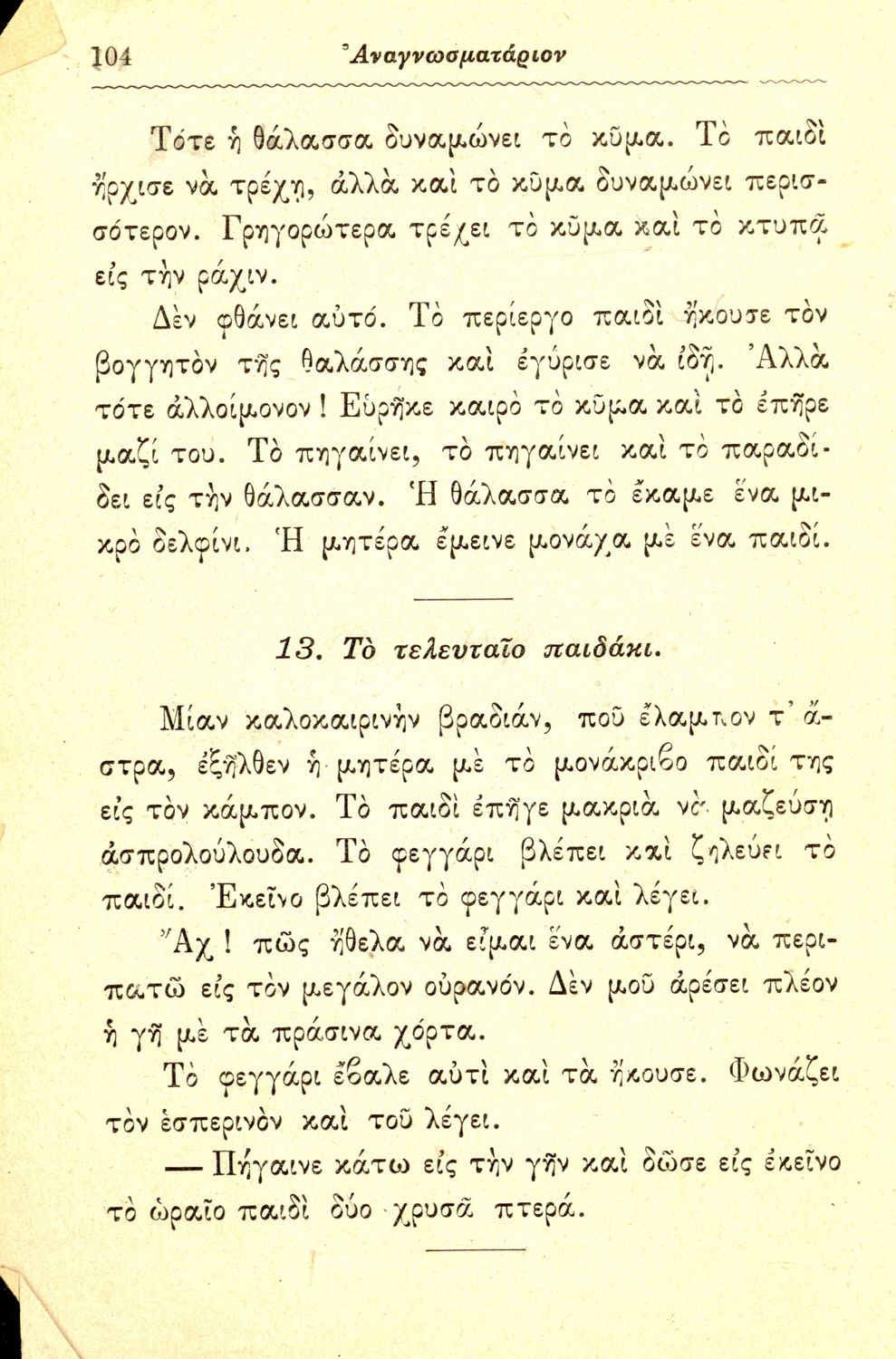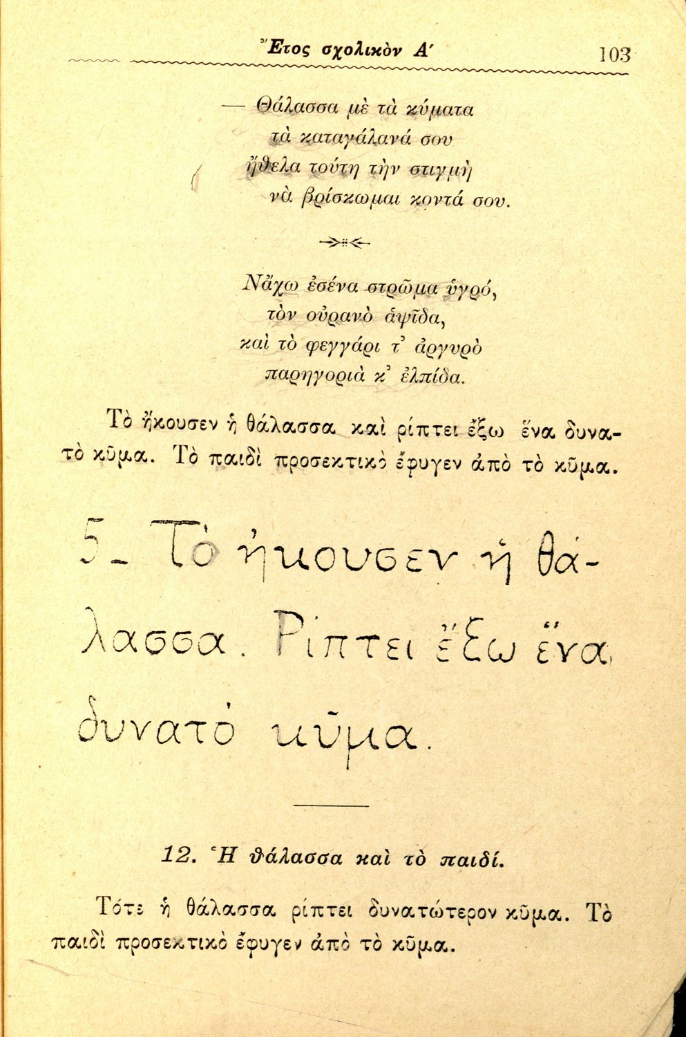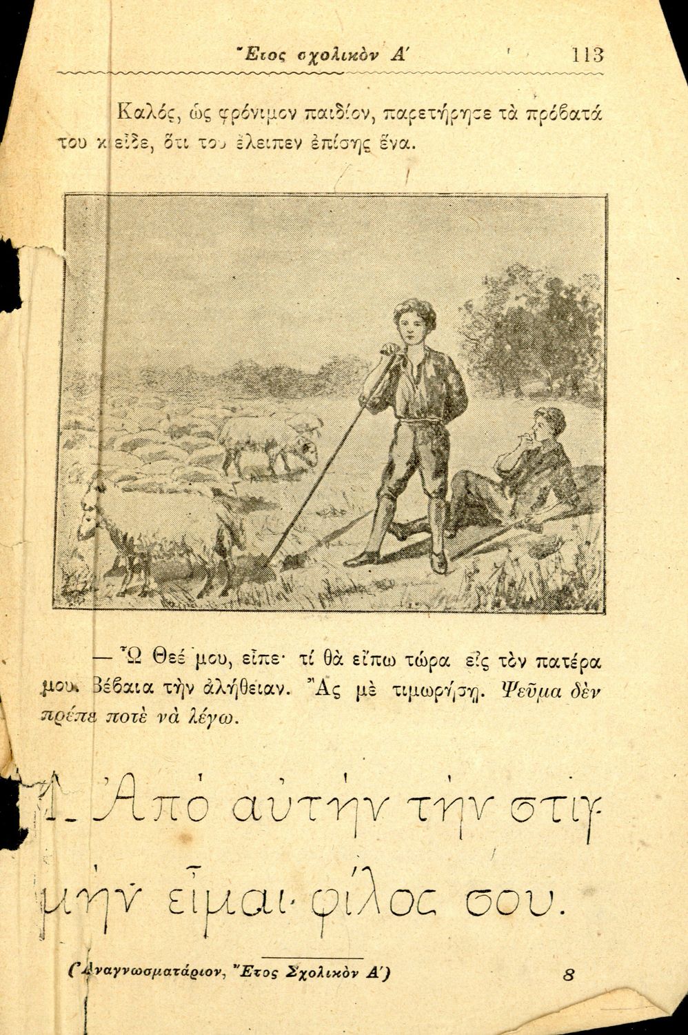 Βαθμίδα εκπαίδευσης: Πρωτοβάθμια Τάξη: Α' Δημοτικού Μάθημα: Νέα Ελληνικά Γλώσσα: Απλή καθαρεύουσα Παρουσίαση περιεχομένου: Αναγνωστικό Α΄ Δημοτικού που περιλαμβάνει εικόνες και γράμματα για την εκμάθηση του ελληνικού αλφάβητου και μικρές ιστορίες με θέματα από την οικογενειακή ζωή, τον κόσμο των ζώων, των φυτών, των εποχών και της θρησκευτικής παράδοσης. |