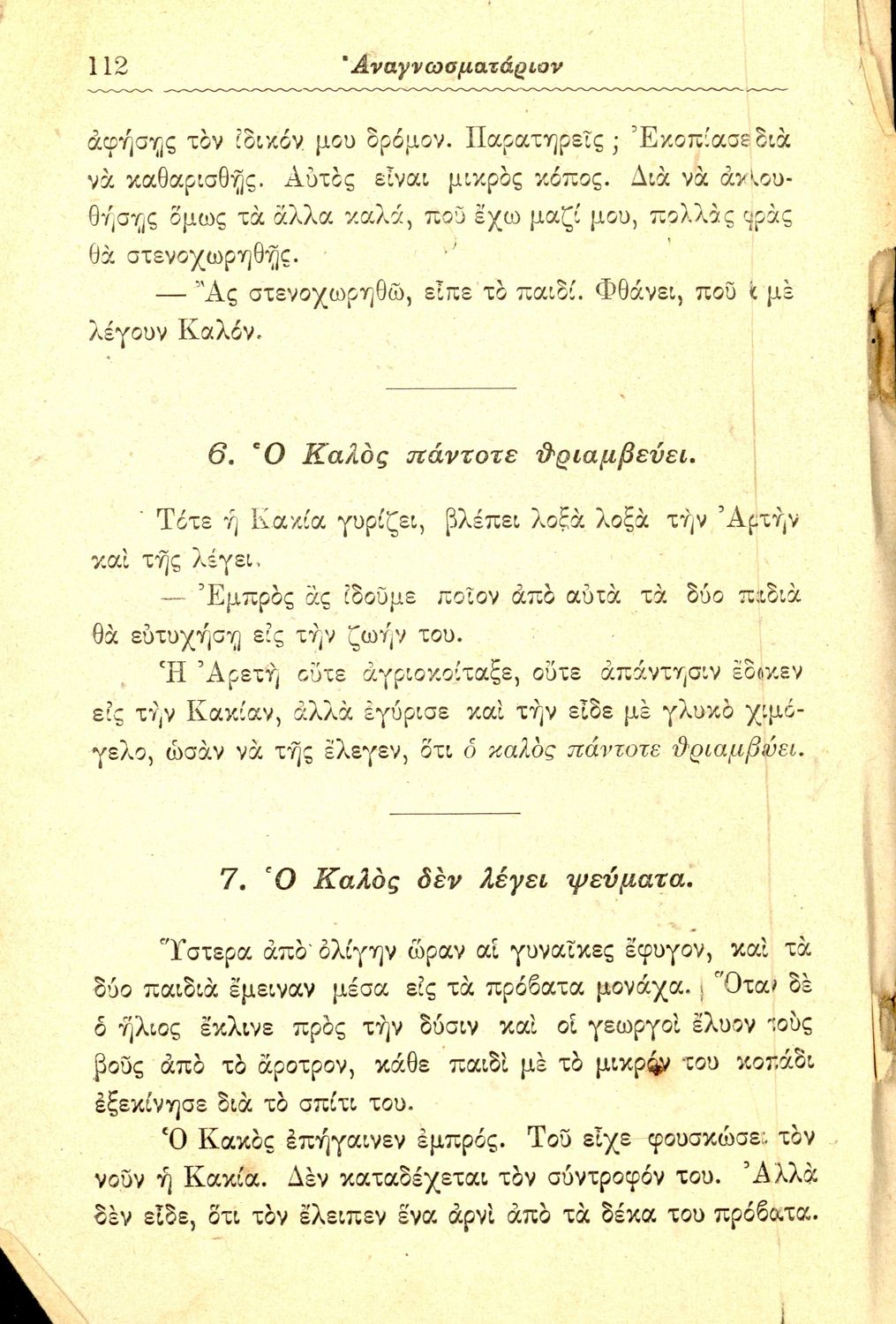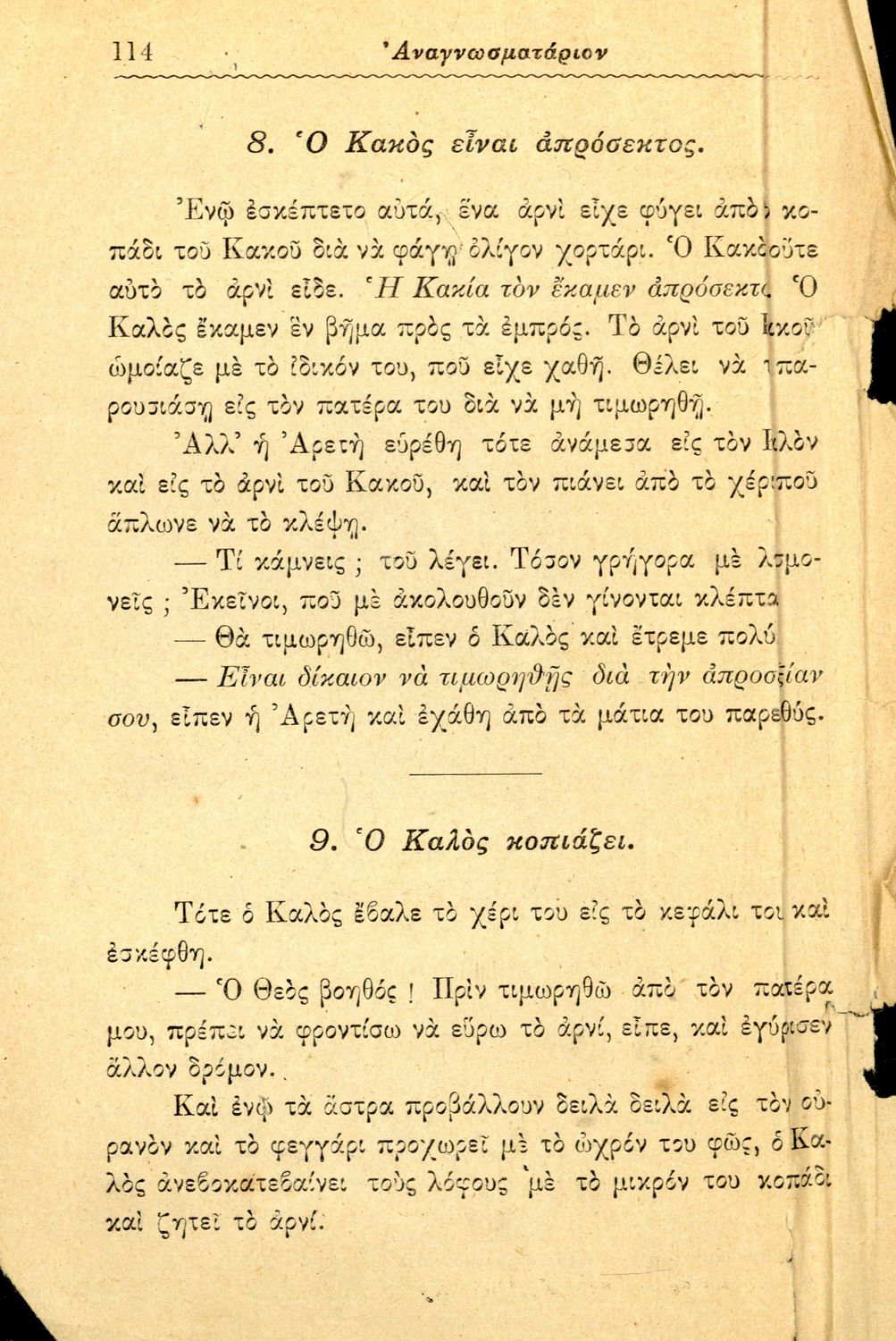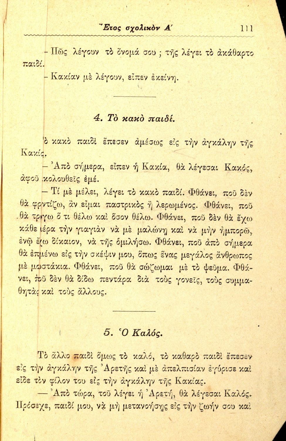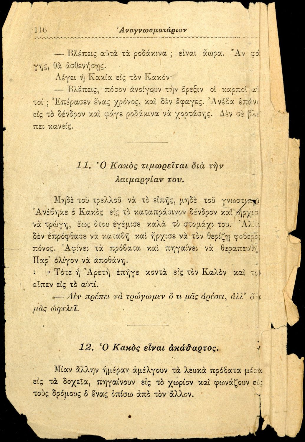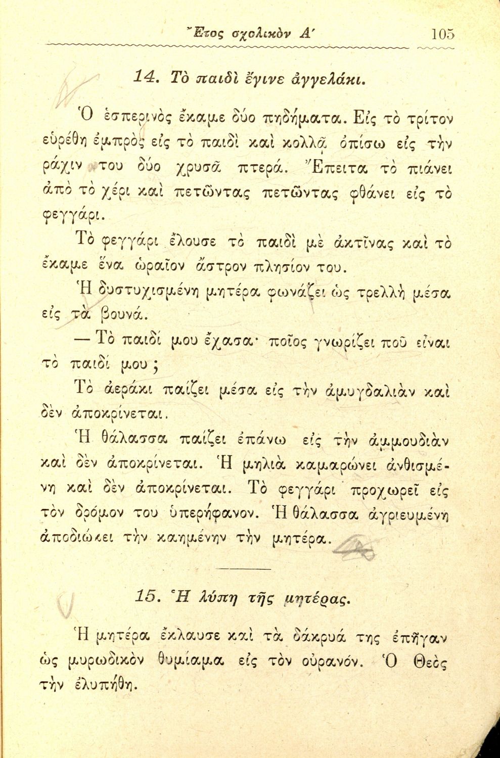 Βαθμίδα εκπαίδευσης: Πρωτοβάθμια Τάξη: Α' Δημοτικού Μάθημα: Νέα Ελληνικά Γλώσσα: Απλή καθαρεύουσα Παρουσίαση περιεχομένου: Αναγνωστικό Α΄ Δημοτικού που περιλαμβάνει εικόνες και γράμματα για την εκμάθηση του ελληνικού αλφάβητου και μικρές ιστορίες με θέματα από την οικογενειακή ζωή, τον κόσμο των ζώων, των φυτών, των εποχών και της θρησκευτικής παράδοσης. |