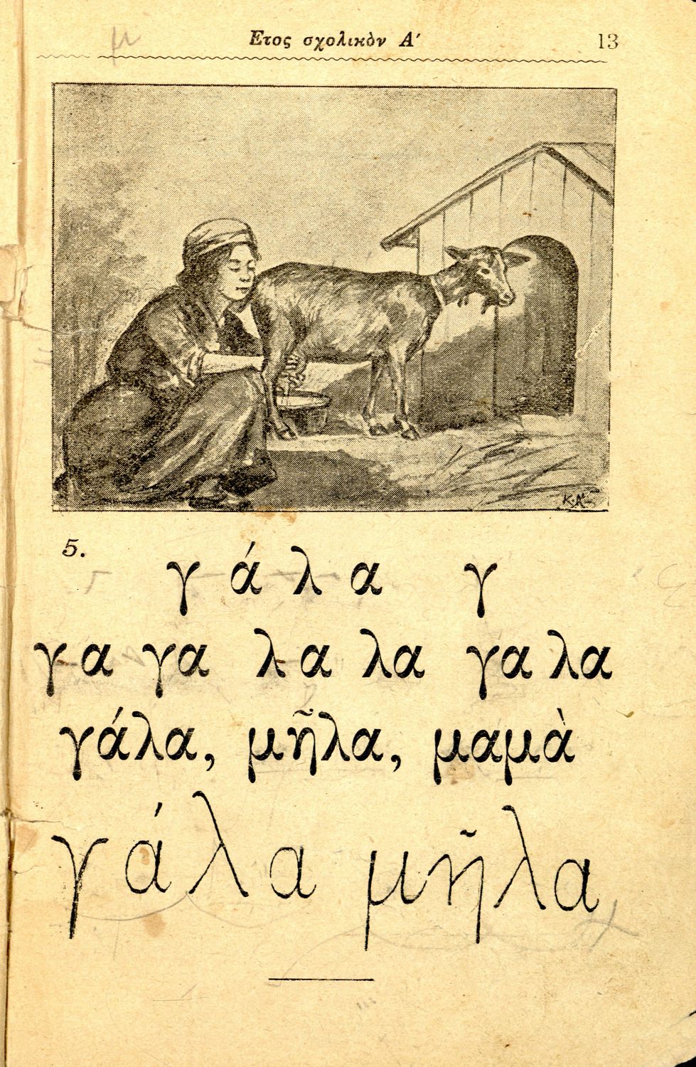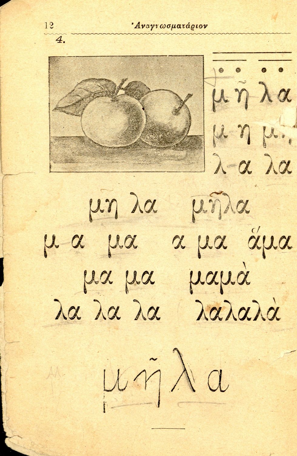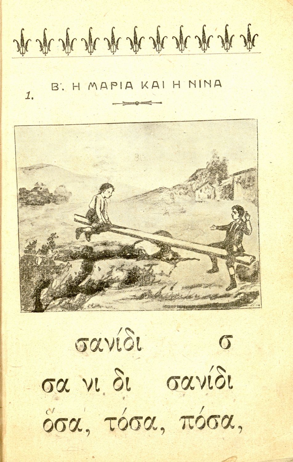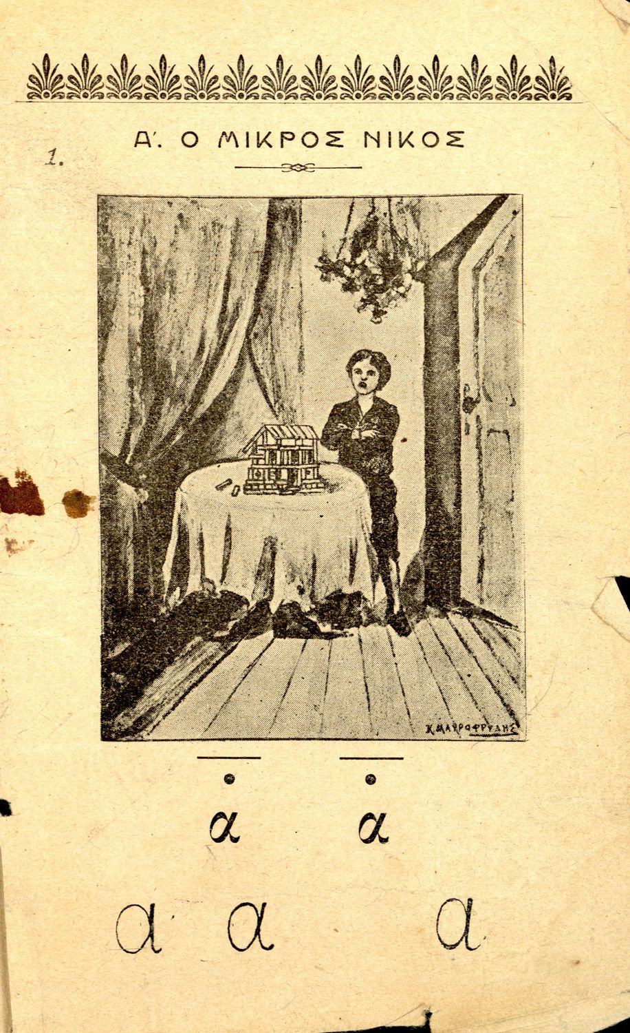 Βαθμίδα εκπαίδευσης: Πρωτοβάθμια Τάξη: Α' Δημοτικού Μάθημα: Νέα Ελληνικά Γλώσσα: Απλή καθαρεύουσα Παρουσίαση περιεχομένου: Αναγνωστικό Α΄ Δημοτικού που περιλαμβάνει εικόνες και γράμματα για την εκμάθηση του ελληνικού αλφάβητου και μικρές ιστορίες με θέματα από την οικογενειακή ζωή, τον κόσμο των ζώων, των φυτών, των εποχών και της θρησκευτικής παράδοσης. |