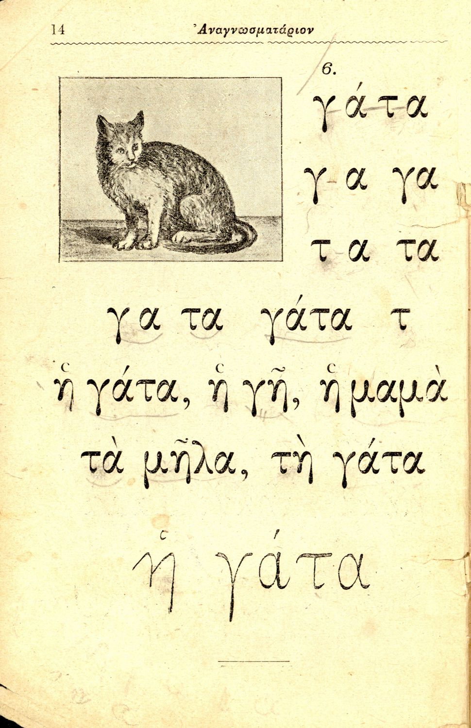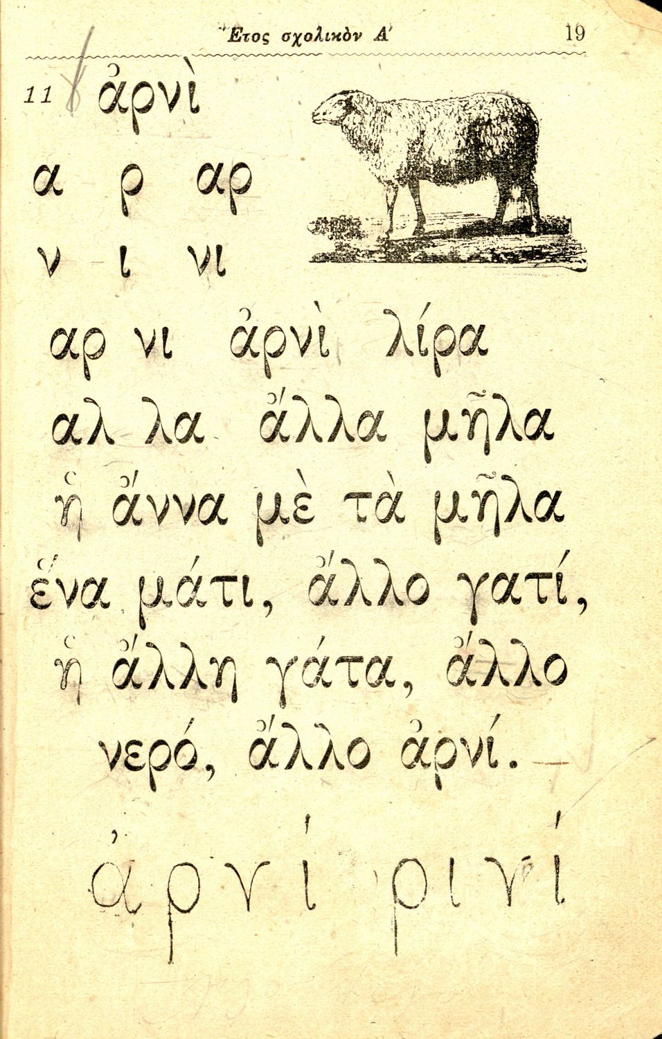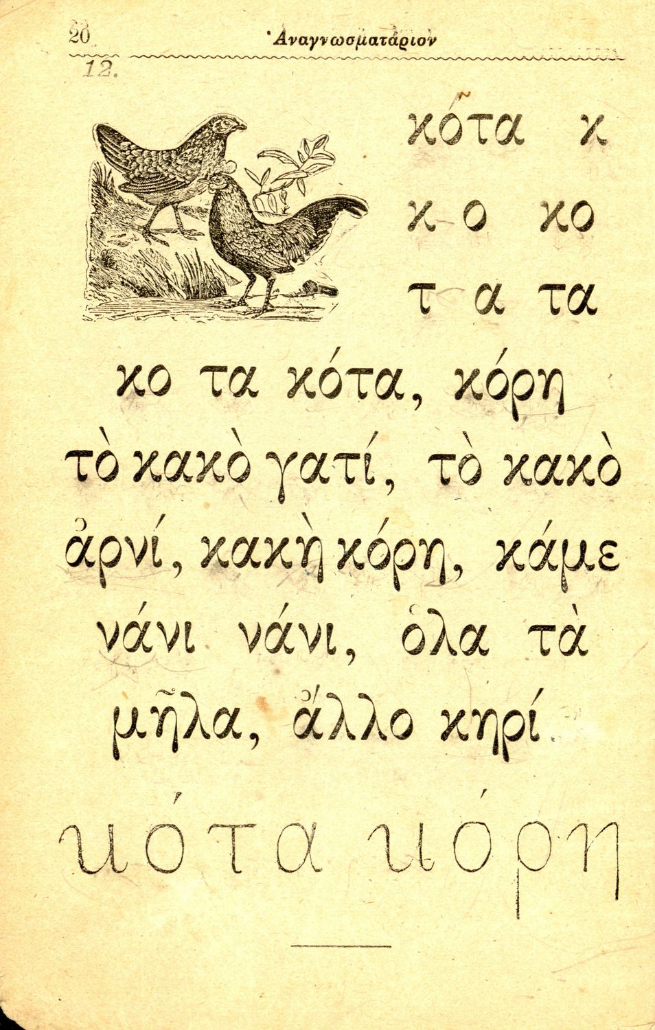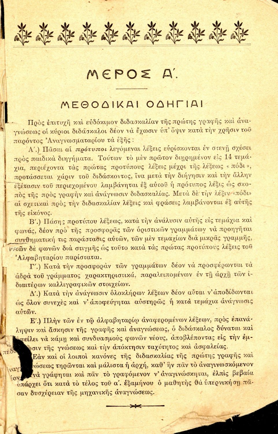 Βαθμίδα εκπαίδευσης: Πρωτοβάθμια Τάξη: Α' Δημοτικού Μάθημα: Νέα Ελληνικά Γλώσσα: Απλή καθαρεύουσα Παρουσίαση περιεχομένου: Αναγνωστικό Α΄ Δημοτικού που περιλαμβάνει εικόνες και γράμματα για την εκμάθηση του ελληνικού αλφάβητου και μικρές ιστορίες με θέματα από την οικογενειακή ζωή, τον κόσμο των ζώων, των φυτών, των εποχών και της θρησκευτικής παράδοσης. |