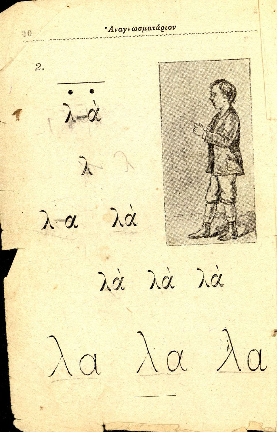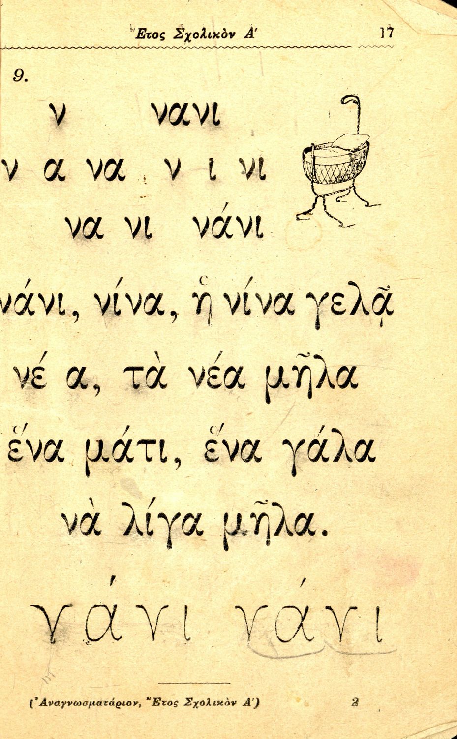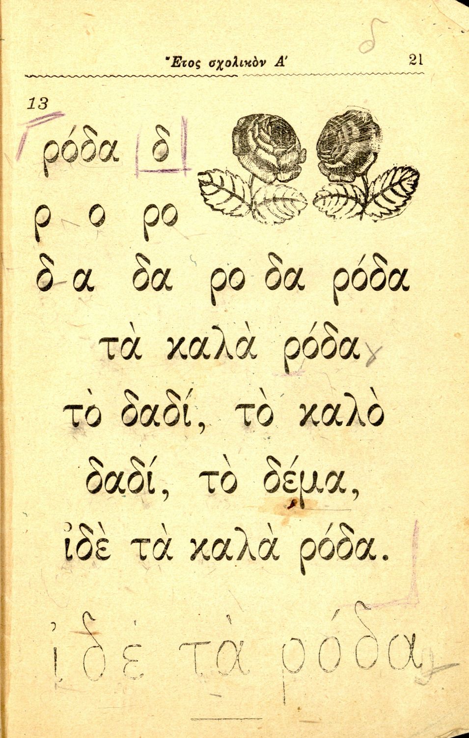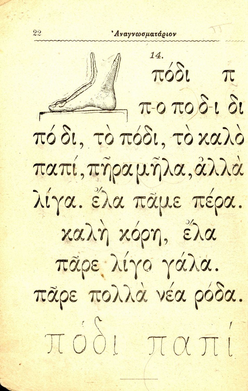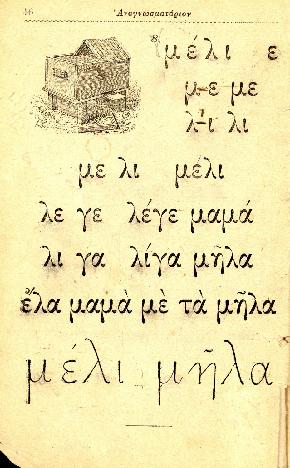 Βαθμίδα εκπαίδευσης: Πρωτοβάθμια Τάξη: Α' Δημοτικού Μάθημα: Νέα Ελληνικά Γλώσσα: Απλή καθαρεύουσα Παρουσίαση περιεχομένου: Αναγνωστικό Α΄ Δημοτικού που περιλαμβάνει εικόνες και γράμματα για την εκμάθηση του ελληνικού αλφάβητου και μικρές ιστορίες με θέματα από την οικογενειακή ζωή, τον κόσμο των ζώων, των φυτών, των εποχών και της θρησκευτικής παράδοσης. |