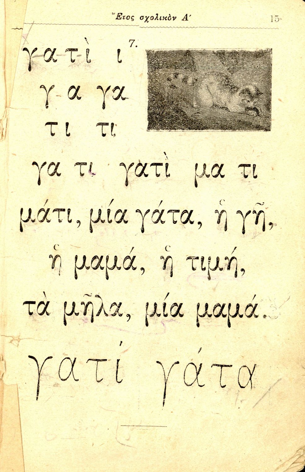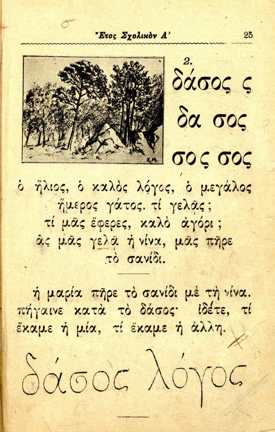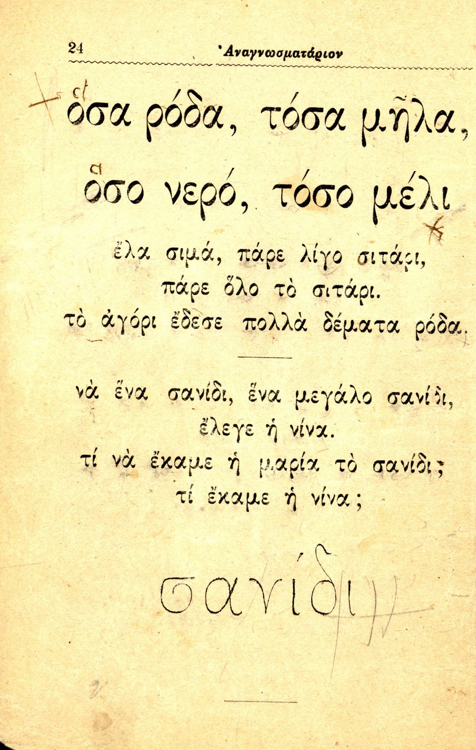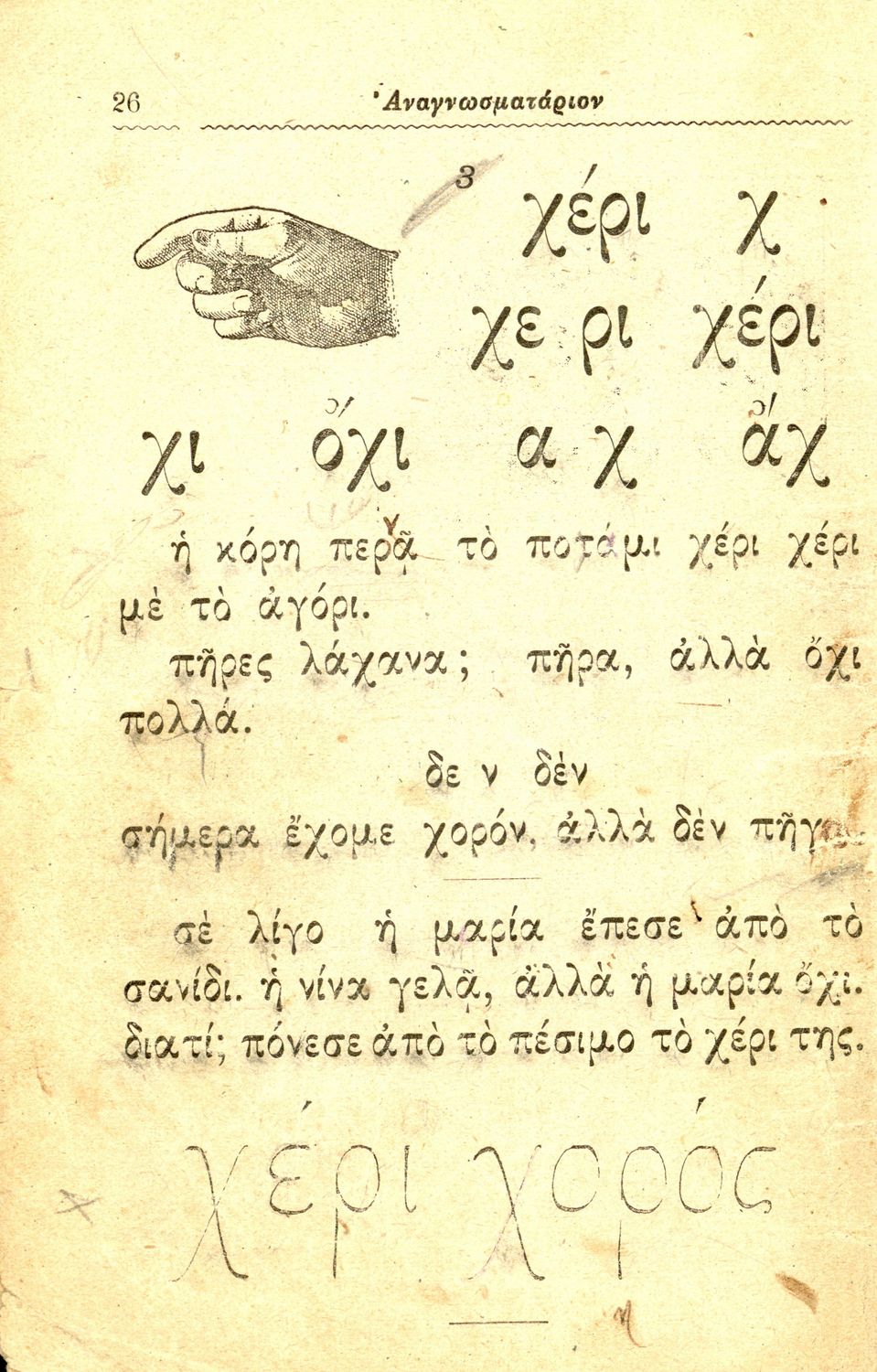 Βαθμίδα εκπαίδευσης: Πρωτοβάθμια Τάξη: Α' Δημοτικού Μάθημα: Νέα Ελληνικά Γλώσσα: Απλή καθαρεύουσα Παρουσίαση περιεχομένου: Αναγνωστικό Α΄ Δημοτικού που περιλαμβάνει εικόνες και γράμματα για την εκμάθηση του ελληνικού αλφάβητου και μικρές ιστορίες με θέματα από την οικογενειακή ζωή, τον κόσμο των ζώων, των φυτών, των εποχών και της θρησκευτικής παράδοσης. |