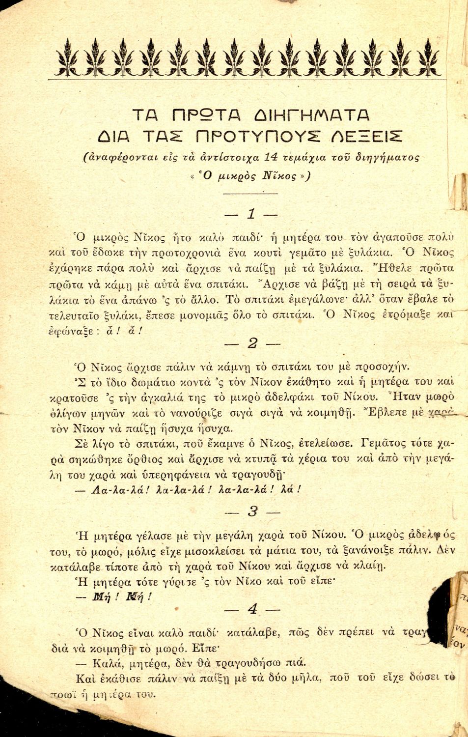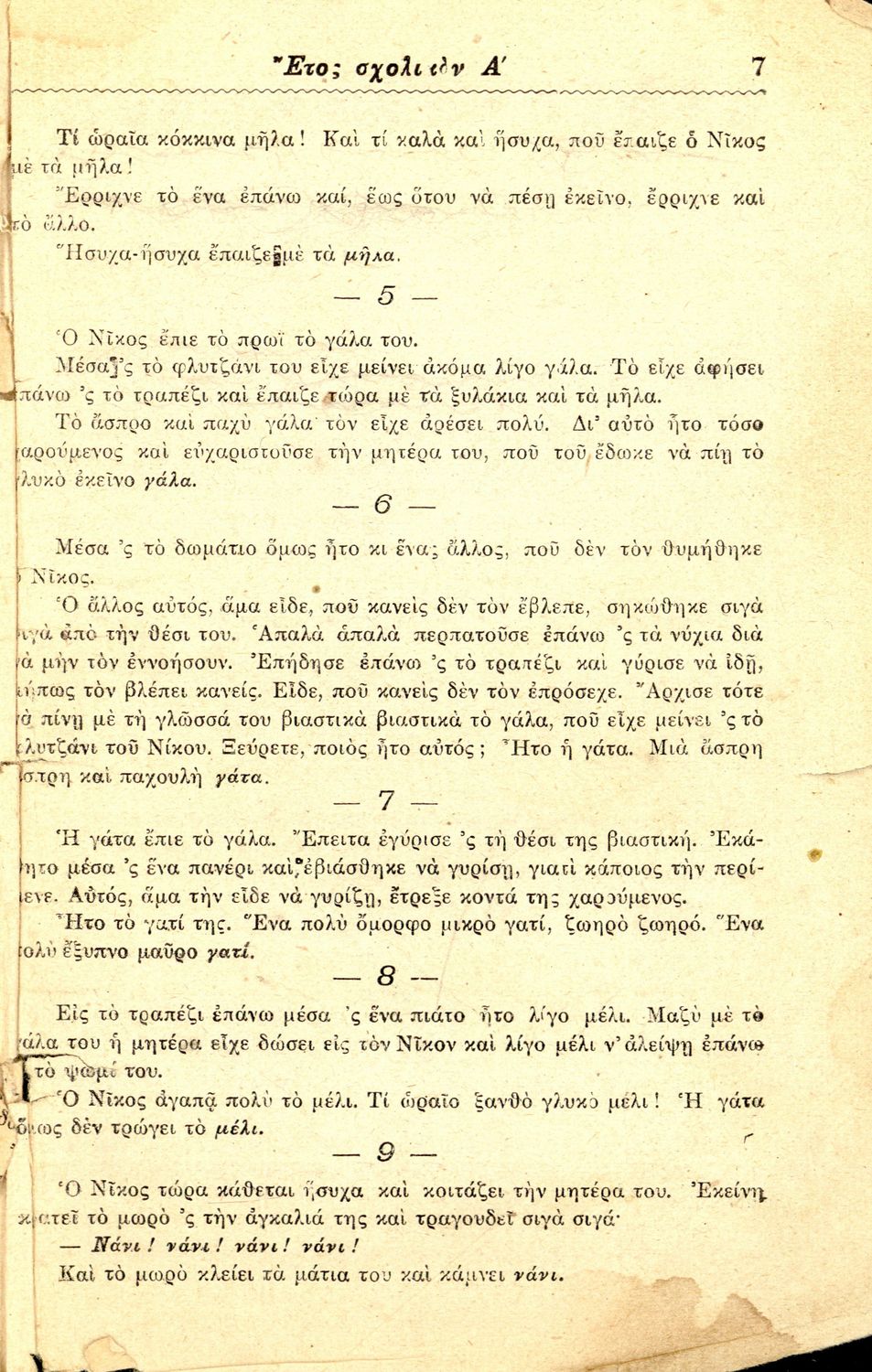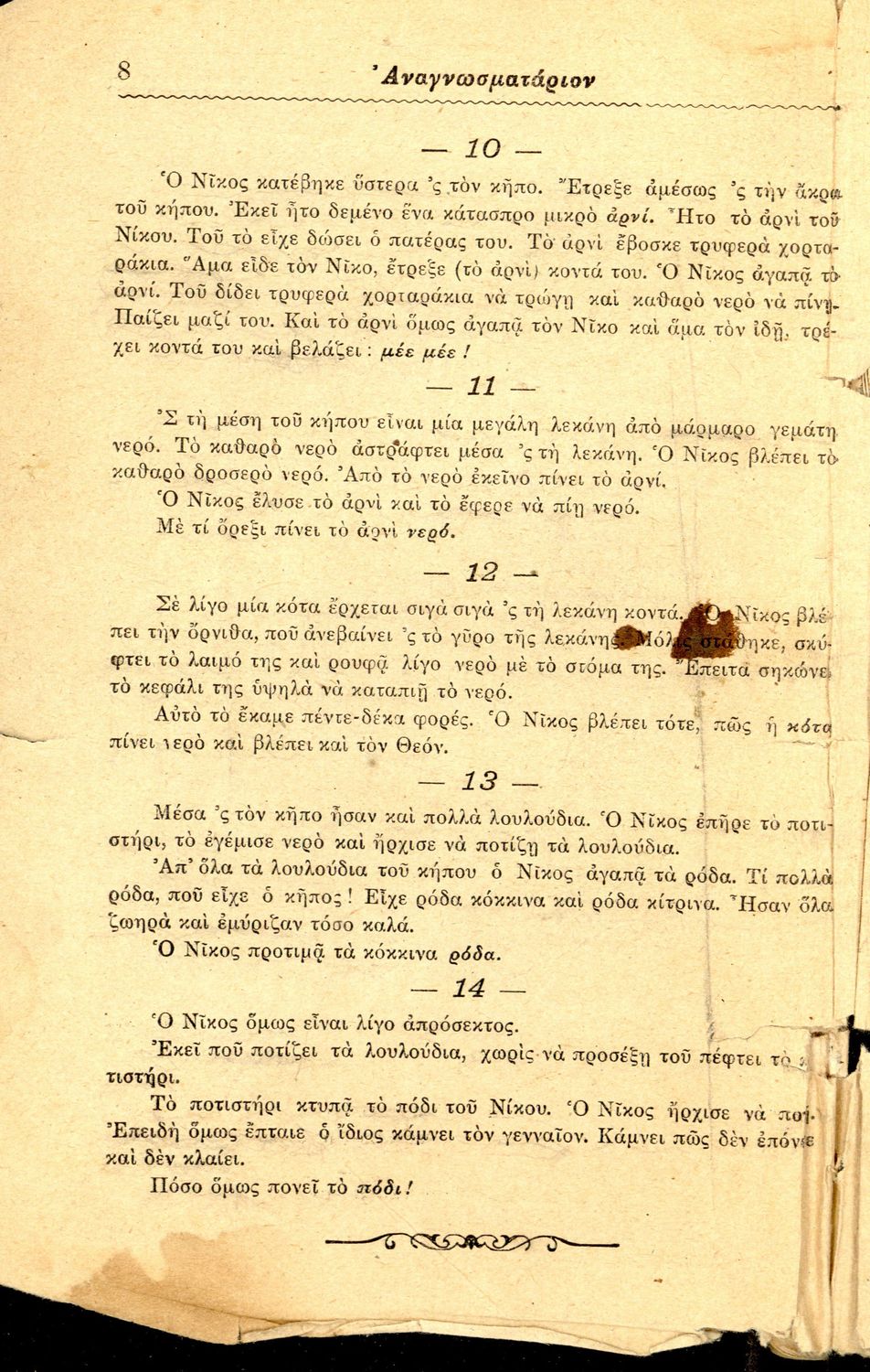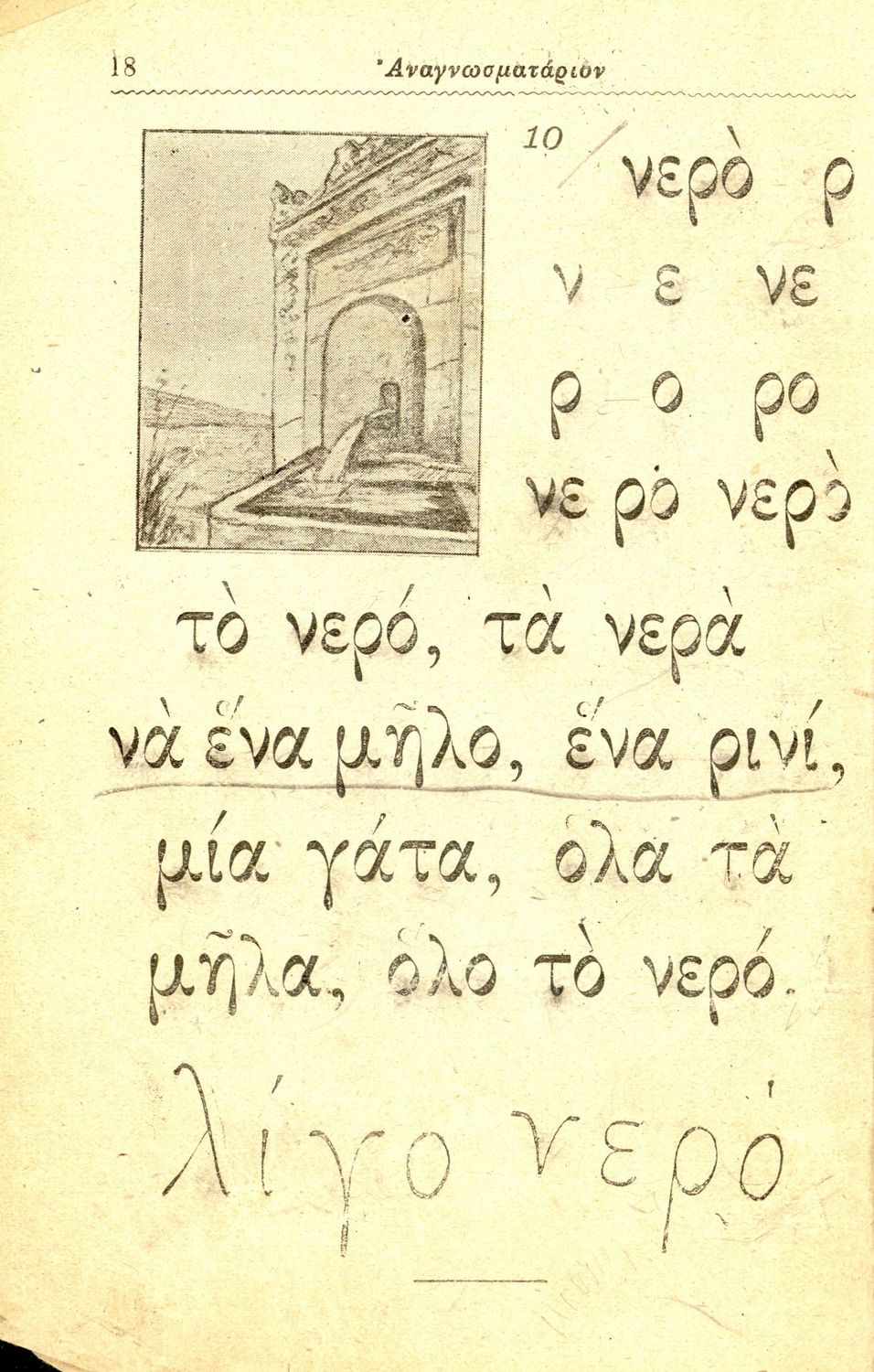 Βαθμίδα εκπαίδευσης: Πρωτοβάθμια Τάξη: Α' Δημοτικού Μάθημα: Νέα Ελληνικά Γλώσσα: Απλή καθαρεύουσα Παρουσίαση περιεχομένου: Αναγνωστικό Α΄ Δημοτικού που περιλαμβάνει εικόνες και γράμματα για την εκμάθηση του ελληνικού αλφάβητου και μικρές ιστορίες με θέματα από την οικογενειακή ζωή, τον κόσμο των ζώων, των φυτών, των εποχών και της θρησκευτικής παράδοσης. |