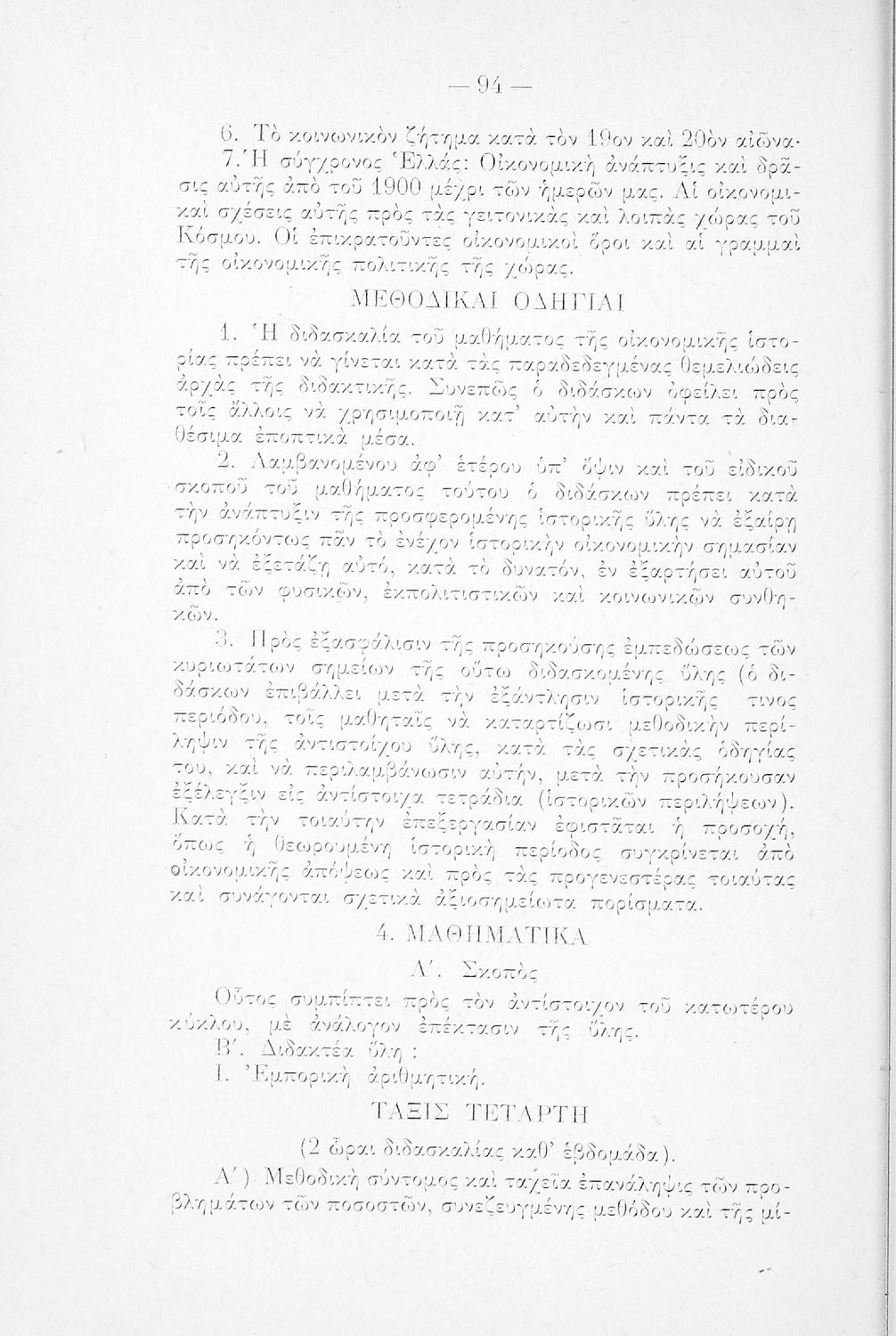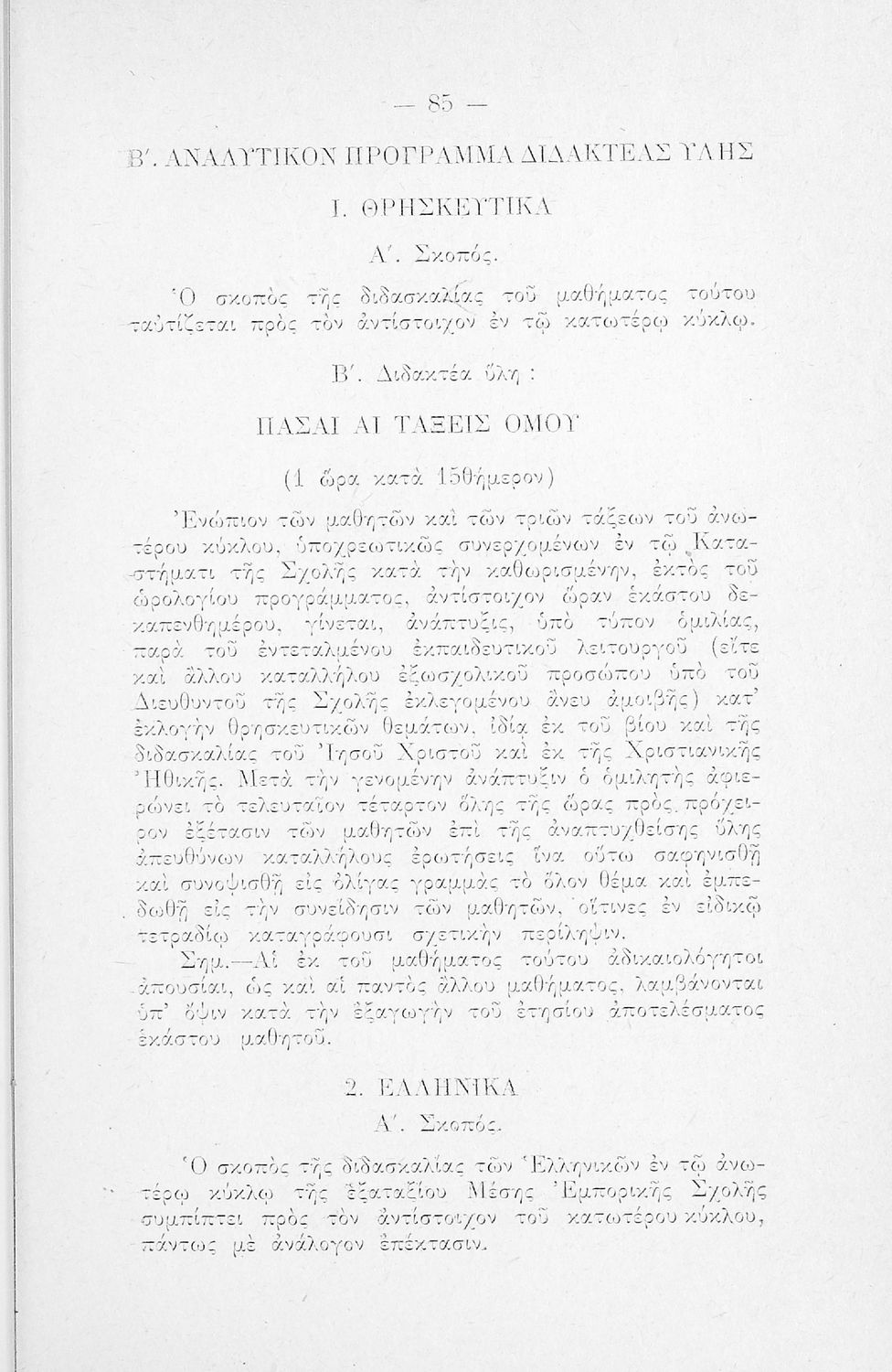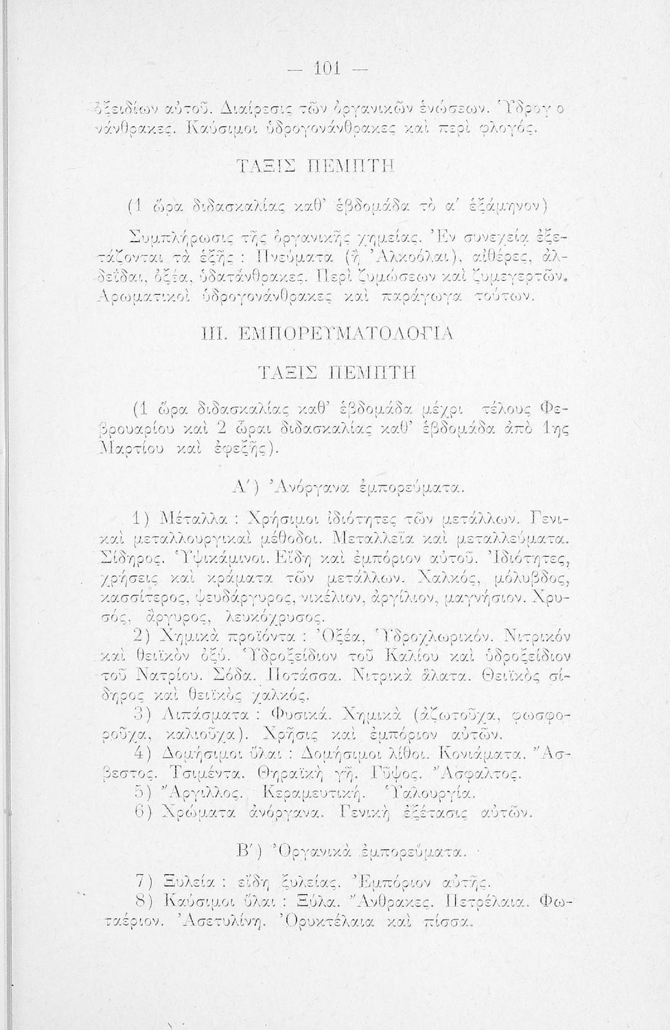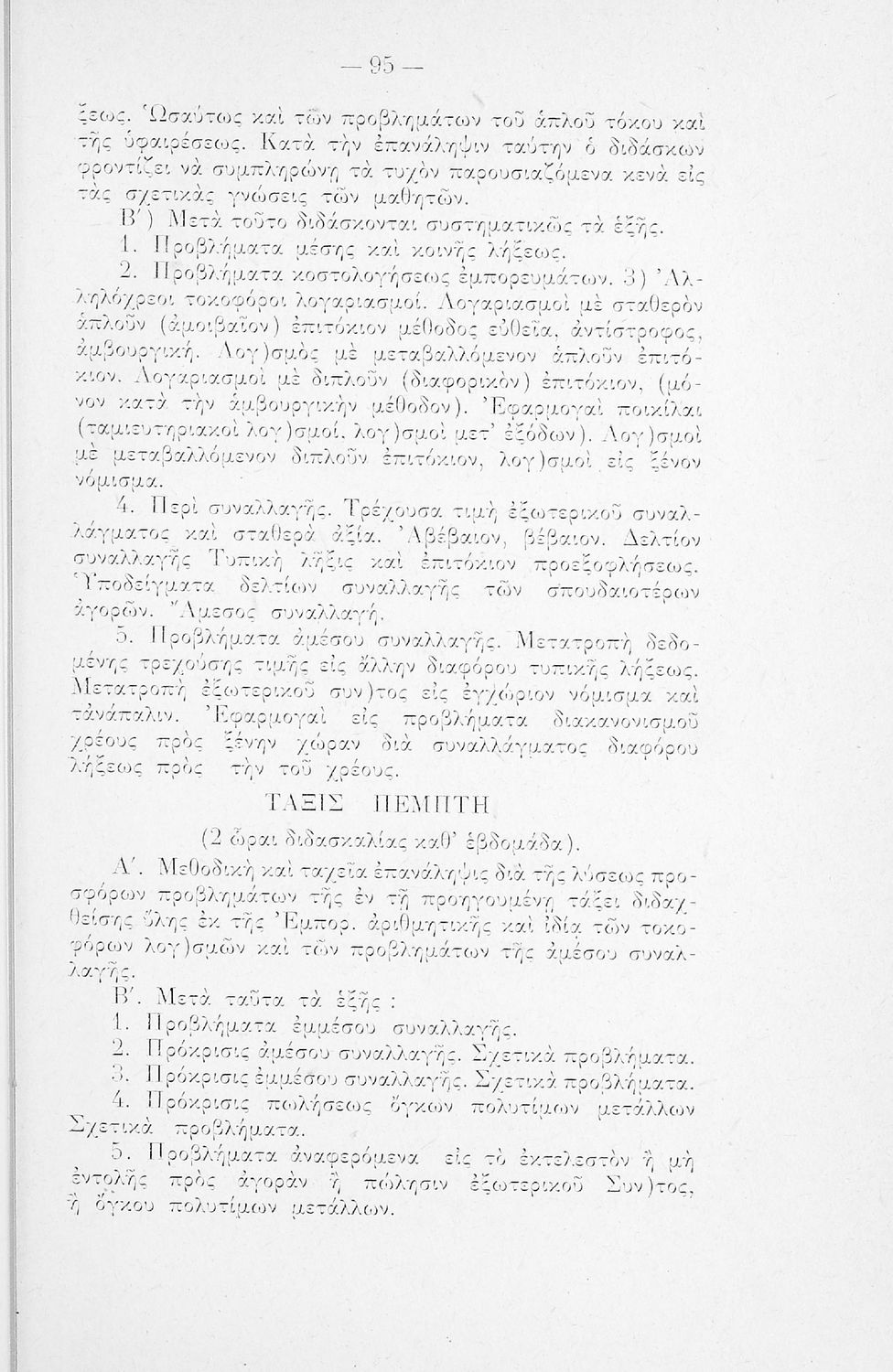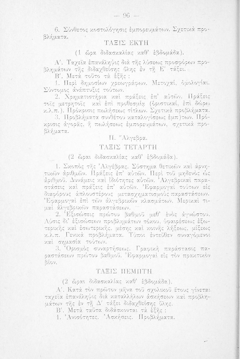 Αναλυτικόν πρόγραμμα των διδασκομένων μαθημάτων εν ταις Μεσαίας Εξαταξίοις Εμπορικαίς Σχολαίς