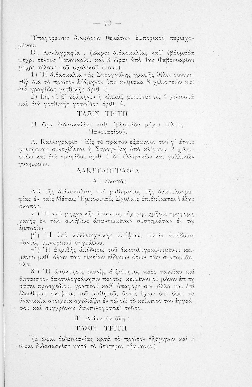 Έκδοση του Υπουργείου Εθνικής Οικονομίας που περιλαμβάνει το αναλυτικό πρόγραμμα των μαθημάτων που διδάσκονταν στις μεσαίες τάξεις των εμπορικών σχολών.