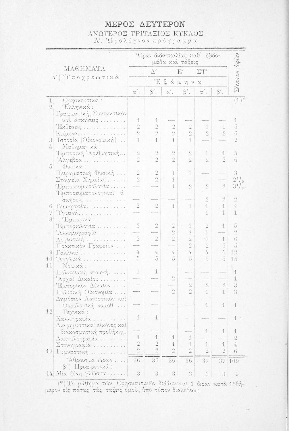 Έκδοση του Υπουργείου Παιδείας και Θρησκευμάτων που περιλαμβάνει τα ωρολόγια και αναλυτικά προγράμματα των μαθημάτων που διδάσκονται στις Εμπορικές Σχολές.