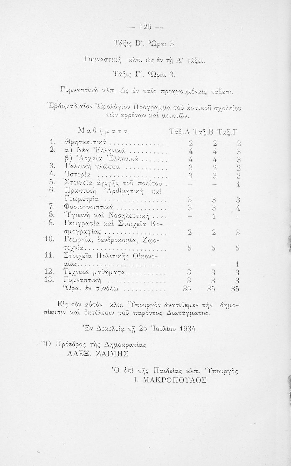 Αναλυτικό πρόγραμμα το οποίο είναι ανατύπωση σχετικών διαταγμάτων για εξατάξια γυμνάσια, πρακτικά Λύκεια, Ανώτερα Παρθεναγωγεία και τριτάξιες Αστικές Σχολές. Έχει την υπογραφή του τότε Υφυπουργού Ν. Σπέντζα.