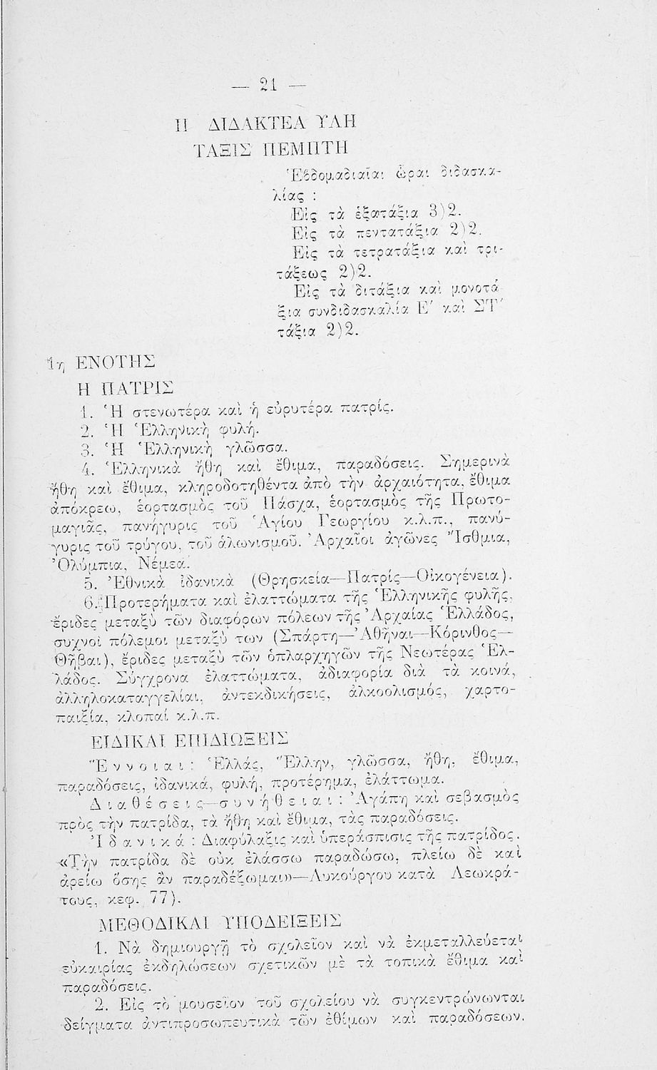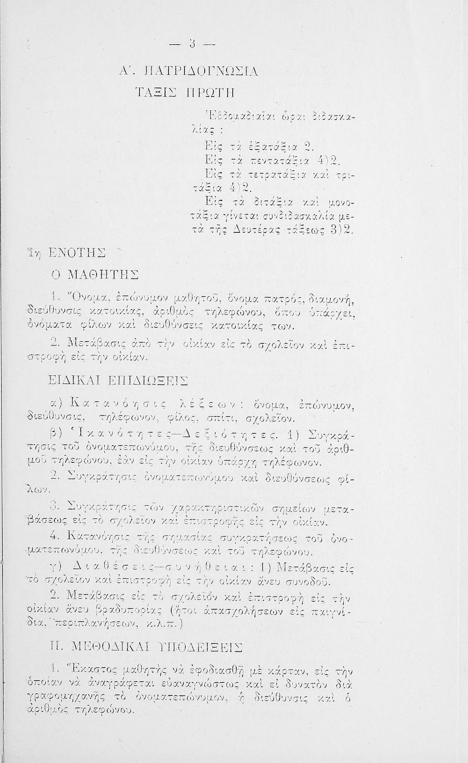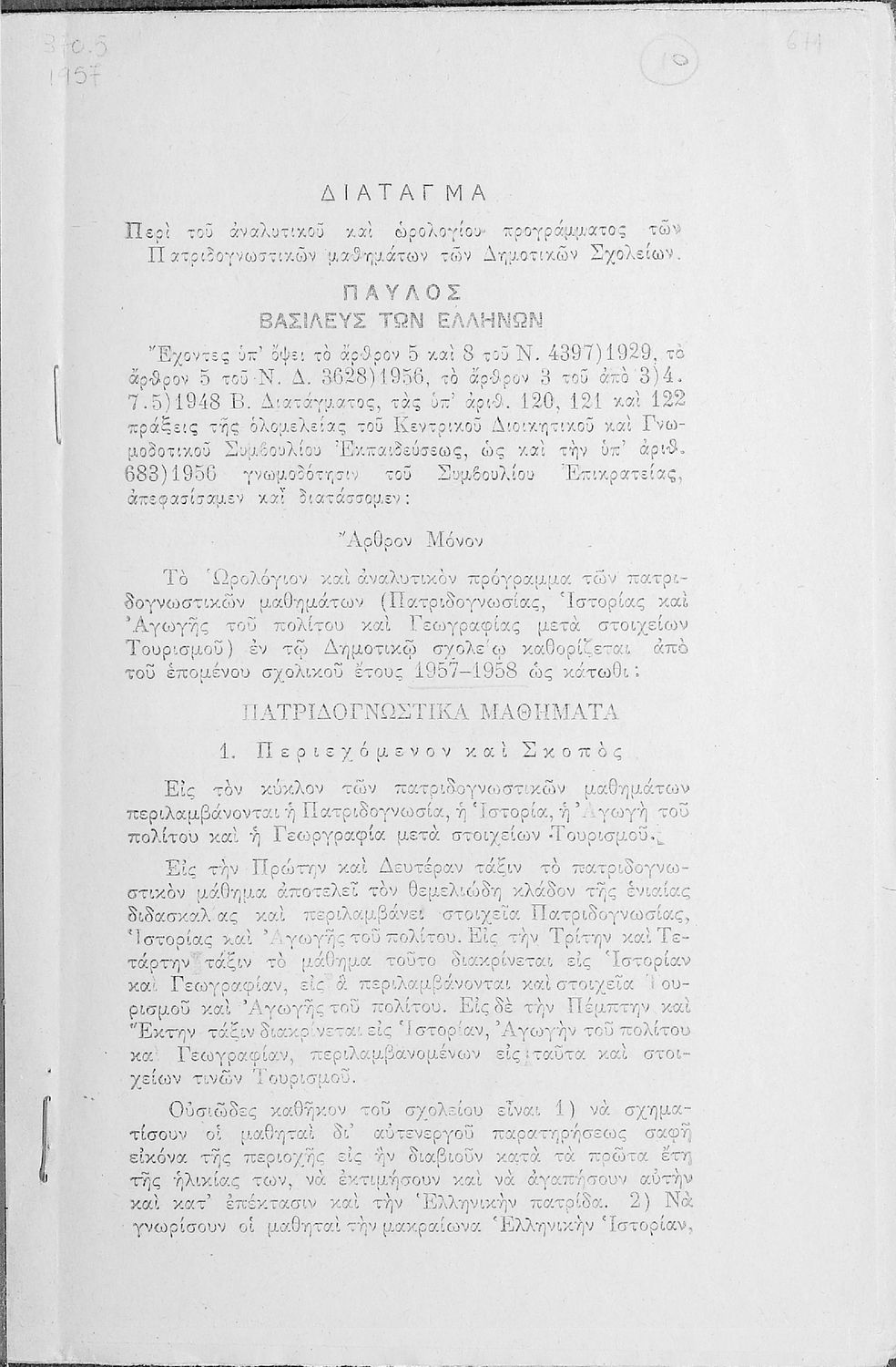 Τίτλος: Περί του αναλυτικού και ωρολογίου προγράμματος των Πατριδογνωστικών μαθημάτων των Δημοτικών Σχολείων