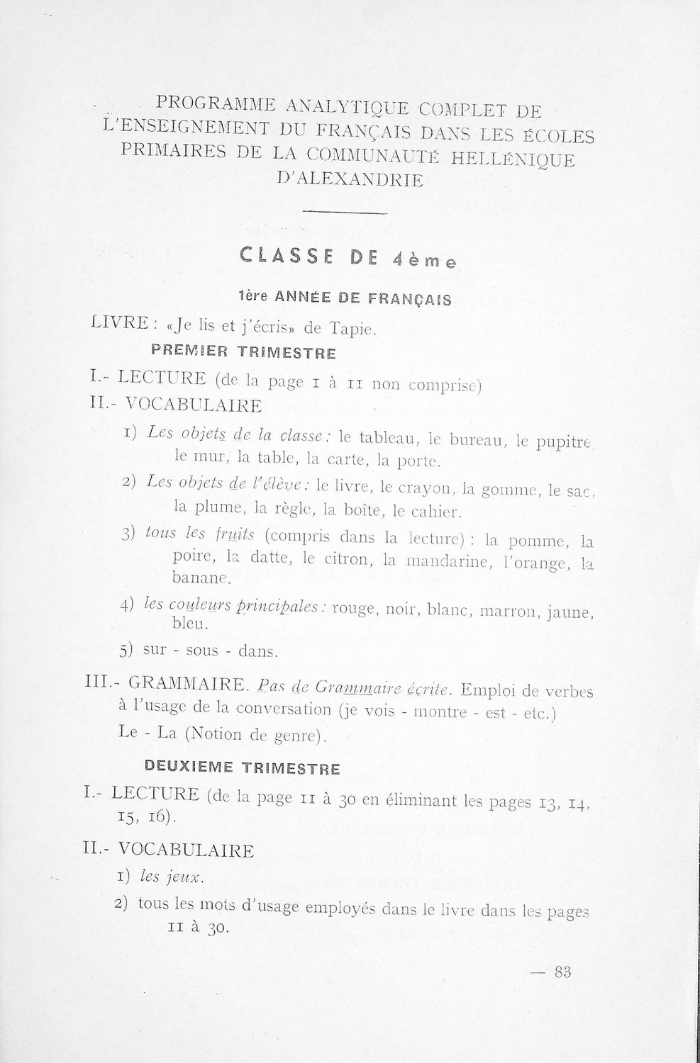 Έκδοση της Ελληνικής Κοινότητας Αλεξάνδρειας που περιλαμβάνει οδηγίες για το αναλυτικό πρόγραμμα σπουδών για τα ελληνικά μαθήματα του Δημοτικού Σχολείου και τις ξένες γλώσσες (Αγγλικά, Γαλλικά) για το Γυμνάσιο.