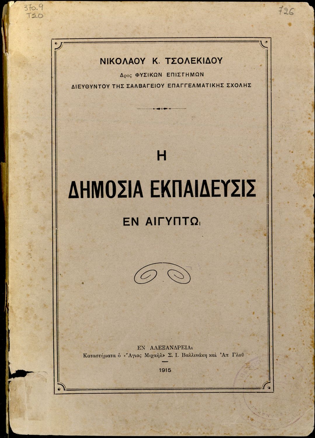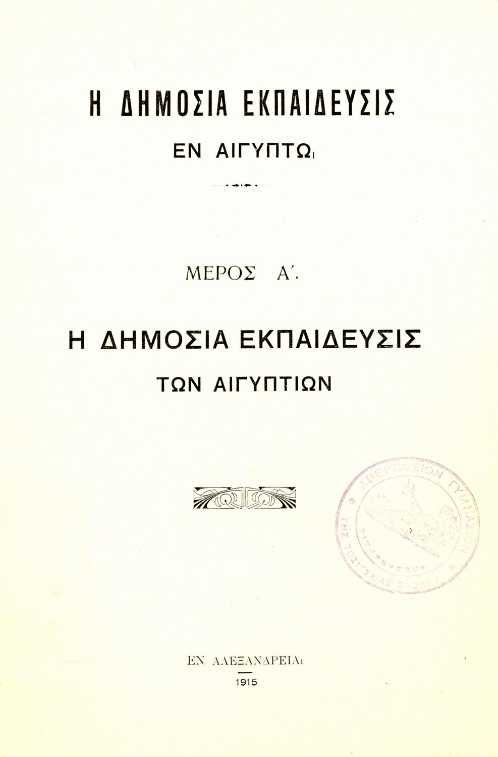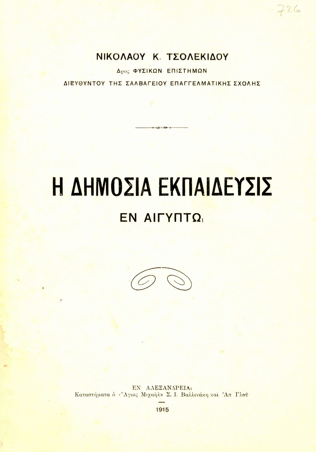 Εκδότης: Σ. Ι. Βαλλινάκης και Απ. Γλους Έτος έκδοσης: 1915 Τόπος έκδοσης: Αλεξάνδρεια |