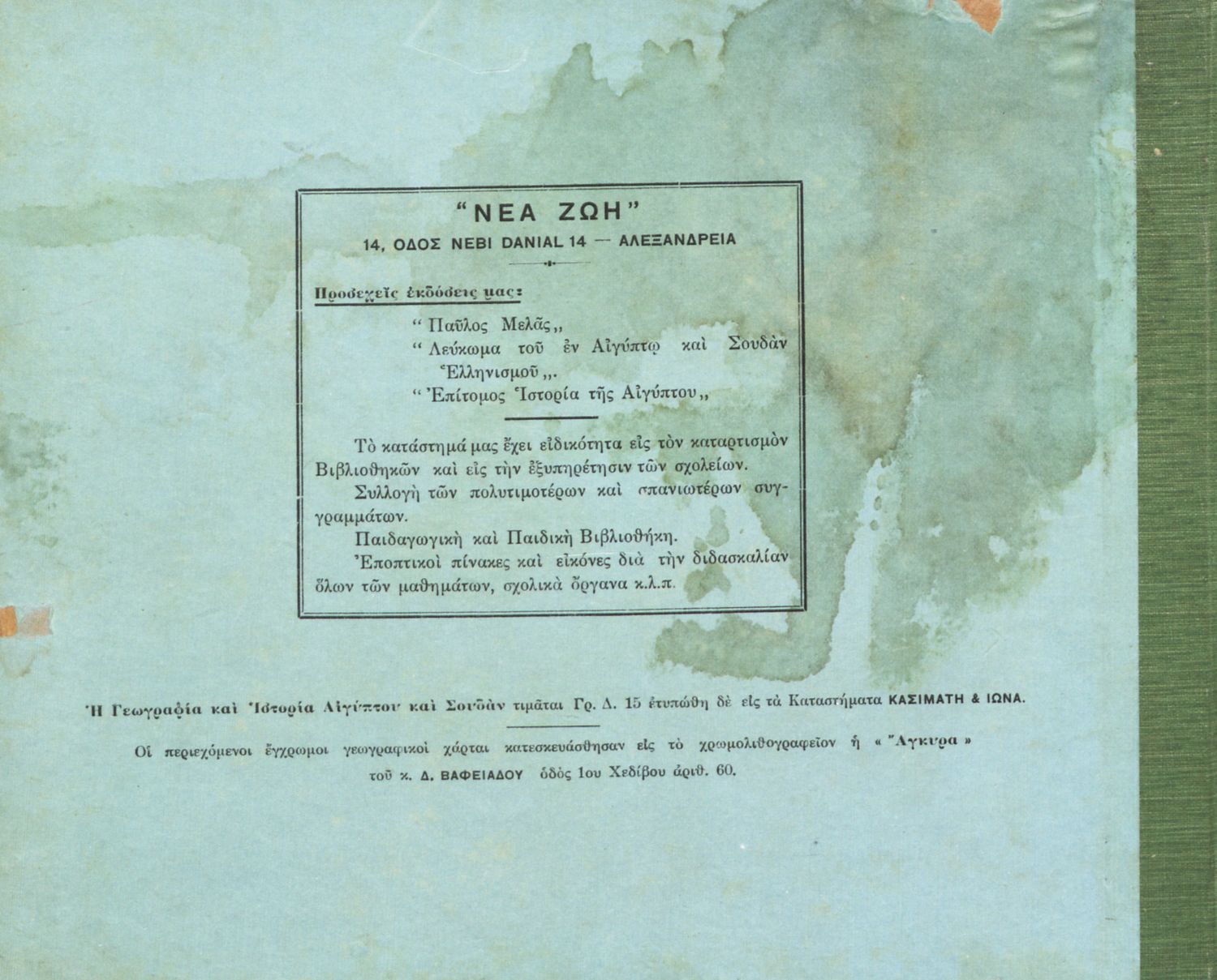 Κωδικός αναγνώρισης: 20-00727 Τίτλος: Γεωγραφία και Ιστορία Αιγύπτου και Σουδάν Συγγραφέας: Α. Α. Μαρσέλος Μέγεθος και υπόστρωμα: Σχολικό εγχειρίδιο, 23εκ., σκληρό εξώφυλλο, 110 σελίδες. Σκίτσα (ασπρόμαυρα), χάρτες (έγχρωμοι). |