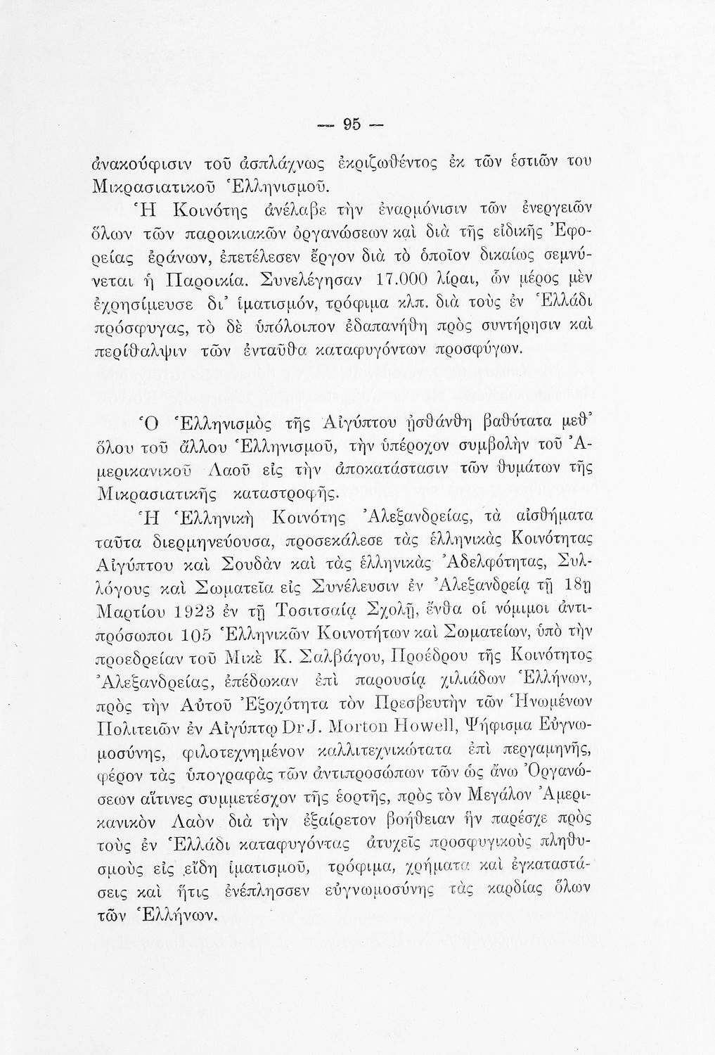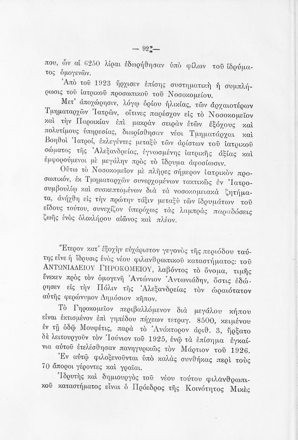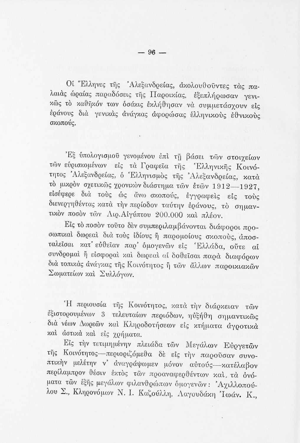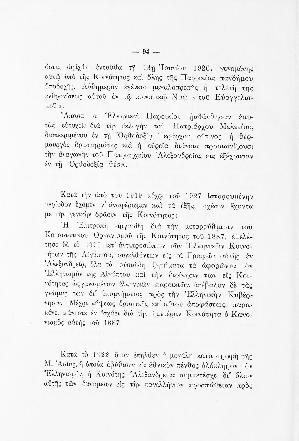 Επιστημονικό σύγγραμμα που πραγματεύεται την ιστορία της ελληνικής κοινότητας της Αλεξάνδρειας από το 1830 έως το 1927. Περιέχει και στοιχεία για τις υποδομές της κοινότητας όπως γραφεία, βιβλιοθήκες και σχολεία κατά το 1927-8.
