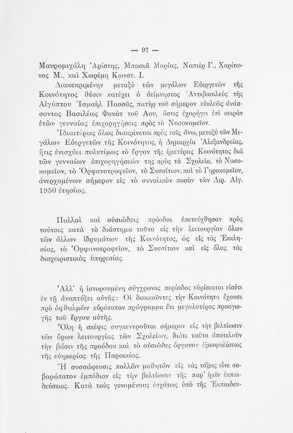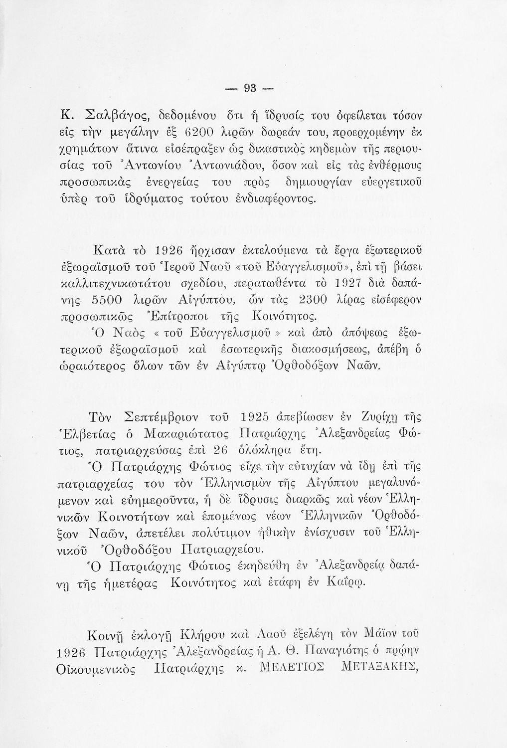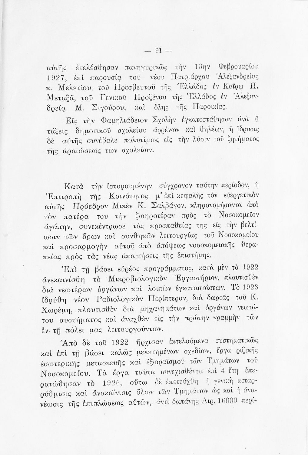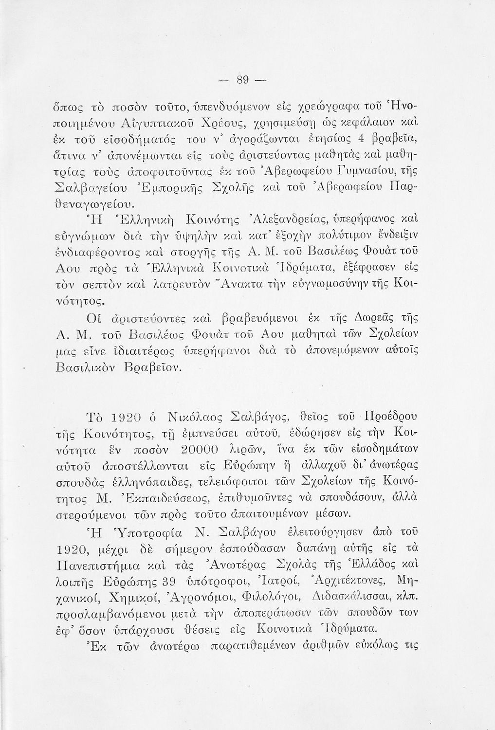 Επιστημονικό σύγγραμμα που πραγματεύεται την ιστορία της ελληνικής κοινότητας της Αλεξάνδρειας από το 1830 έως το 1927. Περιέχει και στοιχεία για τις υποδομές της κοινότητας όπως γραφεία, βιβλιοθήκες και σχολεία κατά το 1927-8.