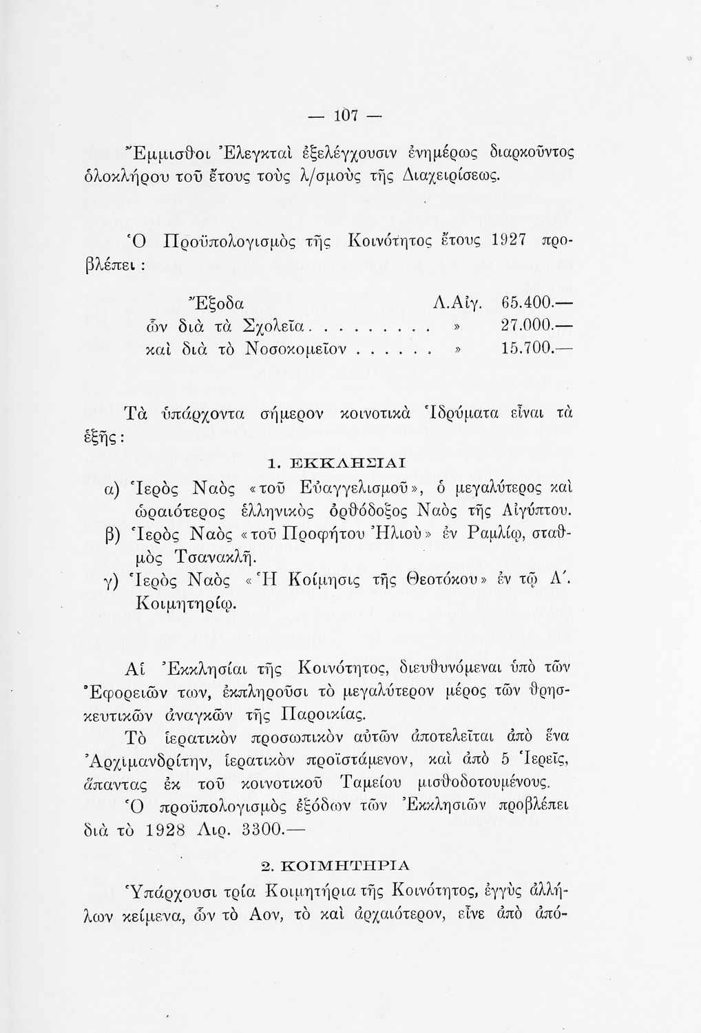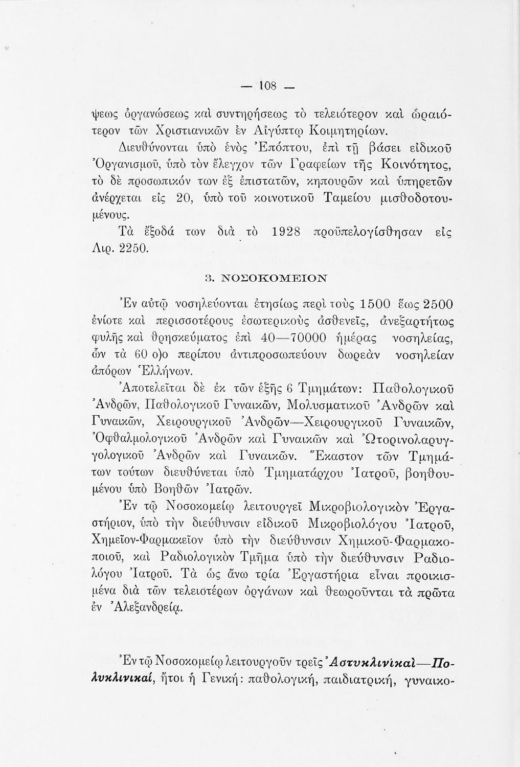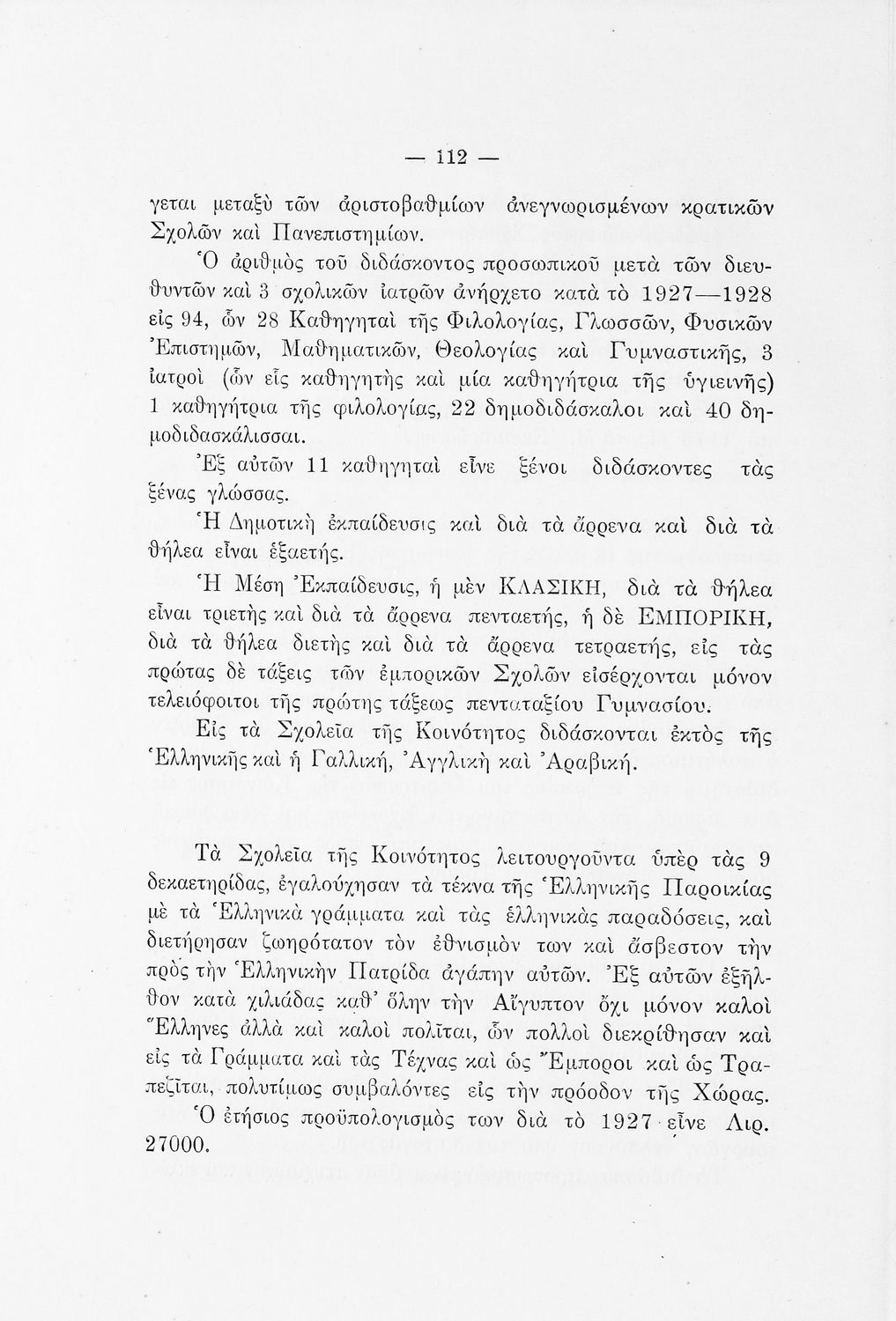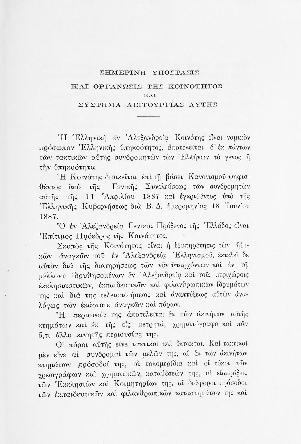 Επιστημονικό σύγγραμμα που πραγματεύεται την ιστορία της ελληνικής κοινότητας της Αλεξάνδρειας από το 1830 έως το 1927. Περιέχει και στοιχεία για τις υποδομές της κοινότητας όπως γραφεία, βιβλιοθήκες και σχολεία κατά το 1927-8.