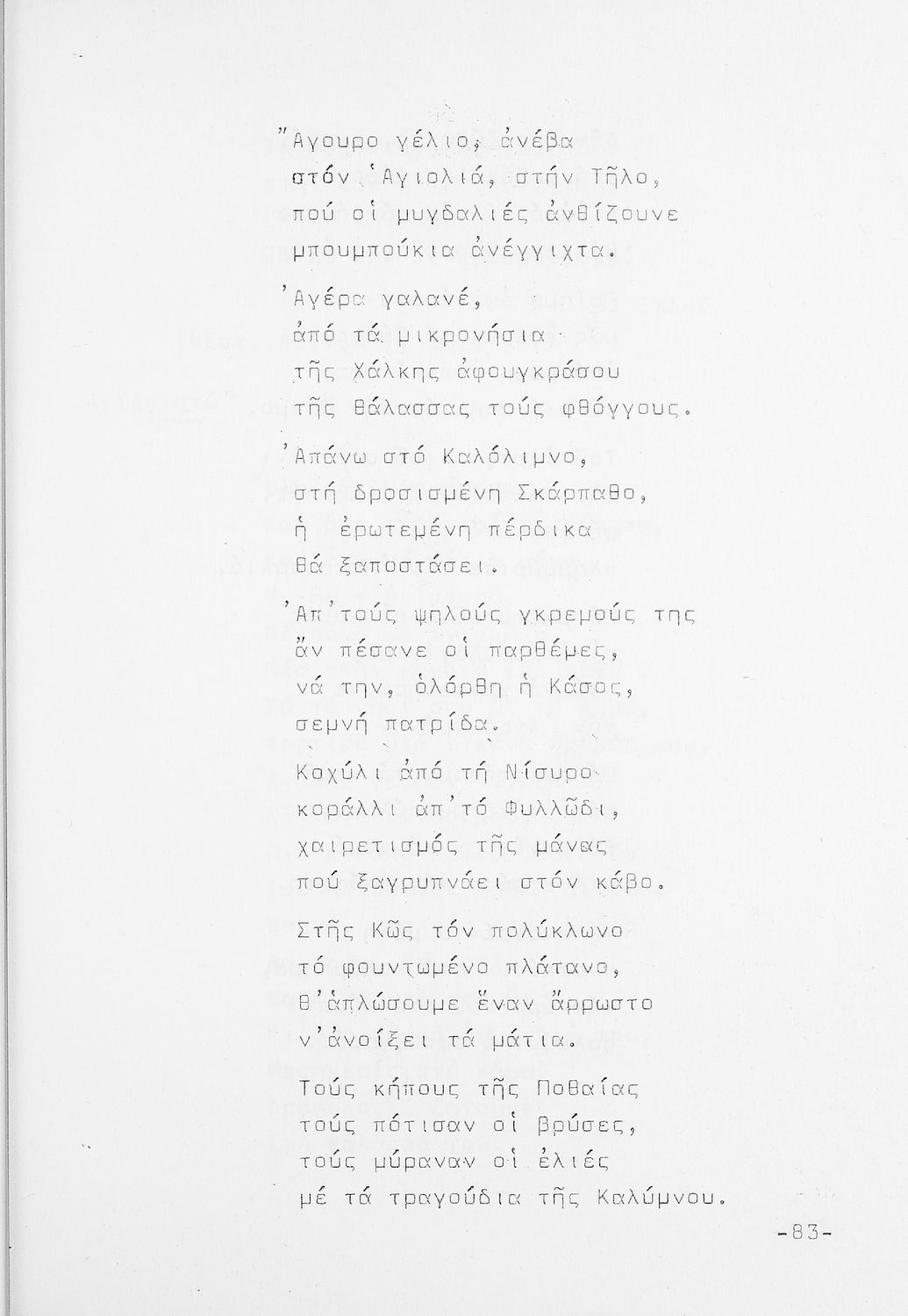 Παιδαγωγικό βοήθημα Νέων Ελληνικών Α΄ Γυμνασίου που περιέχει πεζά και ποιήματα Ελλήνων και ξένων συγγραφέων εμπνευσμένα από την σύγχρονη ελληνική και ευρωπαϊκή ιστορία, τη θρησκευτική παράδοση και την ελληνική φύση. Περιέχει ερμηνευτικές και πραγματολογικές σημειώσεις και λεξιλόγιο.
