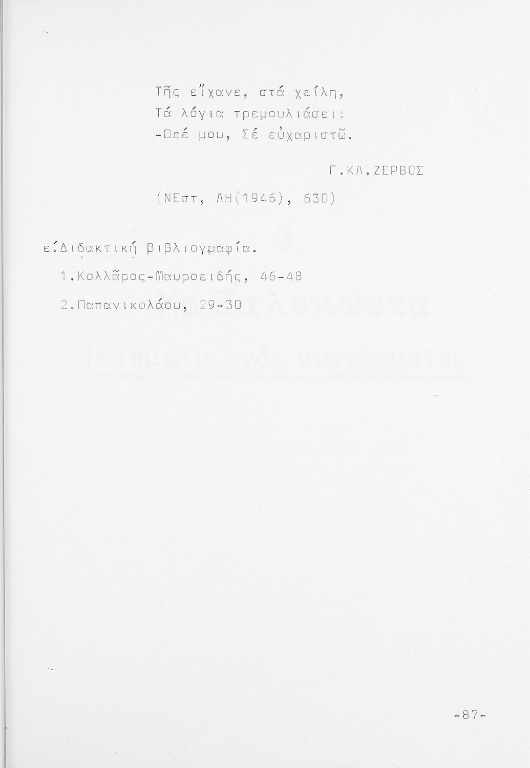 Σχολικό εγχειρίδιο Νέων Ελληνικών Γ΄ Γυμνασίου και Α' Αστικού Σχολείου που περιέχει πεζά και ποιήματα Ελλήνων συγγραφέων εμπνευσμένα από τη θρησκευτική και κοινωνική ζωή, την ελληνική μυθολογία, την αρχαία και