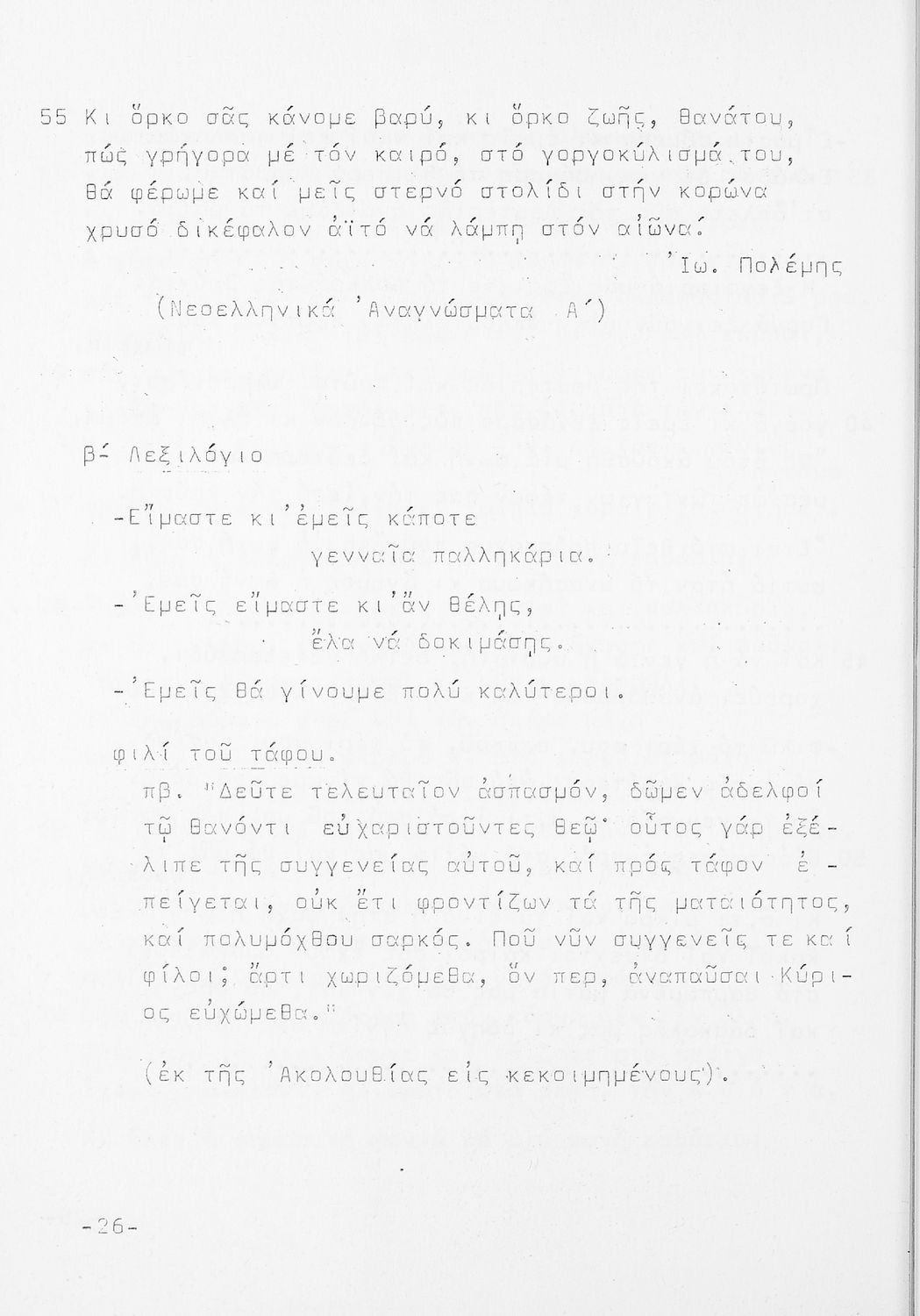 Σχολικό εγχειρίδιο Νέων Ελληνικών Γ΄ Γυμνασίου και Α' Αστικού Σχολείου που περιέχει πεζά και ποιήματα Ελλήνων συγγραφέων εμπνευσμένα από τη θρησκευτική και κοινωνική ζωή, την ελληνική μυθολογία, την αρχαία και